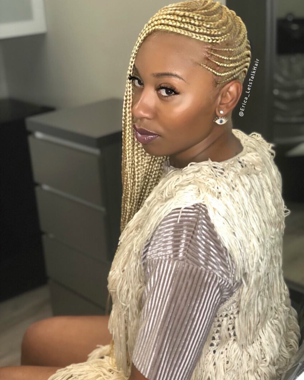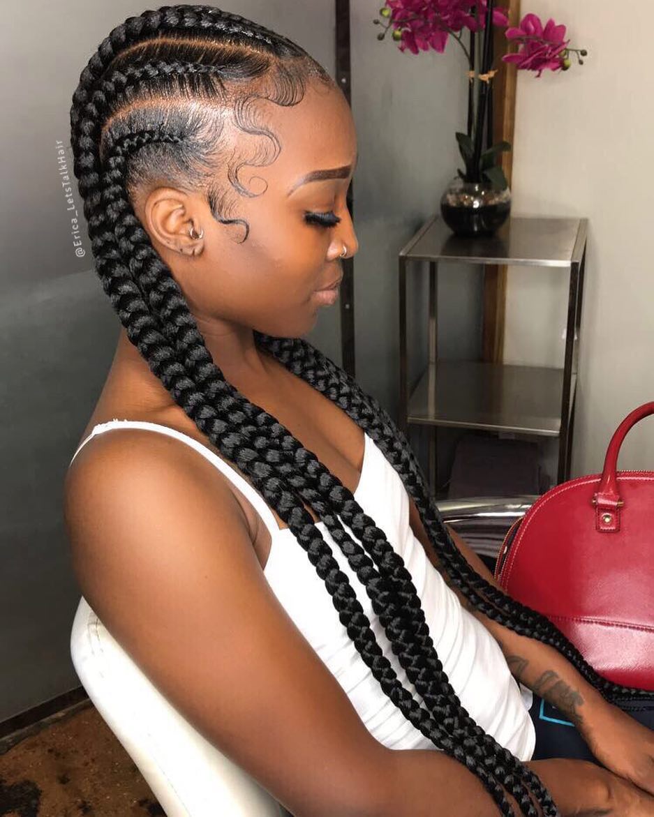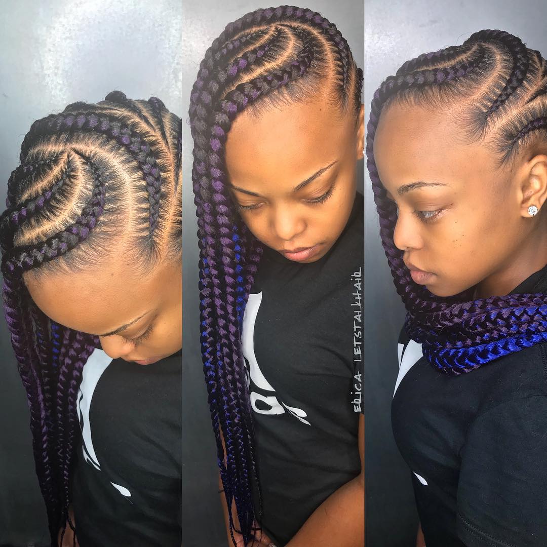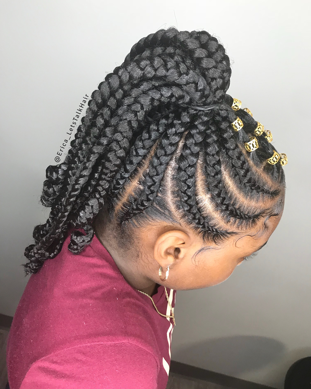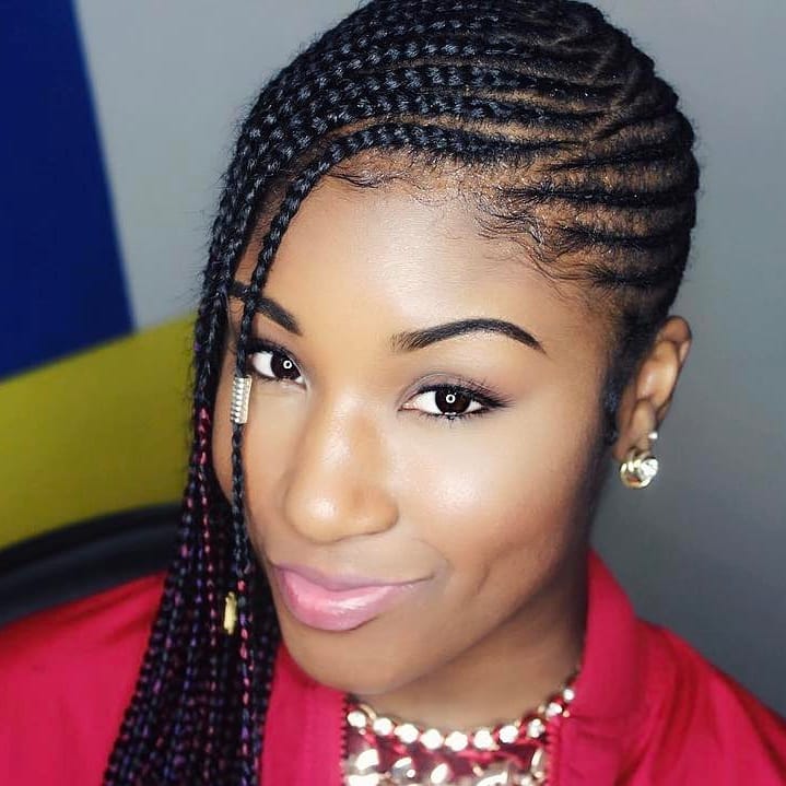 Instead of the usual straight-back style, direct the braids to one side of the head, culminating in a side-swept look. It’s a touch of modern to the classic style.