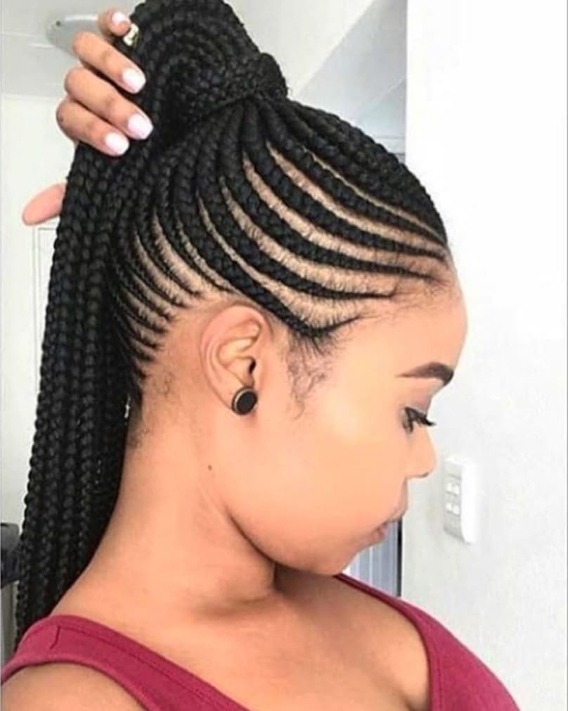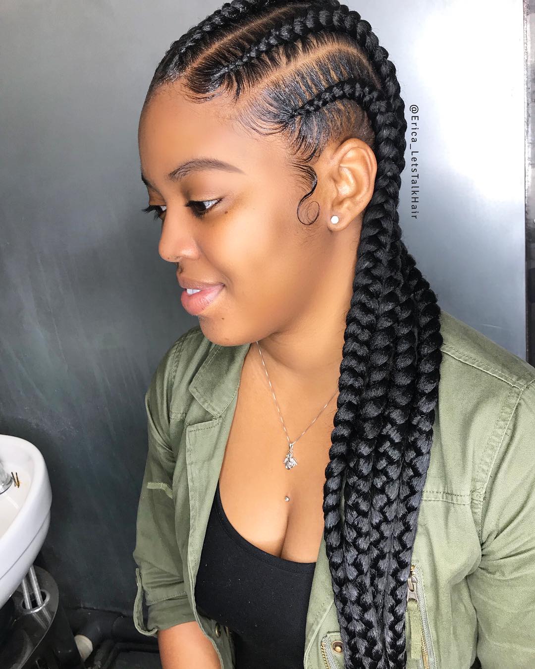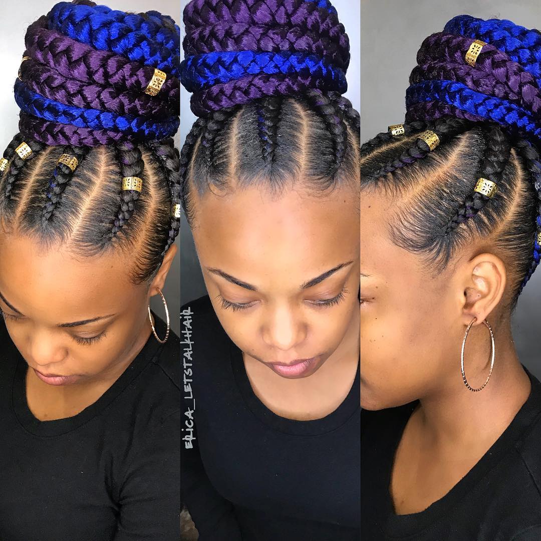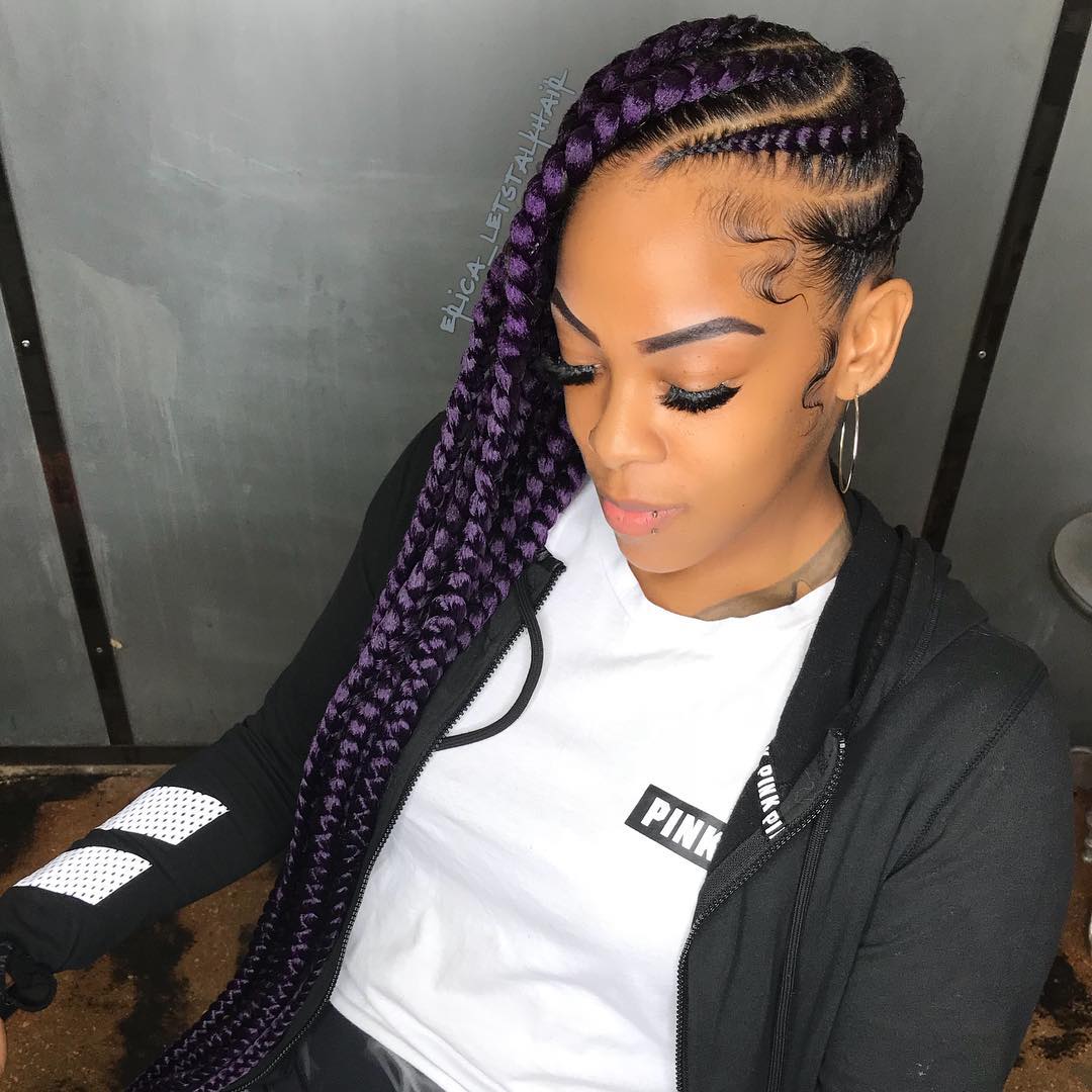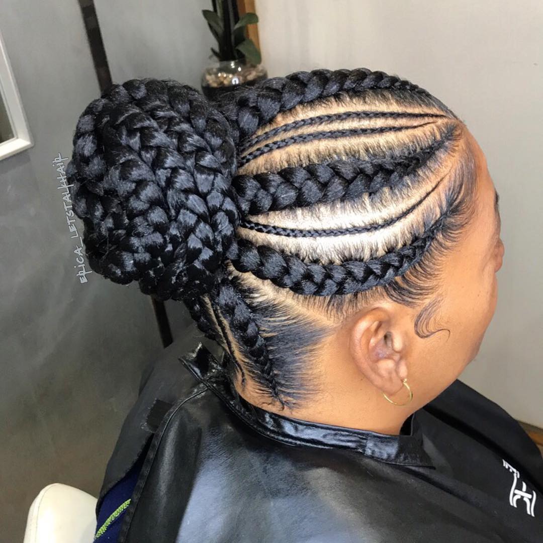 Instead of the usual straight-back style, direct the braids to one side of the head, culminating in a side-swept look. It’s a touch of modern to the classic style.
