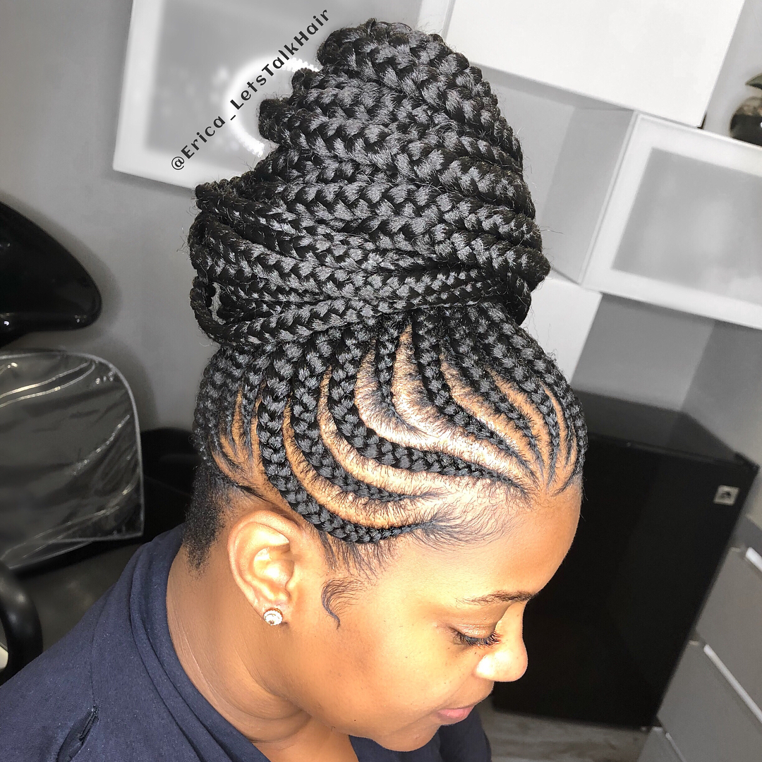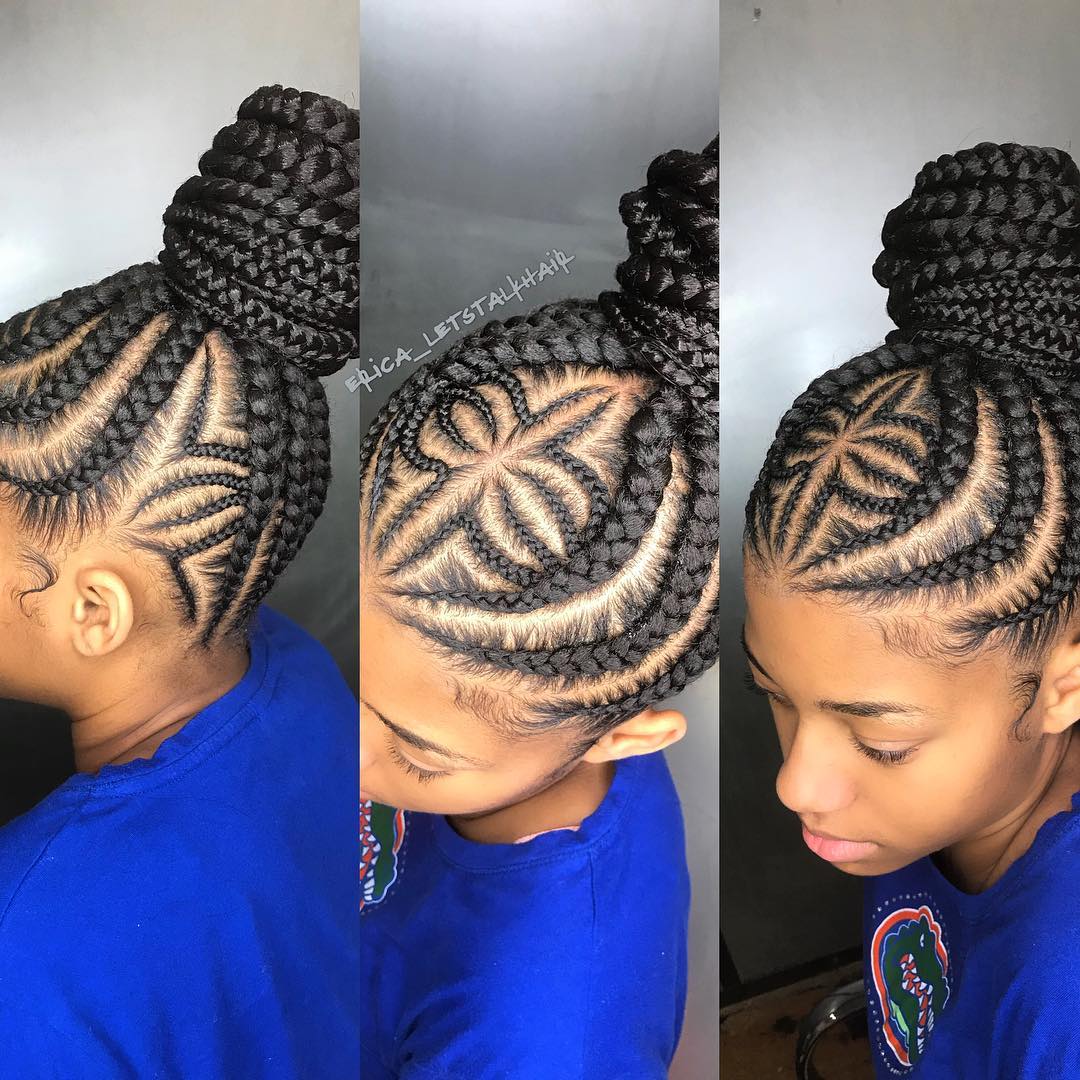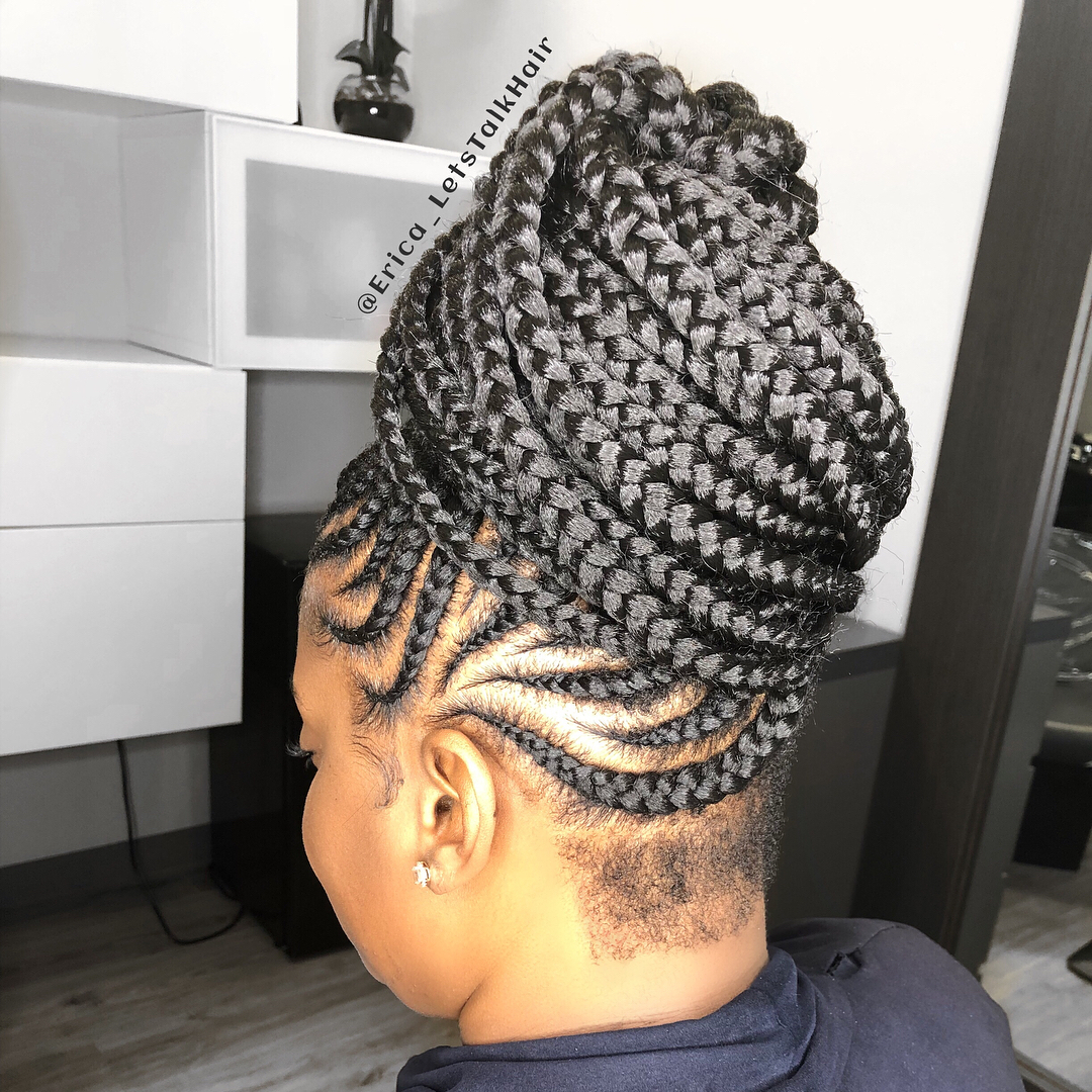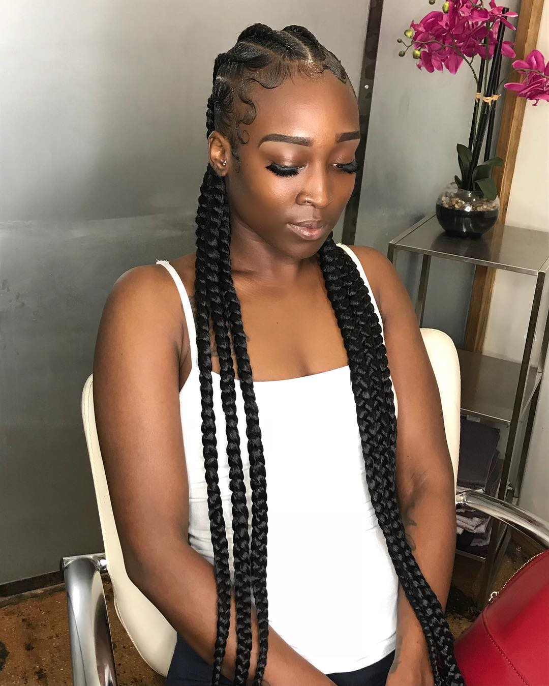 Instead of the usual straight-back style, direct the braids to one side of the head, culminating in a side-swept look. It’s a touch of modern to the classic style.