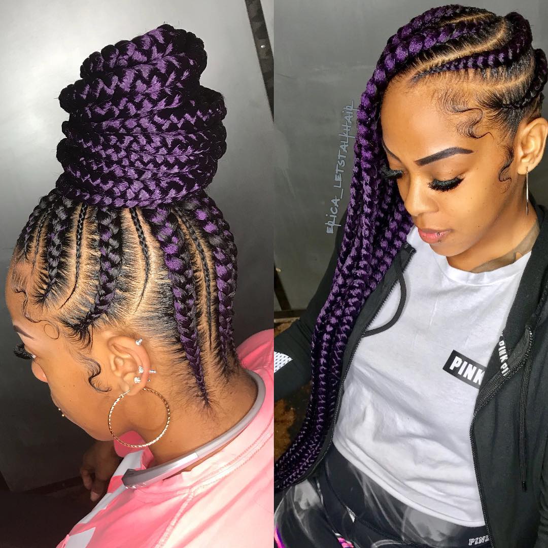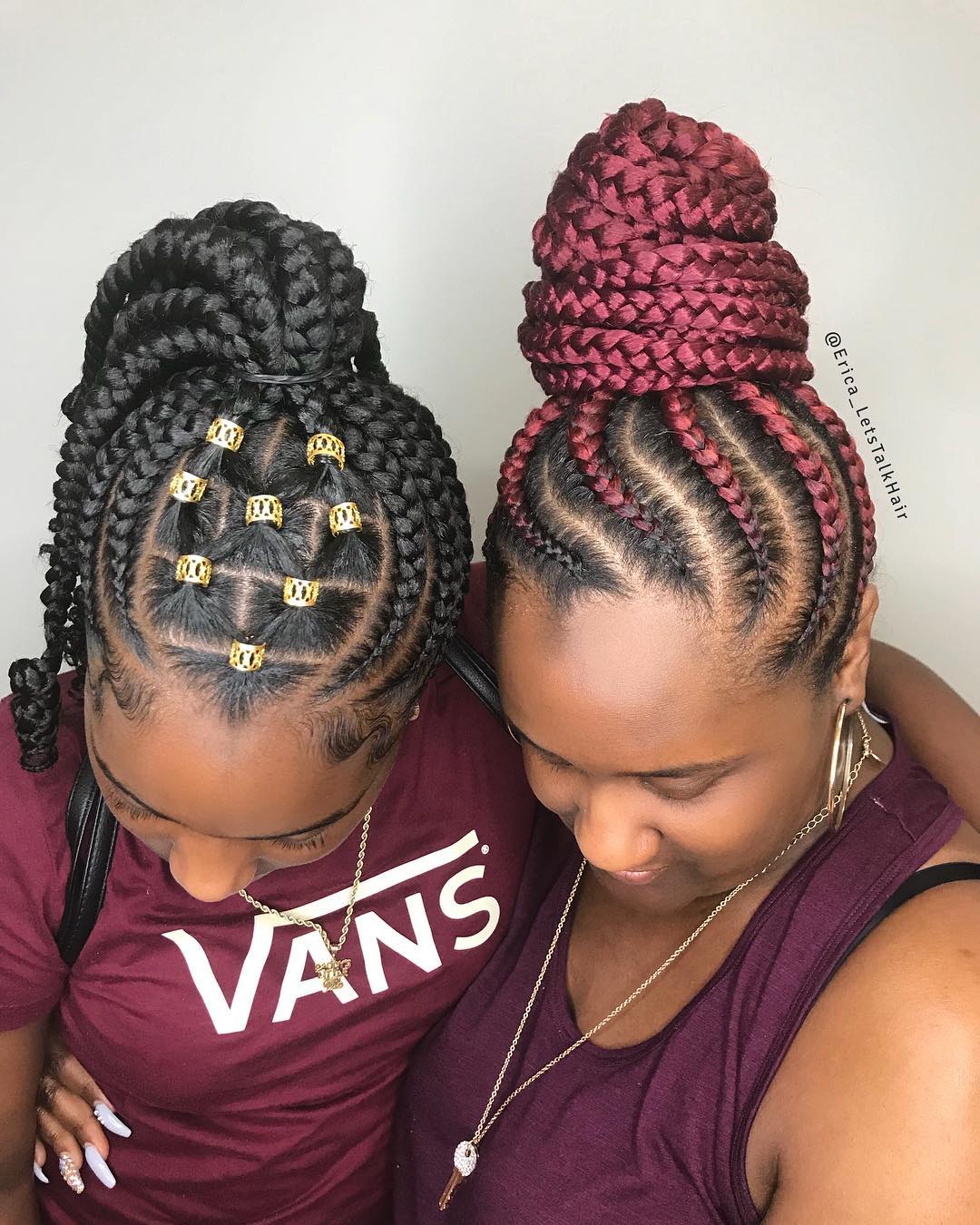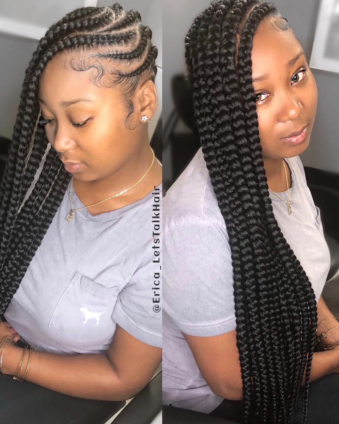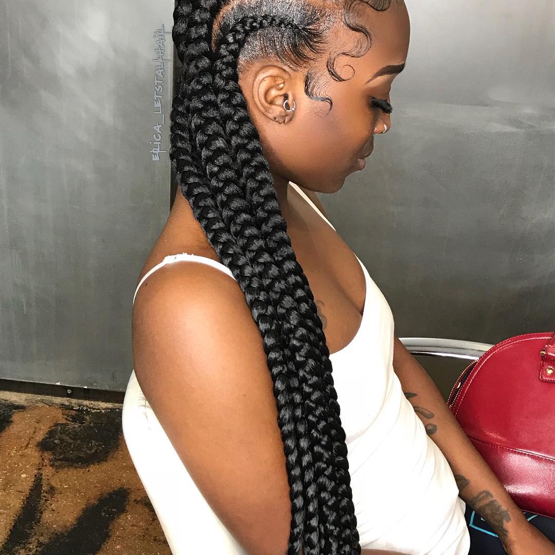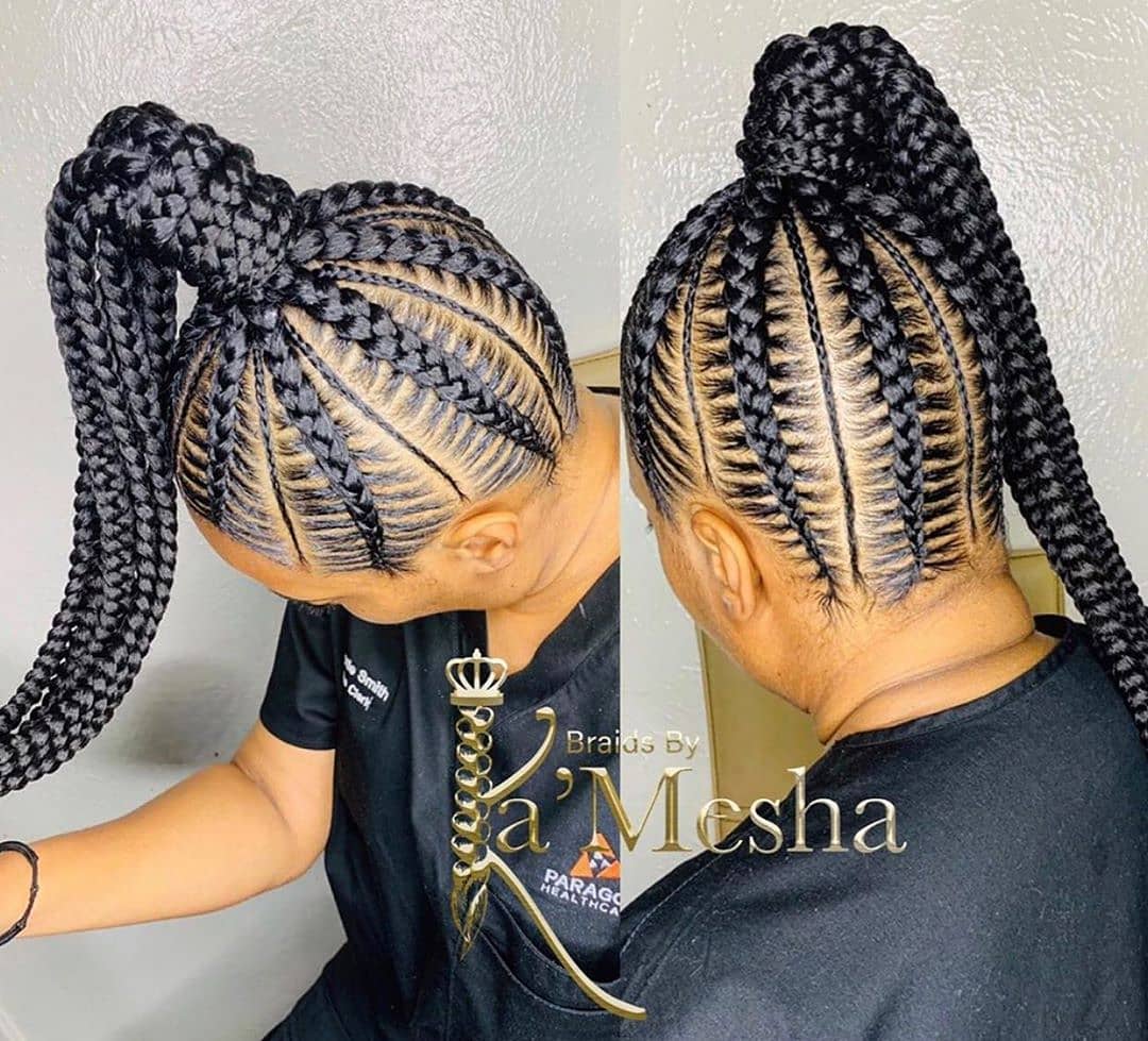 Instead of the usual straight-back style, direct the braids to one side of the head, culminating in a side-swept look. It’s a touch of modern to the classic style.