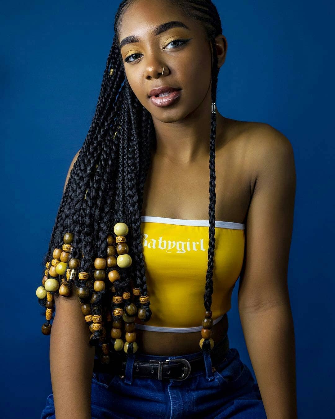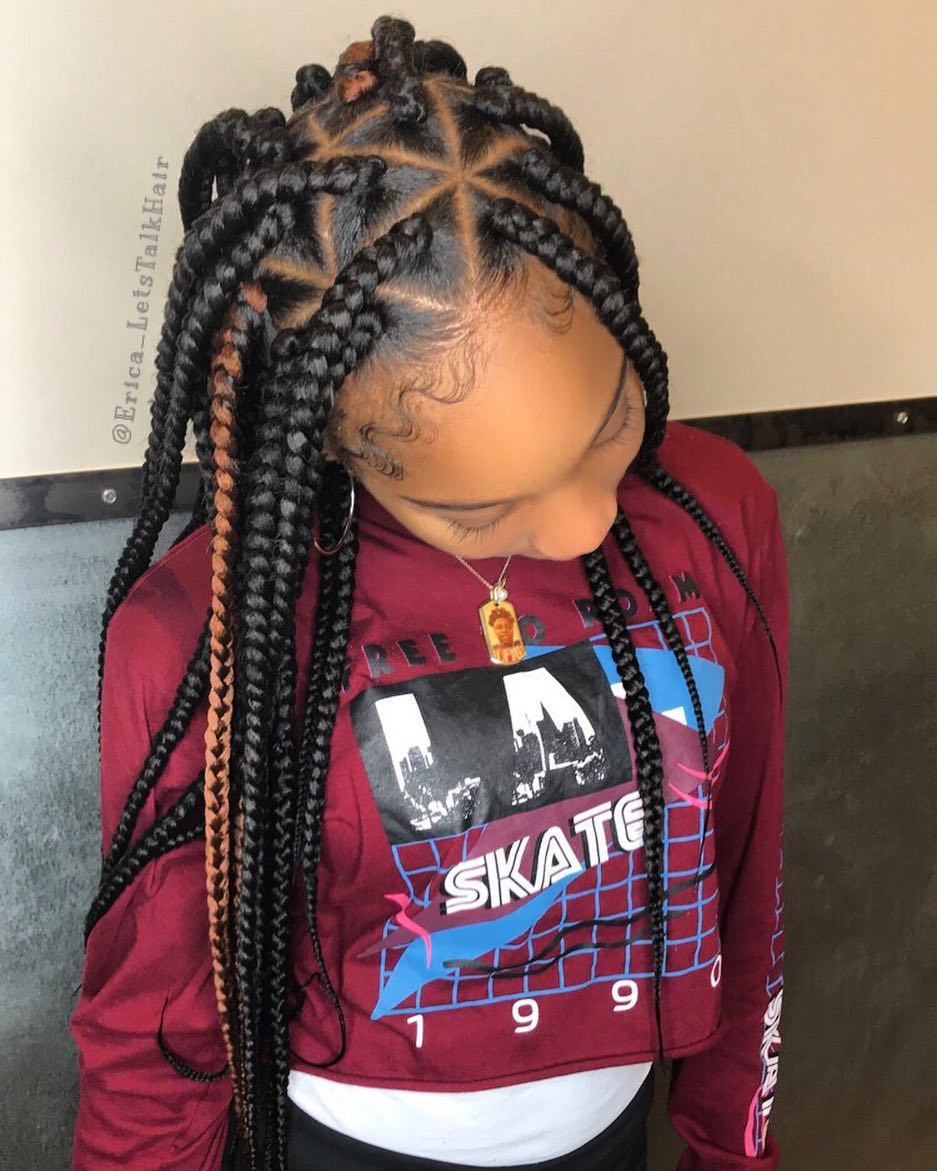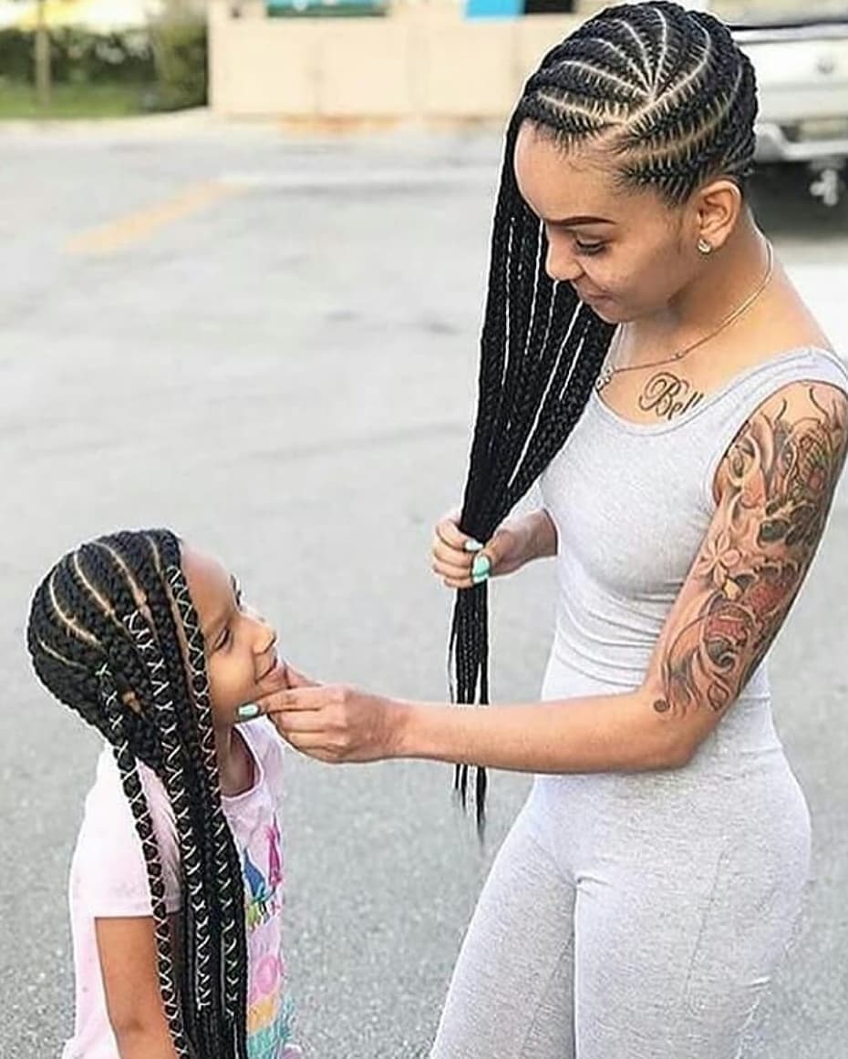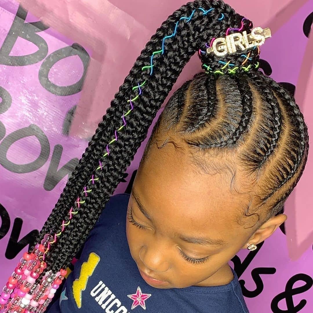 Add some colored extensions to the braids. It could be her favorite color or even multiple colors for a rainbow effect. It’s a fun way to express personality and stand out.