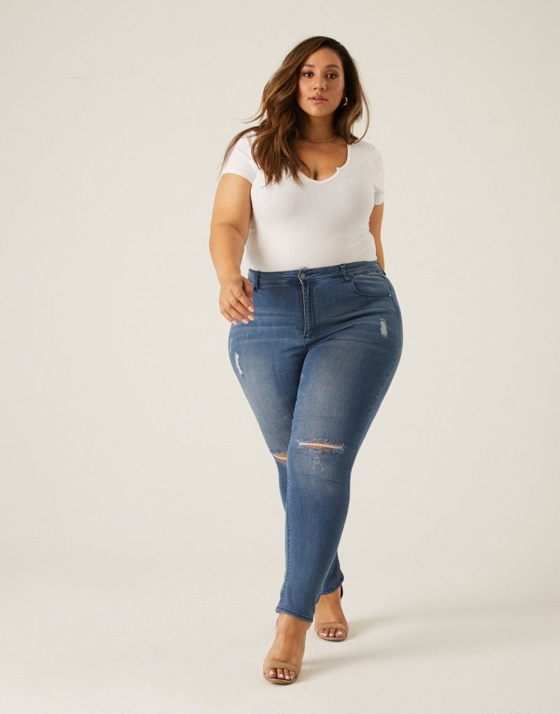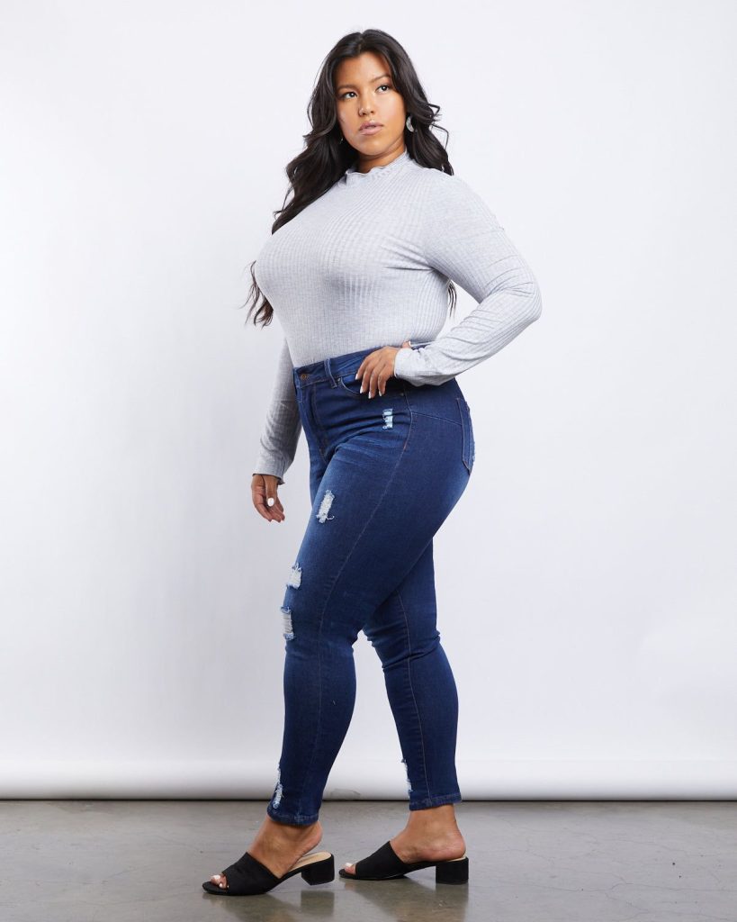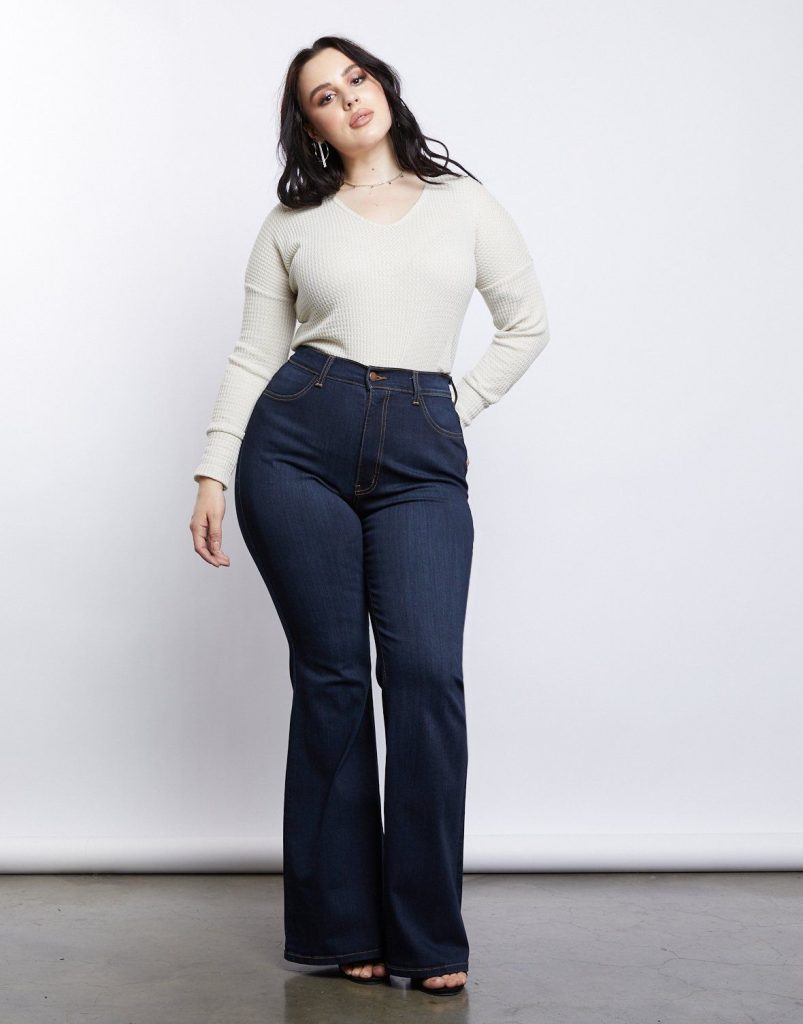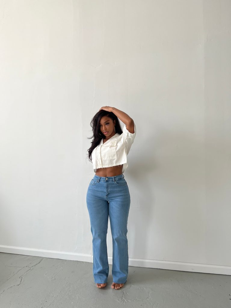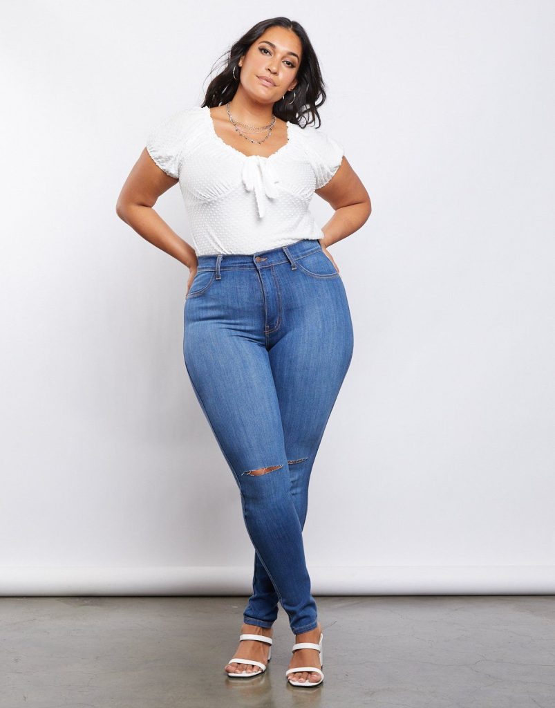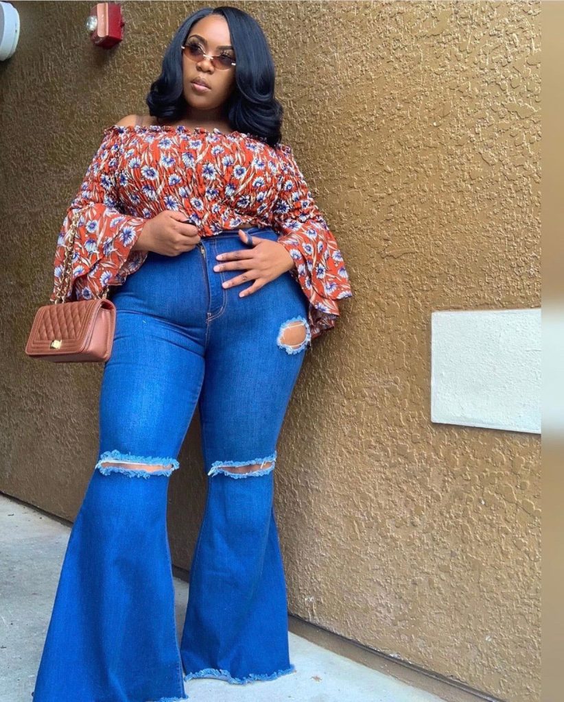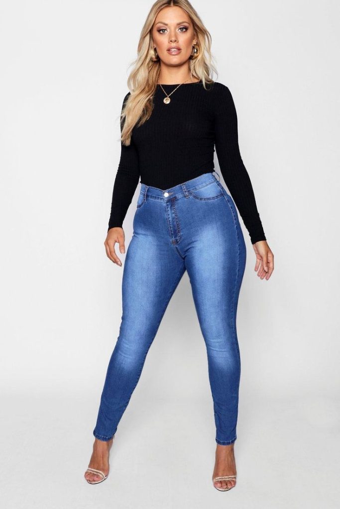 Embrace your curves with a pair of high-waisted jeans that cinch in at the waist and accentuate your figure. Pair them with a trendy crop top for a modern and fashionable look. This outfit is perfect for a summer day out or a date night. Add some heels and a statement clutch to elevate the outfit.