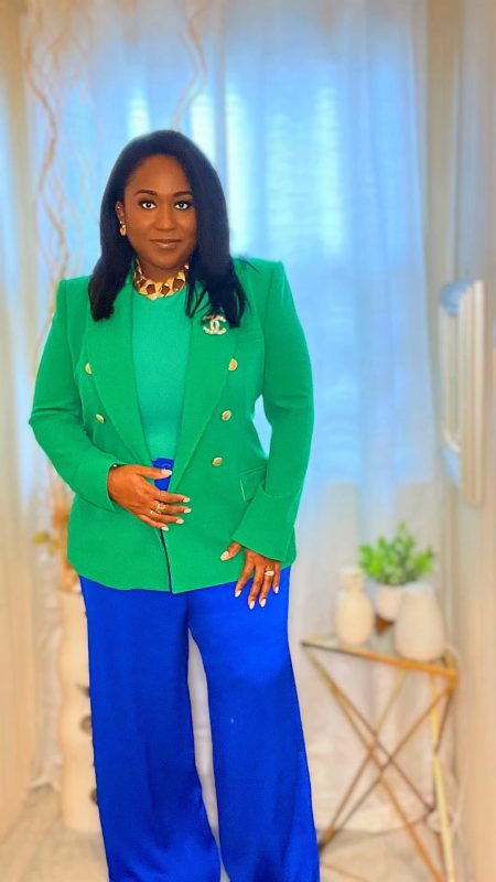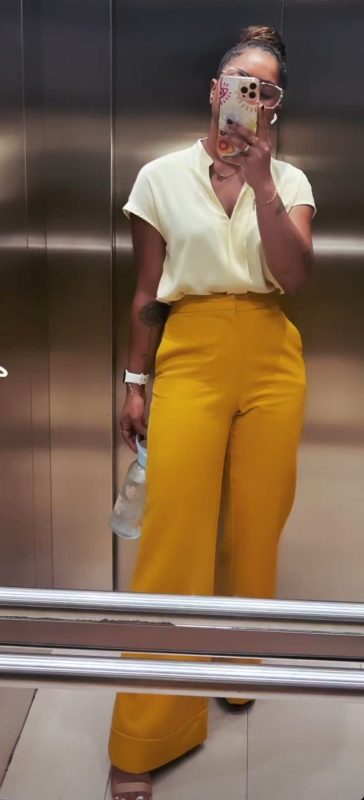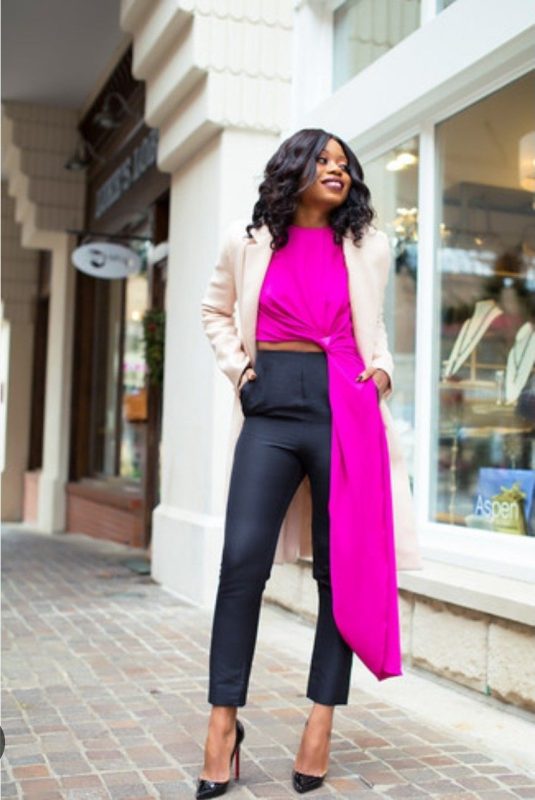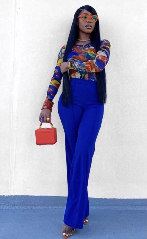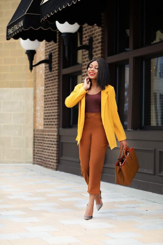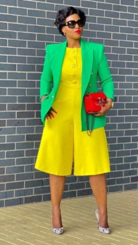 7. Color-Blocked Ensemble: Experiment with color blocking by pairing two or more bold and complementary colors together. For example, pair a cobalt blue blouse with a fuchsia skirt or combine a yellow blazer with a teal blouse and gray pants.