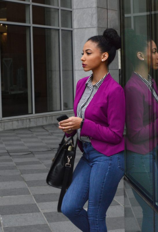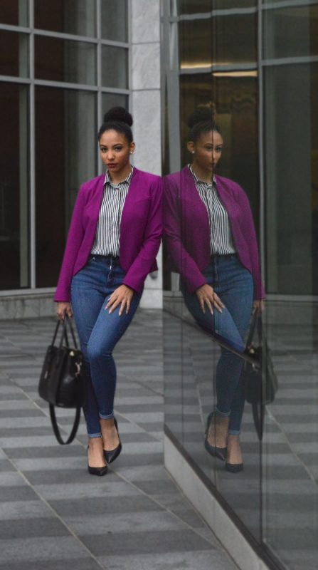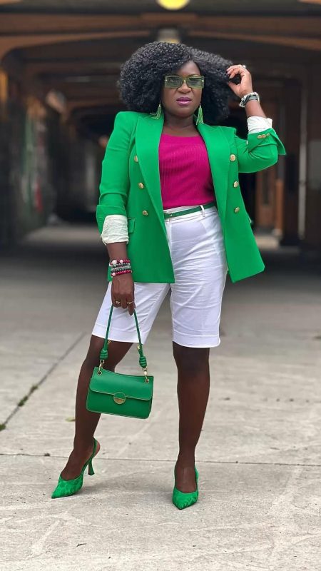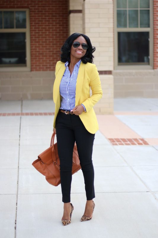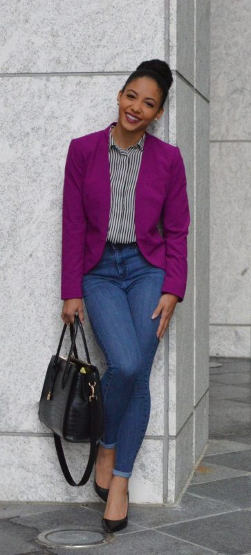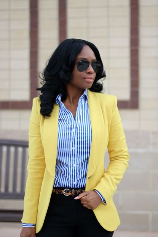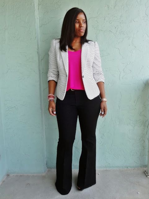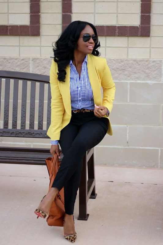 1. Bold Blazer and Neutral Bottoms: Pair a brightly colored blazer, such as royal blue or fuchsia, with neutral-colored bottoms like tailored black pants or a gray pencil skirt. Complete the look with a crisp white blouse and classic pumps.