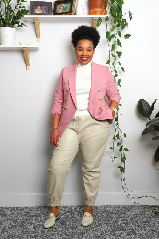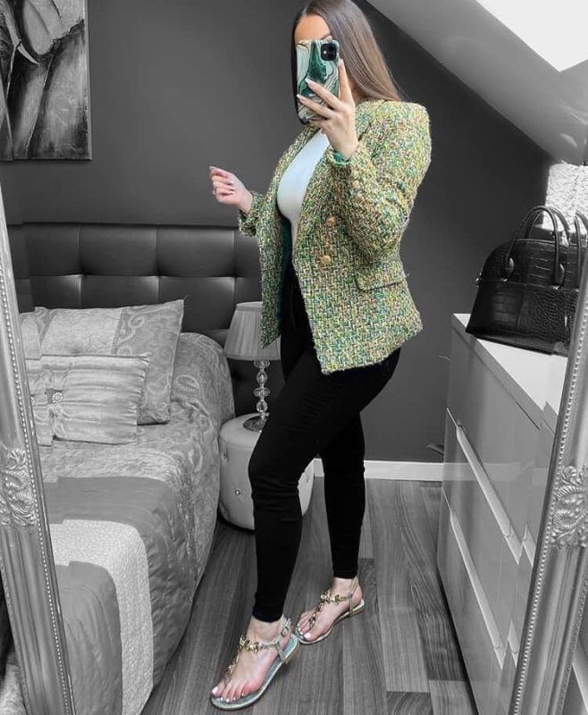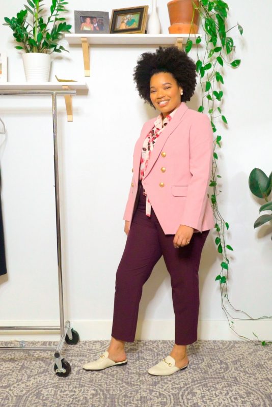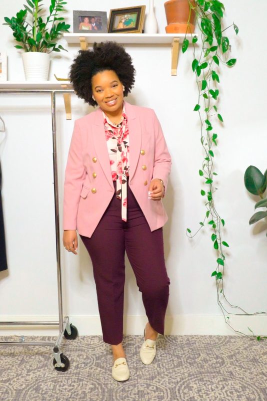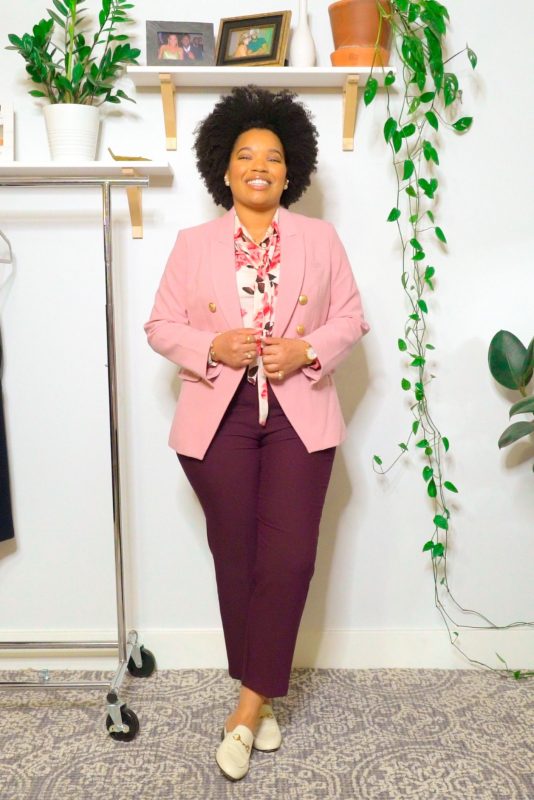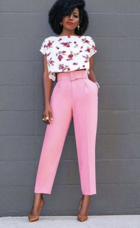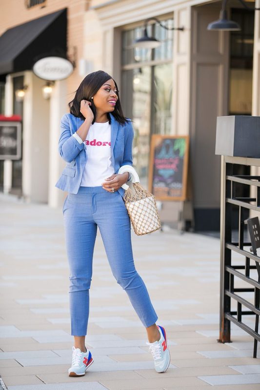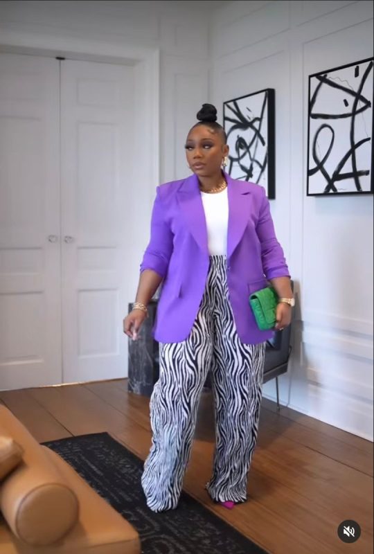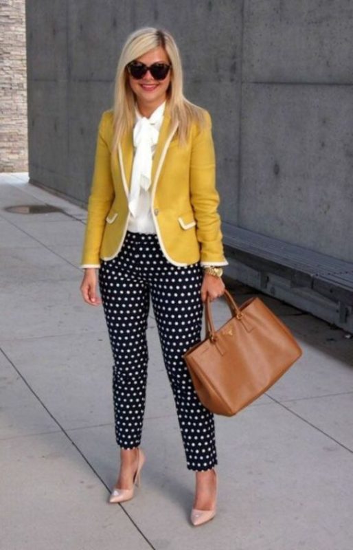 6. Pastel Blazer and Printed Pants: Opt for a pastel-colored blazer, like lavender or mint green, and pair it with printed pants featuring a mix of soft hues. Choose a blouse in a coordinating color from the print for a cohesive look.