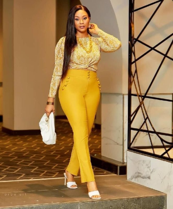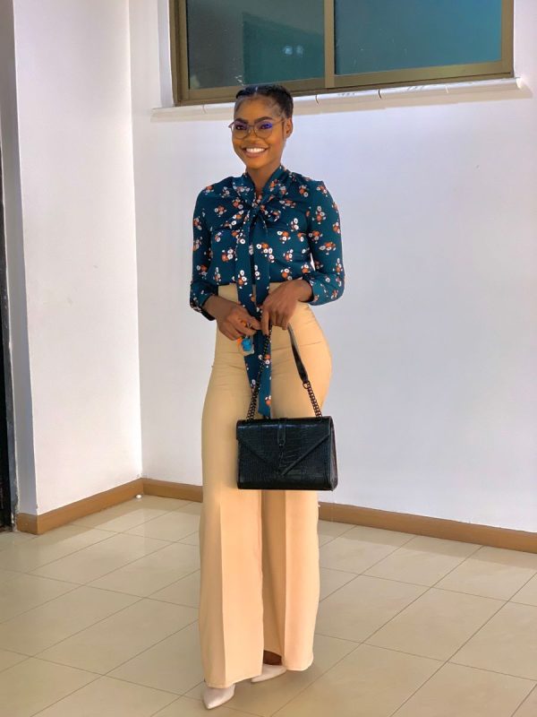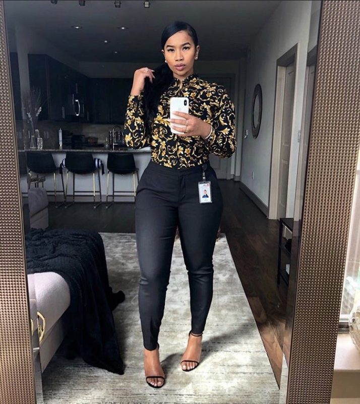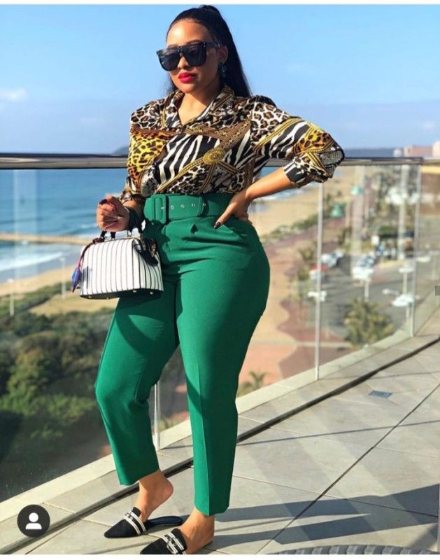 2. Colorful Printed Blouse and Trousers: Opt for a vibrant printed blouse with a mix of colors and patterns. Pair it with solid-colored trousers in a complementary shade. Add neutral accessories and a structured handbag to balance the look.