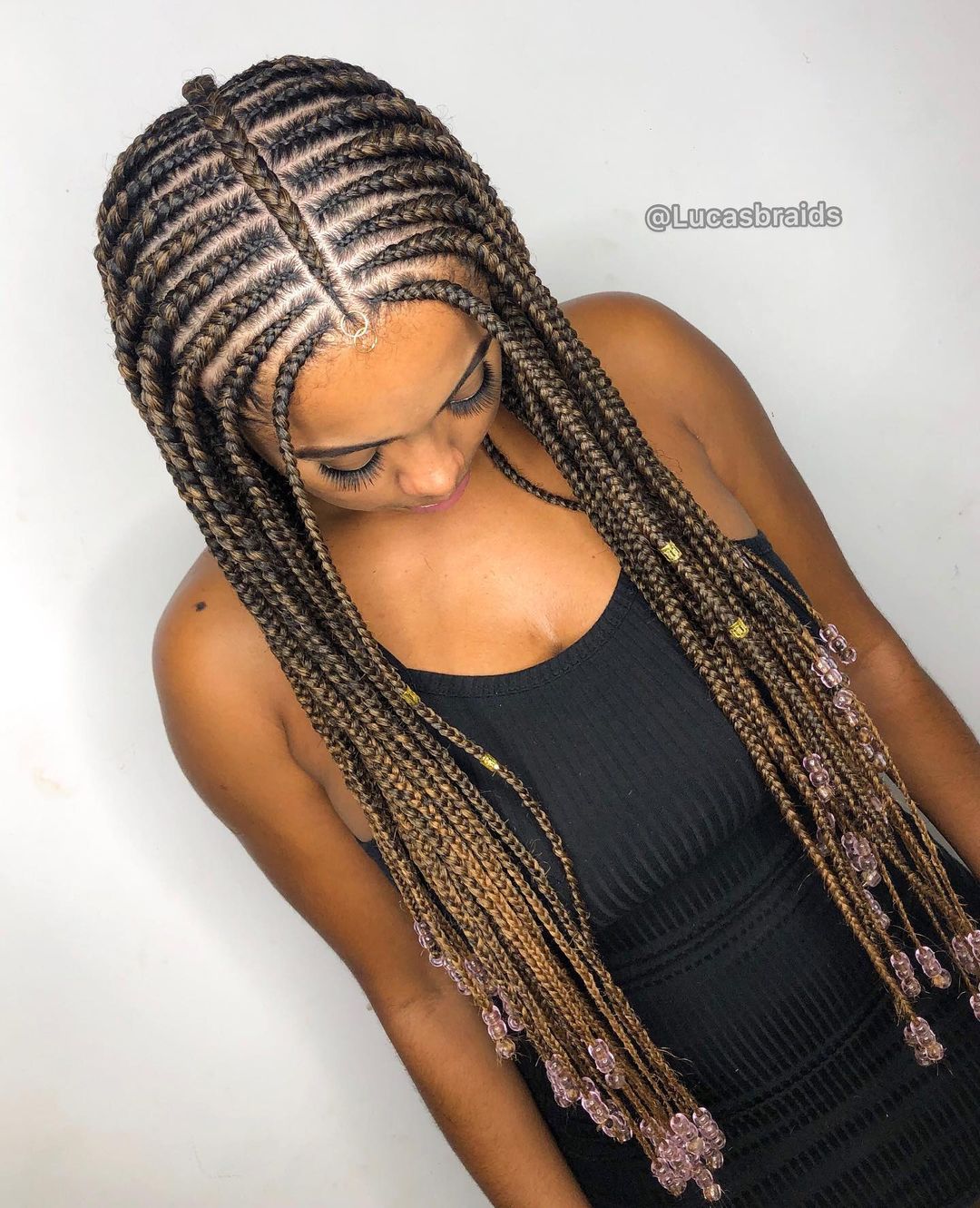 The classic Fulani braids are characterized by cornrows on the sides and a central section of braids that are adorned with beads. This iconic style allows for creative patterns and designs, with the beads adding a touch of elegance and cultural significance. Show your braider a picture of a classic Fulani braid style that catches your eye, and let them work their magic in creating a stunning and intricate look.