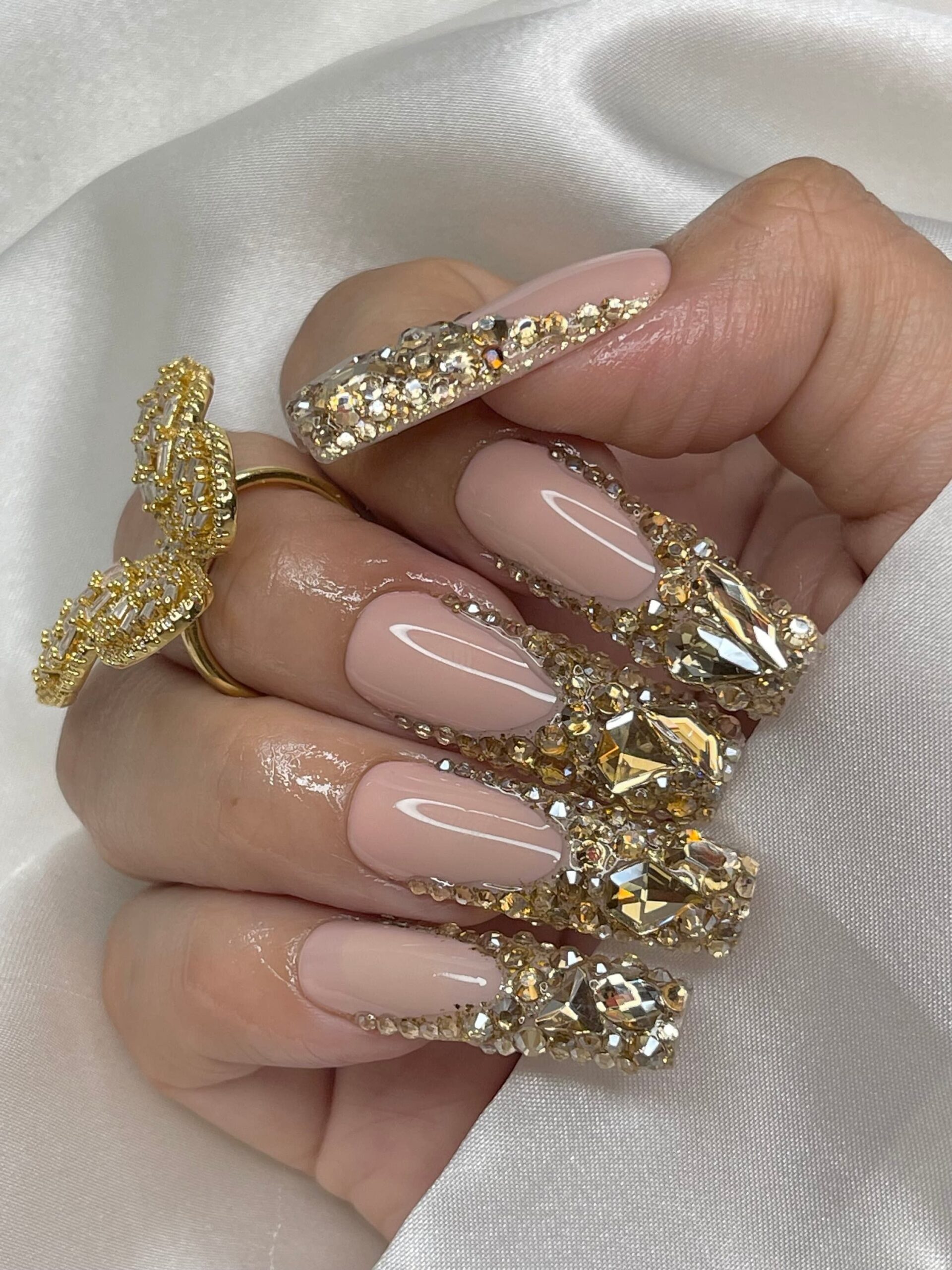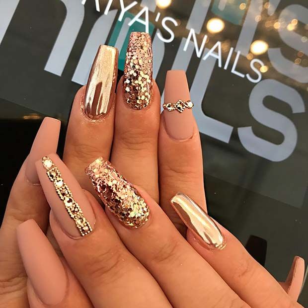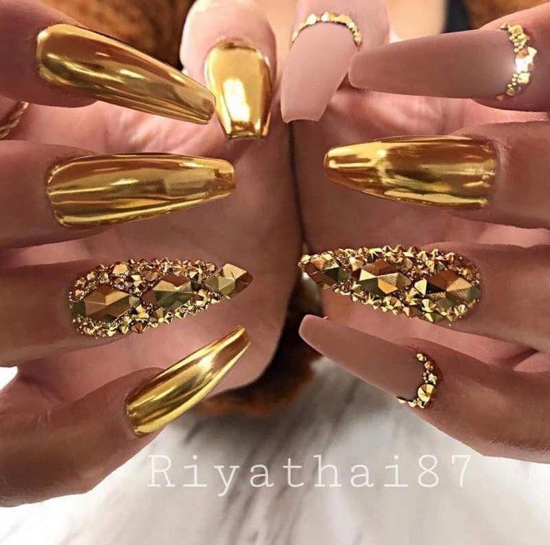 Adorn your nails with tiny gold studs or rhinestones for that extra bling.
