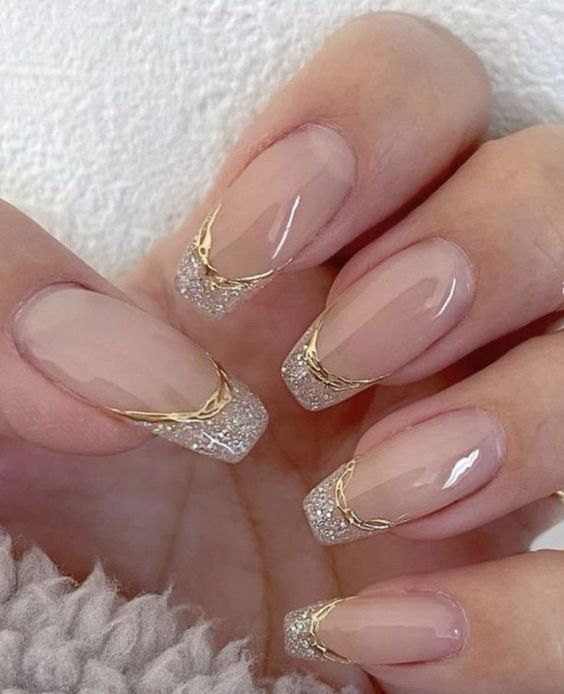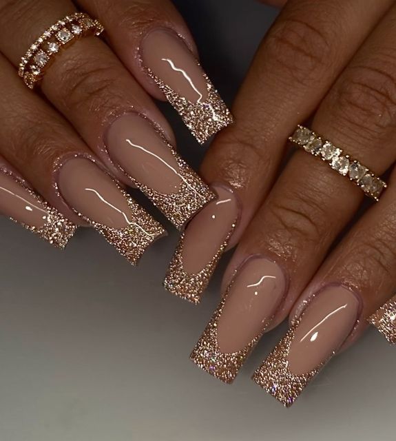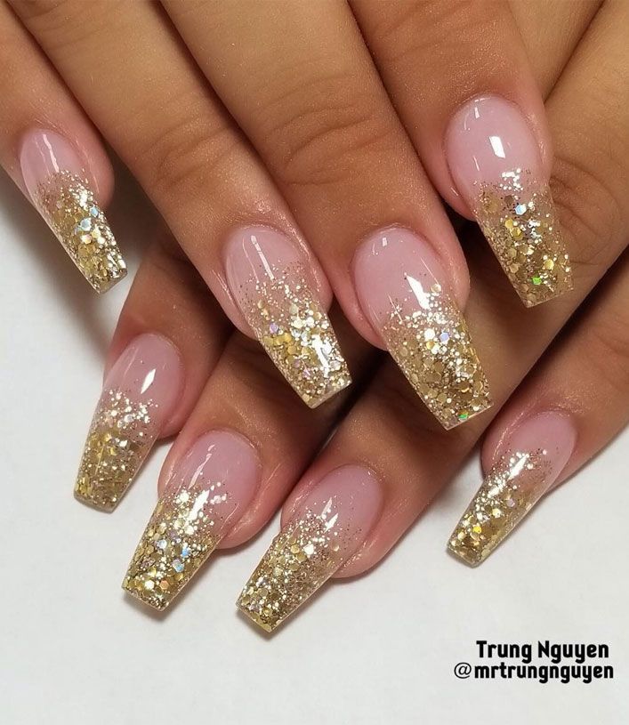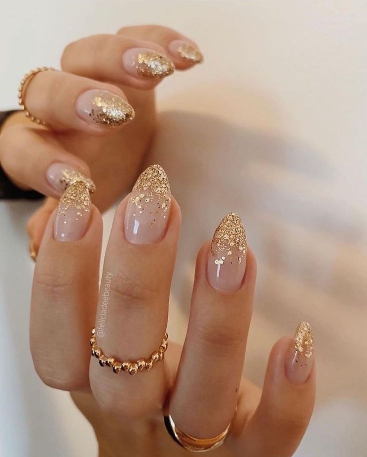 Start with a clear base and let the gold glitter intensify towards the tips, creating a sparkling gradient.