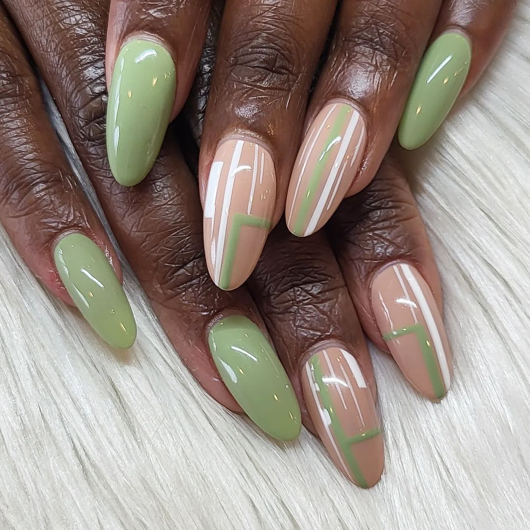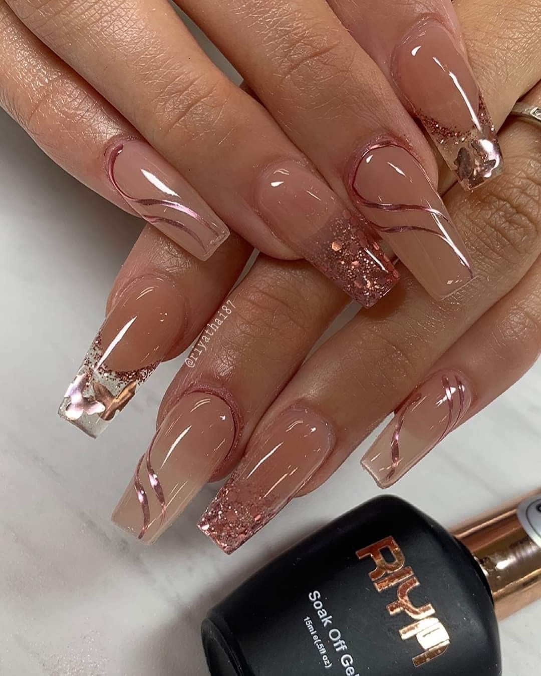 Use thin golden tape or a fine brush to create delicate gold stripes on a nude or clear base.