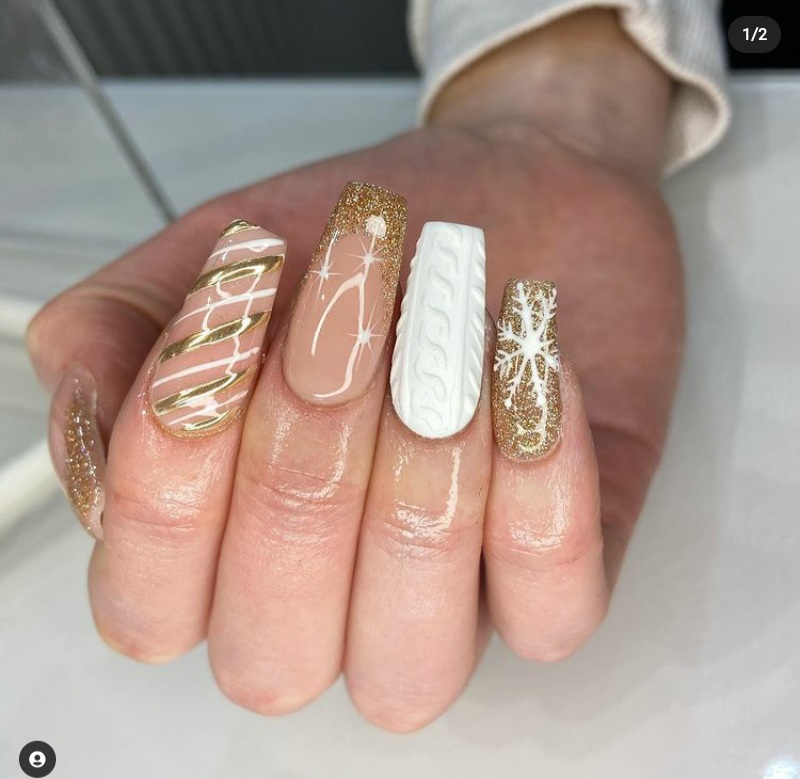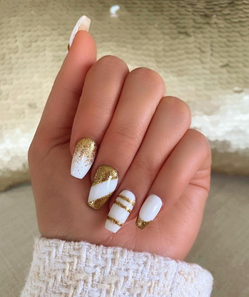 - Holiday Sparkle: White nails with gold glitter, perfect for festive occasions.