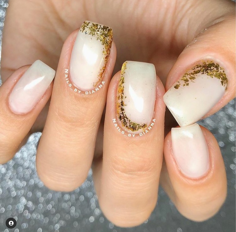 - Gold Glitter Gradient: White nails with gold glitter, more densely packed at the tips.