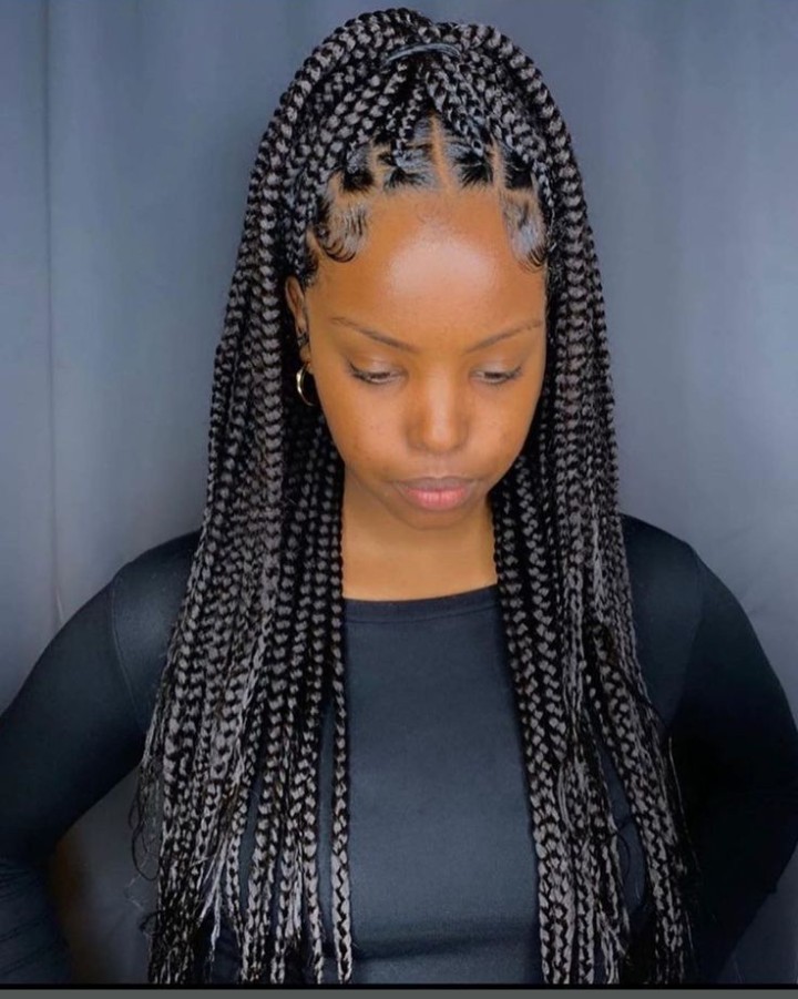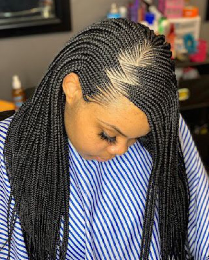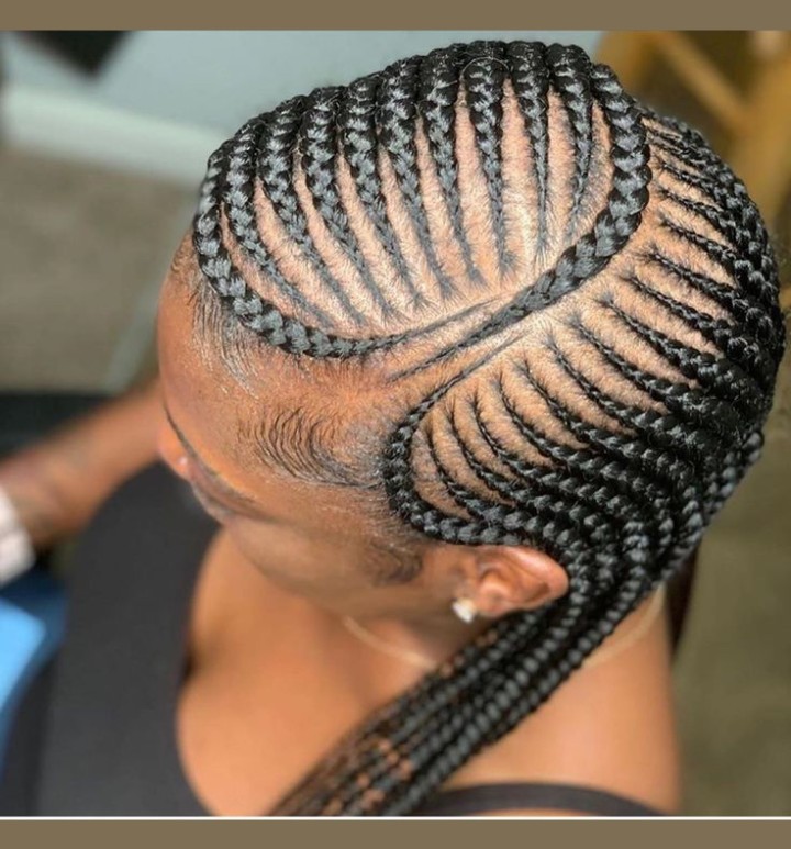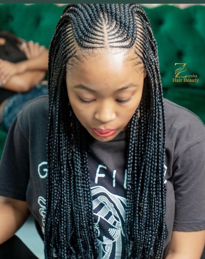 Experiment with geometric parting to create innovative patterns with your Ghana braids. Triangles, squares, and other shapes add a modern and artistic touch.