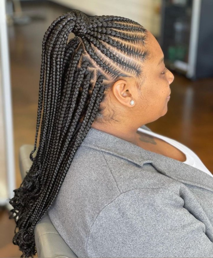 Make a bold statement with a Mohawk-inspired Ghana braids hairstyle. The braids gathered at the center create an edgy and stylish appearance.