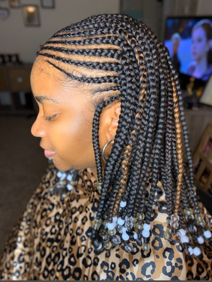 Opt for a layered Ghana braids bob that offers a contemporary and youthful appearance. The layers add movement and volume to the hairstyle.