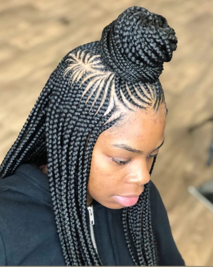 Combine curved braids with a high bun for a chic and modern look. The curved pattern adds visual interest while the bun offers a touch of elegance.
