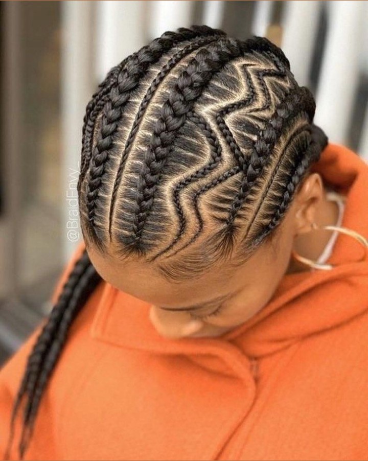 Add a twist to your Ghana braids with zigzag cornrows complemented by vibrant color accents. This dynamic combination offers a playful and eye-catching look.