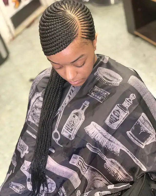 For an effortless and chic look, gather your lemonade braids into a low side ponytail. This style exudes a relaxed and carefree vibe while still maintaining a trendy and fashionable appearance.