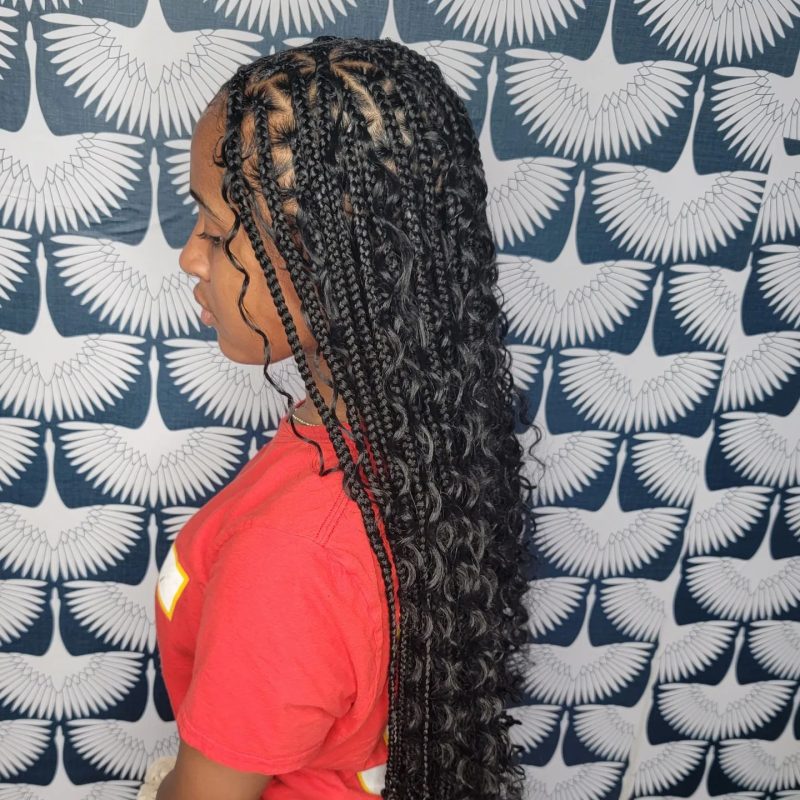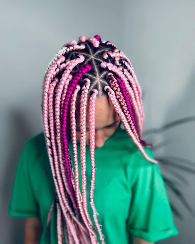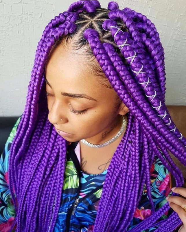 1. Half-Up Ponytail: Gather the top half of your triangle braids into a high ponytail, leaving the remaining braids cascading down. This style creates a sleek and polished look.