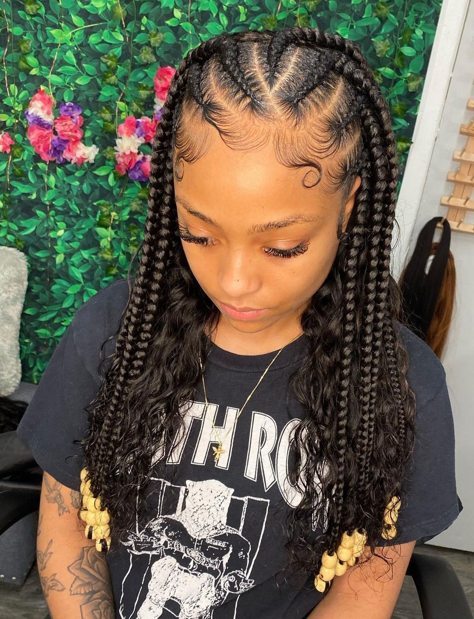 Leave the ends of your cornrows curly for a playful and flirty vibe. This style combines the neatness of braids with the free-spirited nature of curls.