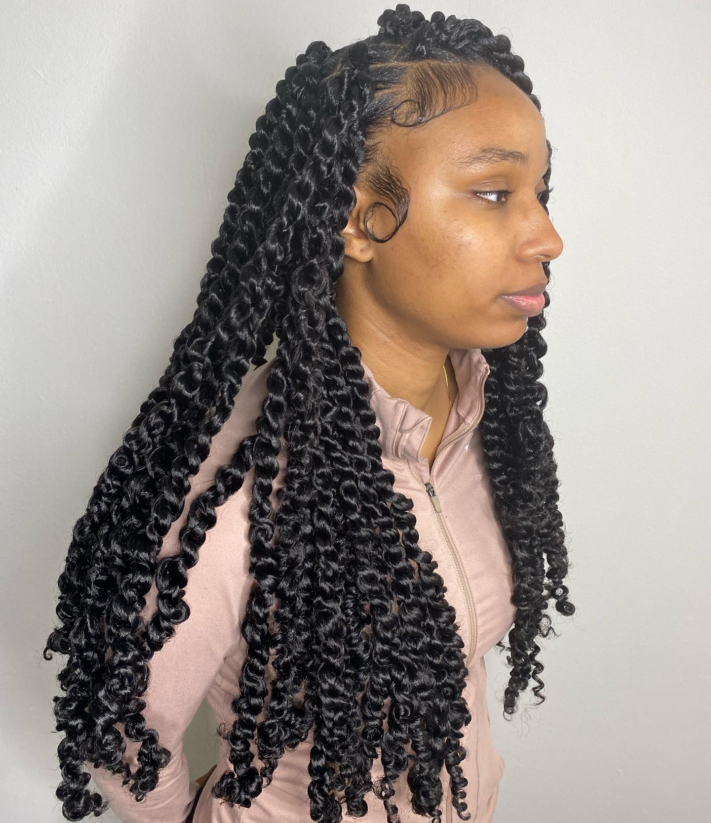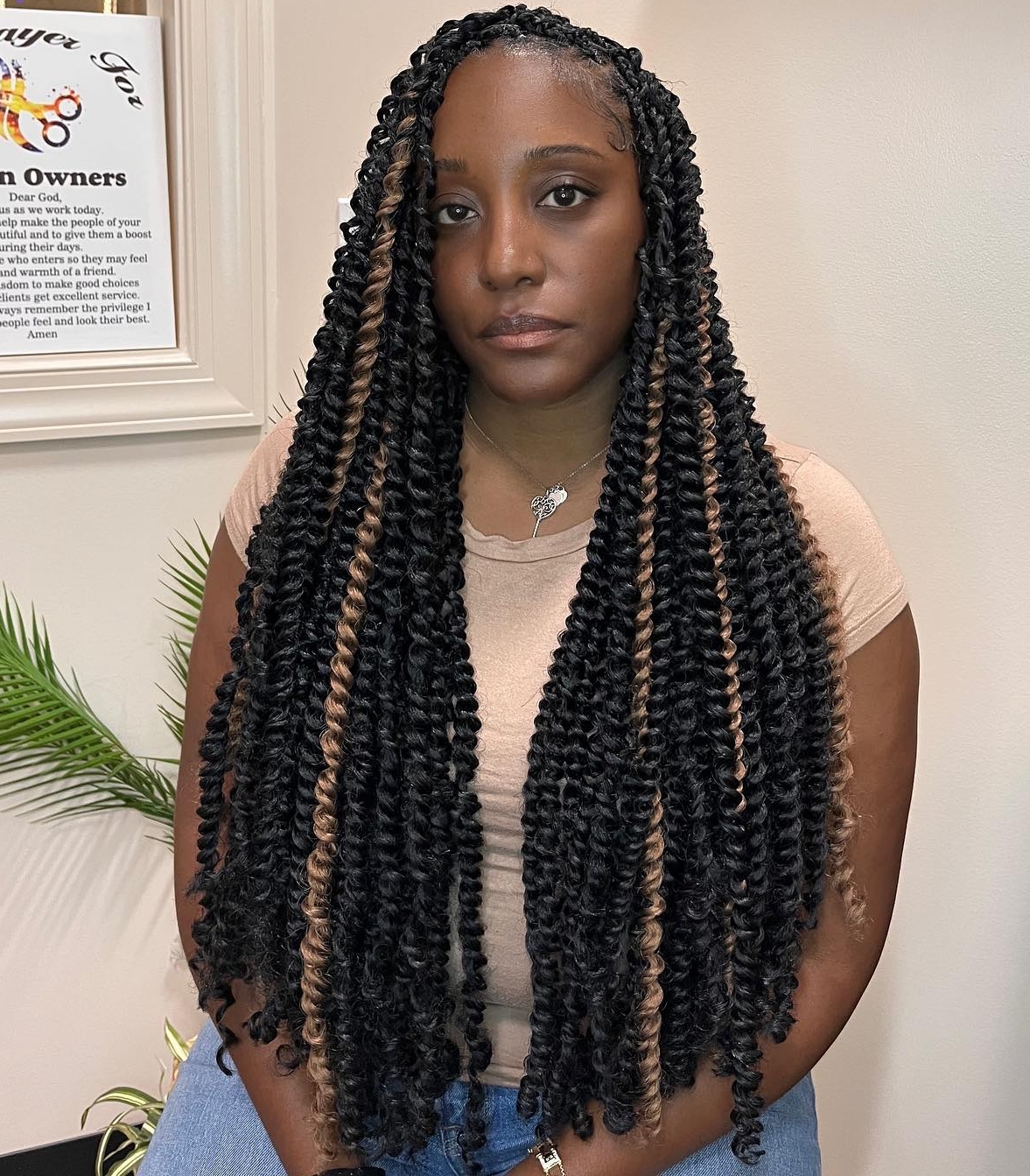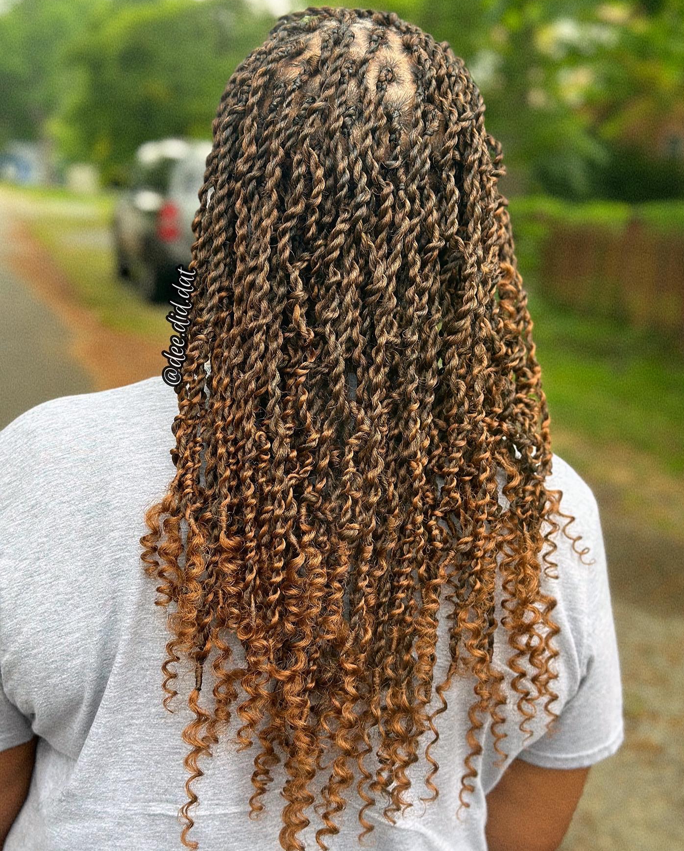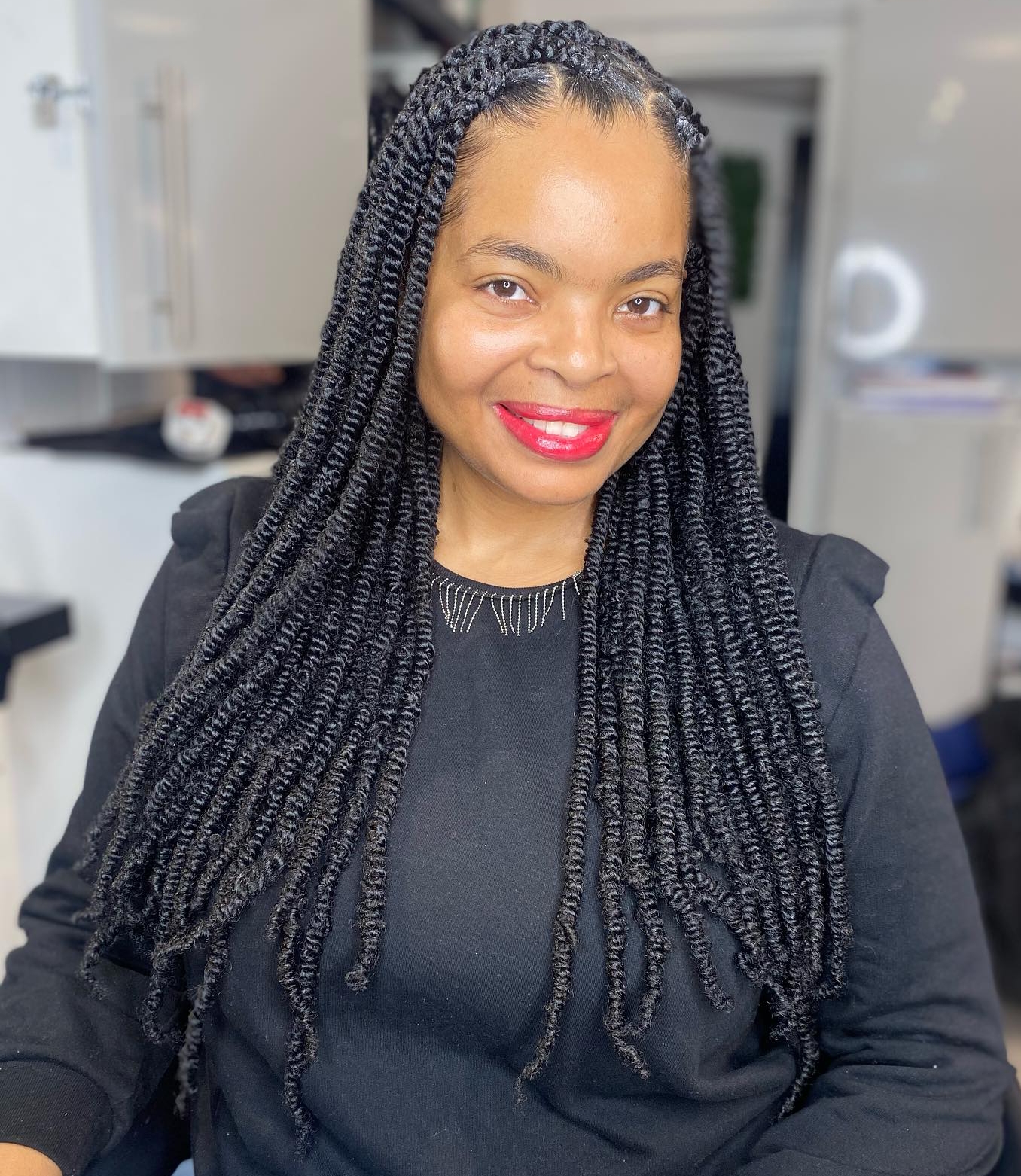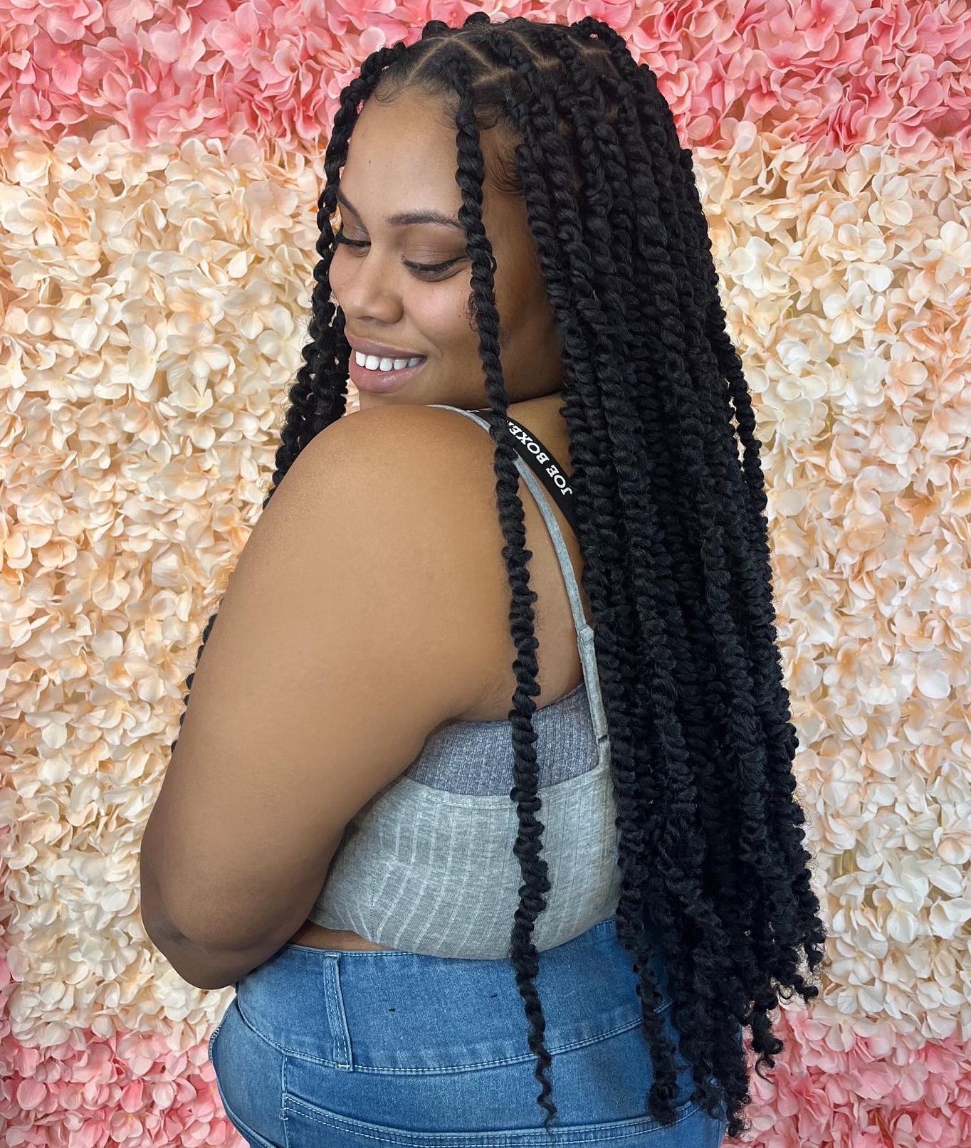 - Mesmerizing shoulder-length passion twists with a natural blend of curls for a carefree look.
