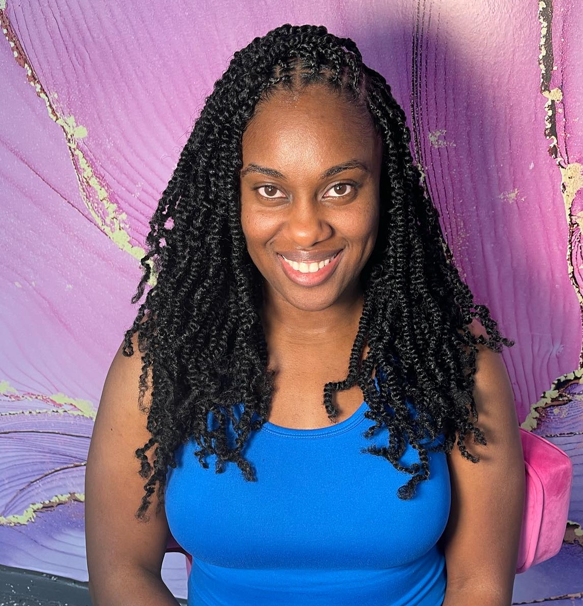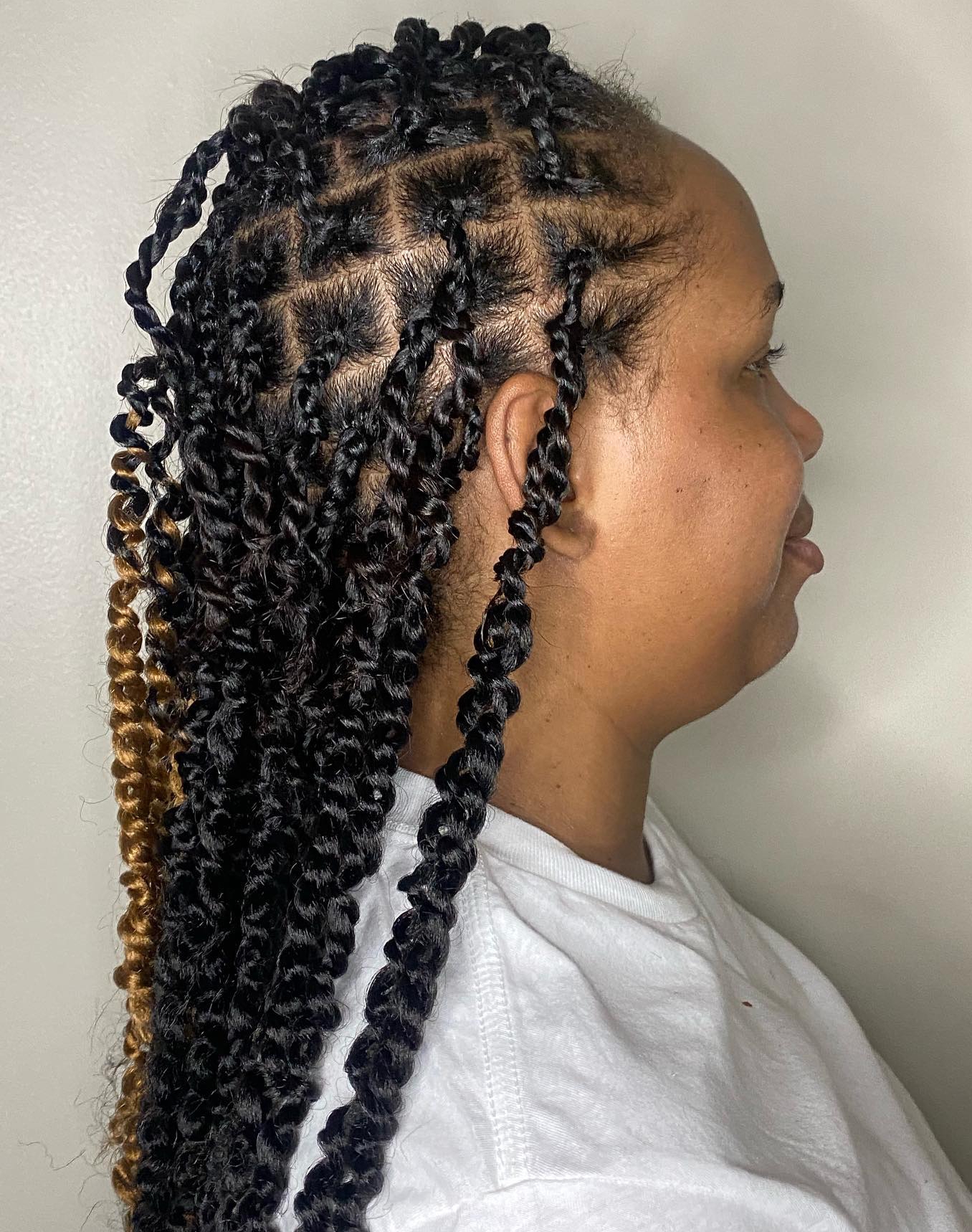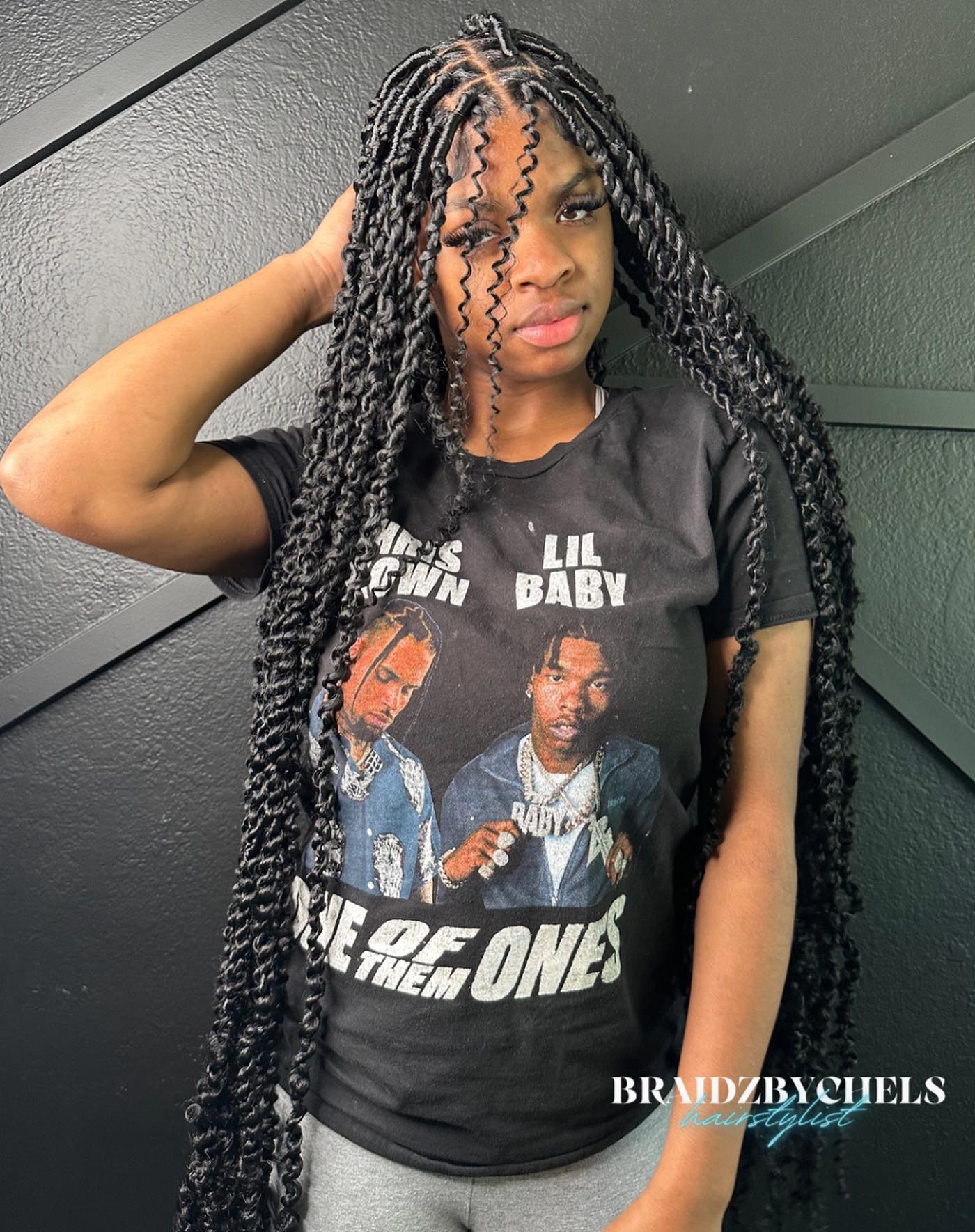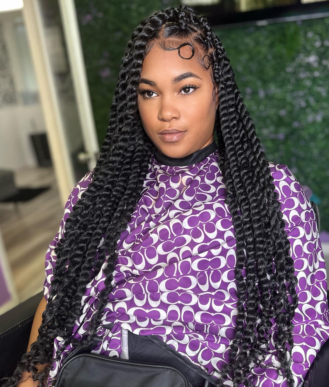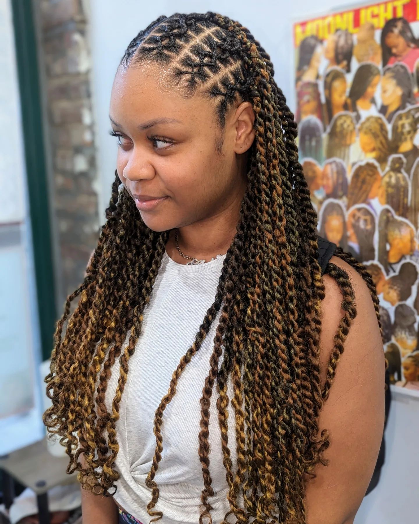 - Mesmerizing shoulder-length passion twists with a natural blend of curls for a carefree look.