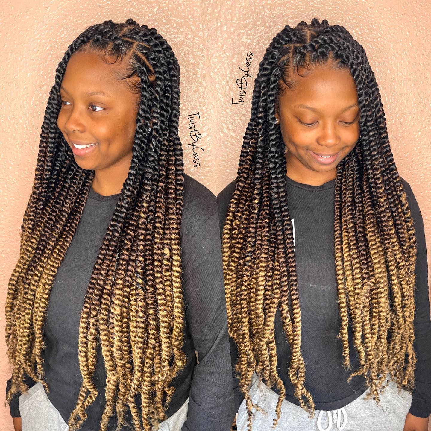 - Embrace the ombre trend with passion twists that transition from dark to light.