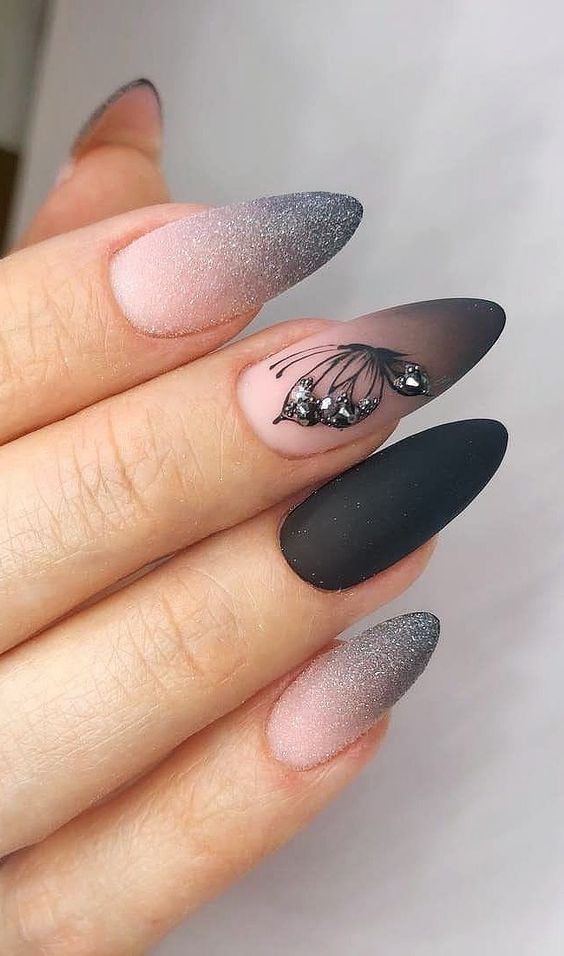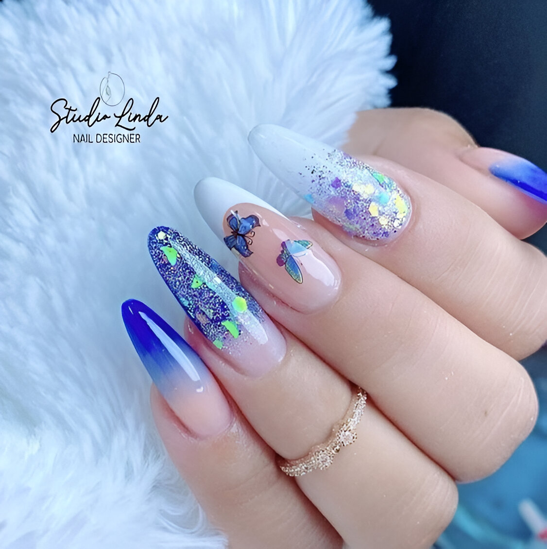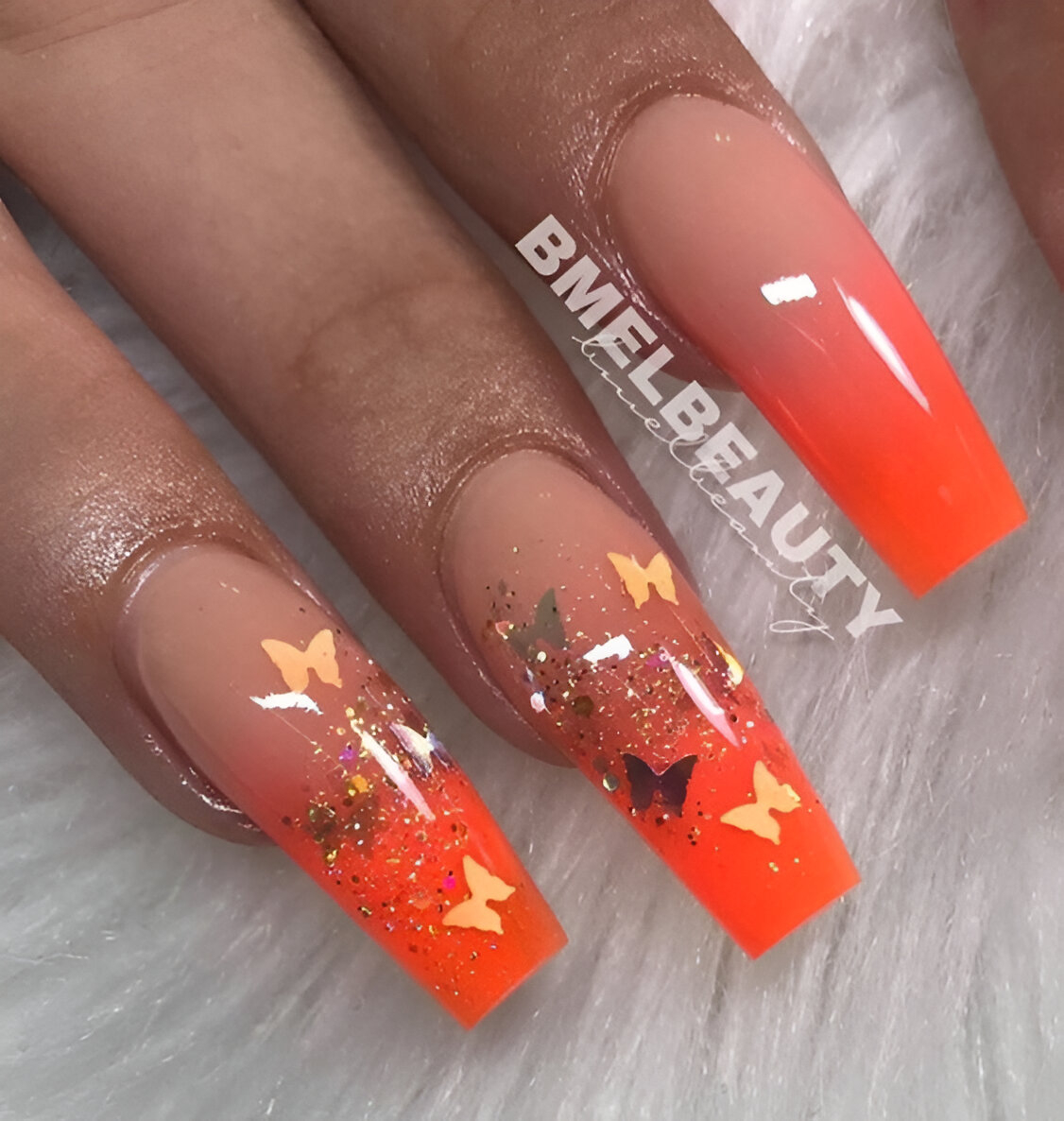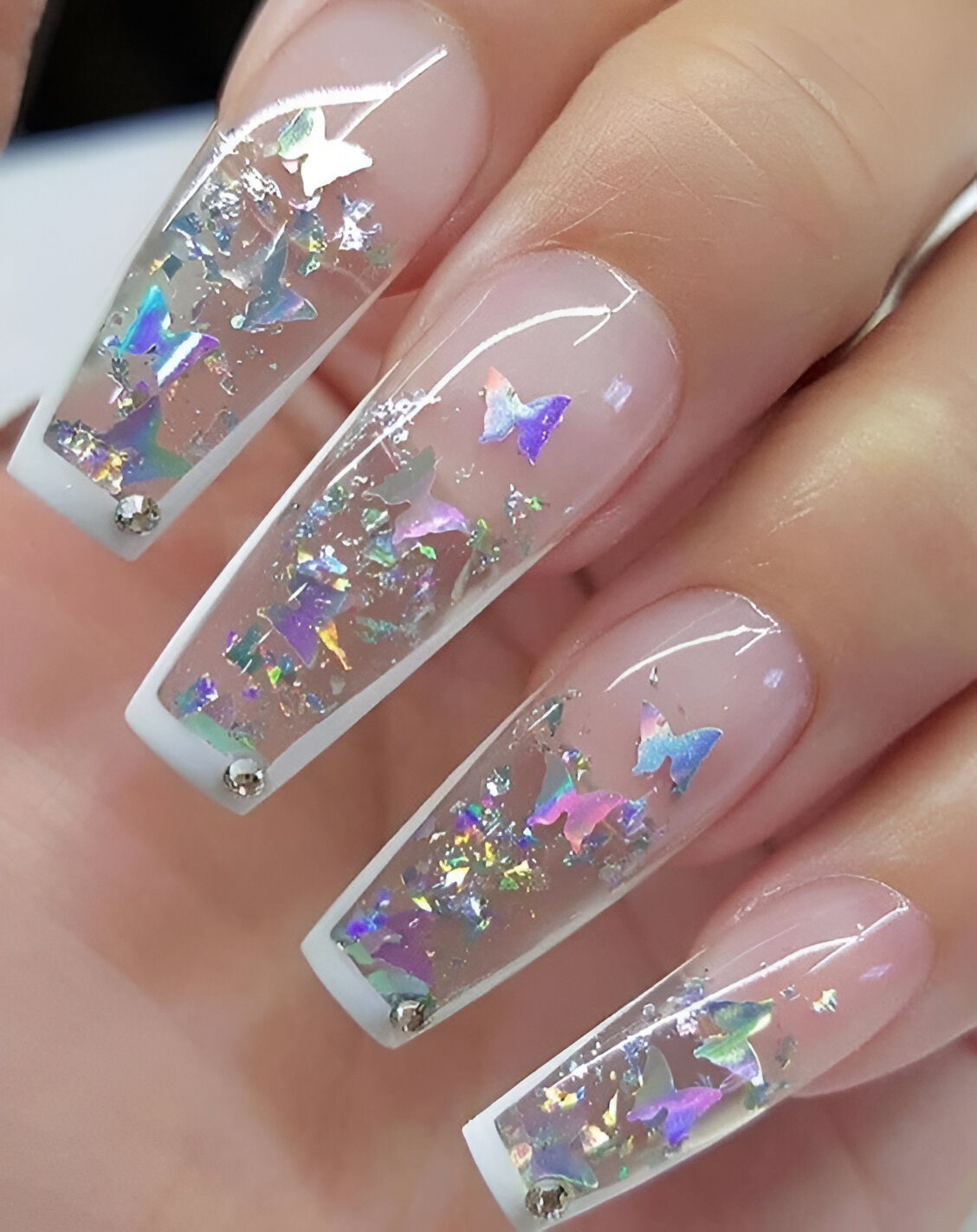 Create a mesmerizing gradient effect on your nails, with butterfly tips transitioning through different shades.