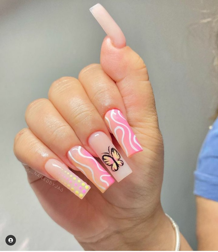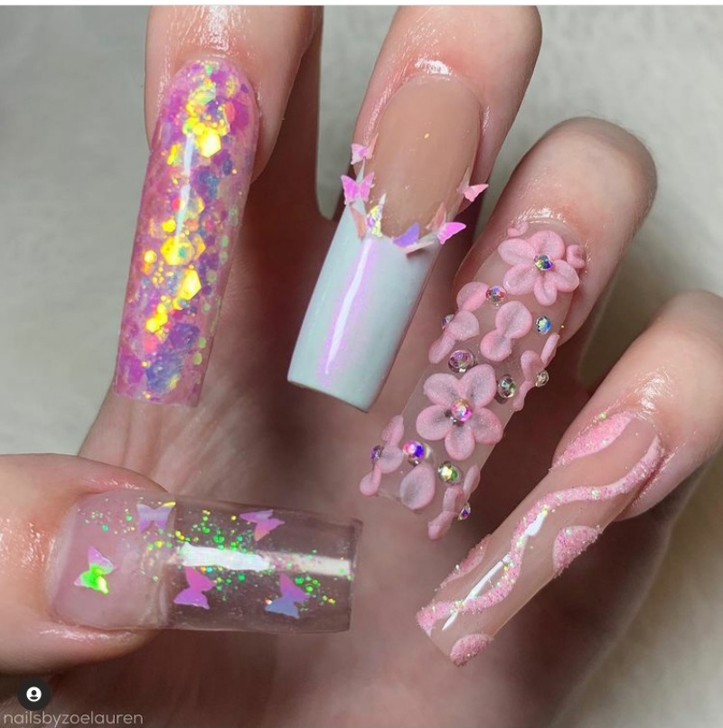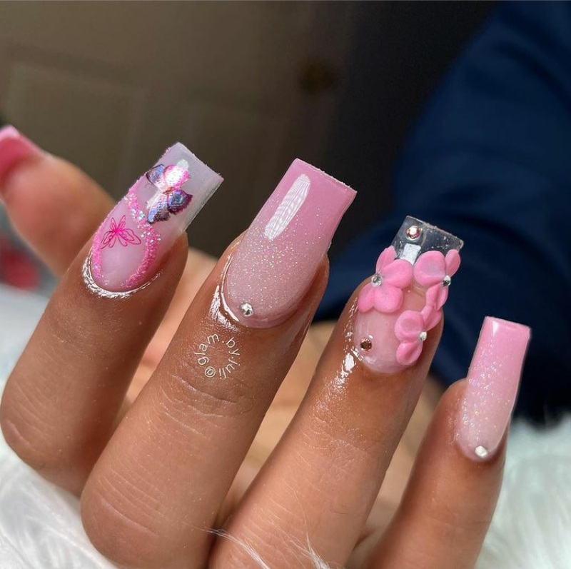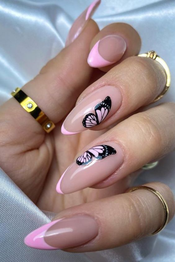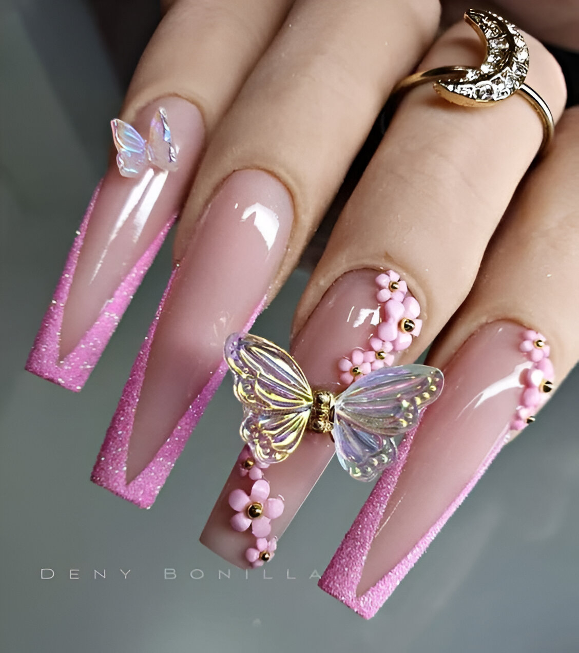 Infuse your nails with romance by opting for pink butterflies with subtle floral details.