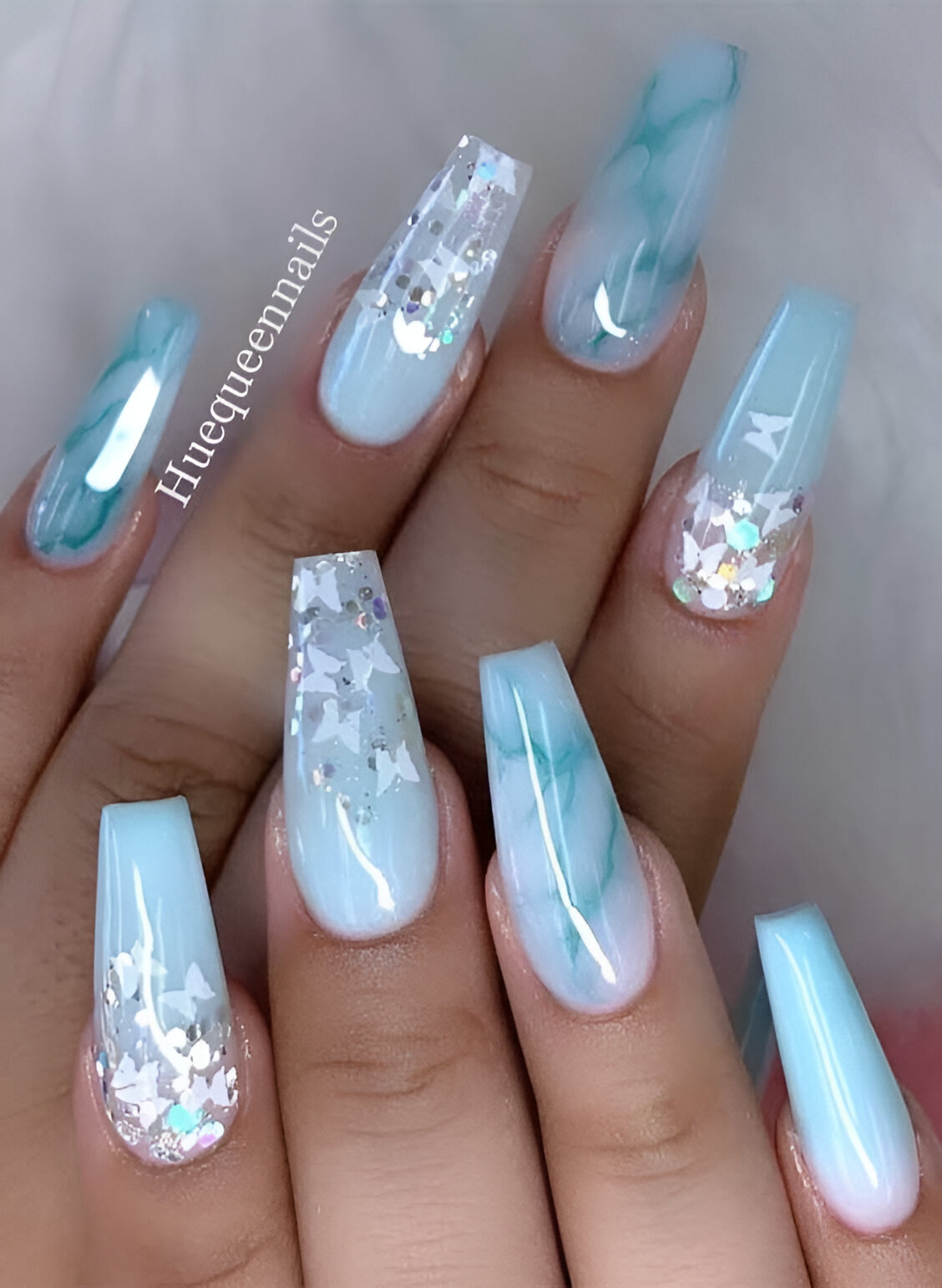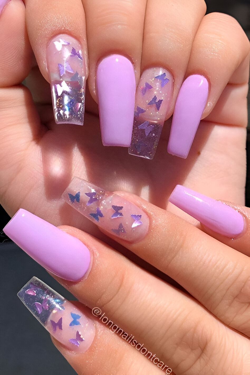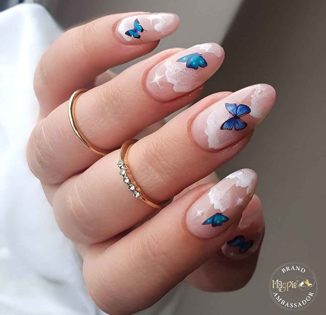 Create a serene and dreamy look with pastel butterfly nails, reminiscent of a magical garden.