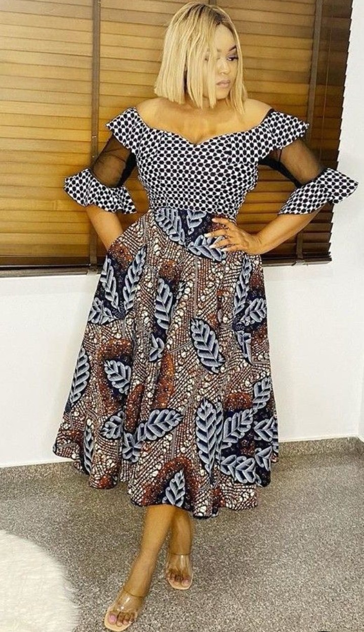 4. Off-Shoulder Ankara Elegance: An off-shoulder Ankara dress is a perfect blend of allure and sophistication. It’s a great choice for evening events, allowing you to flaunt your style with confidence.