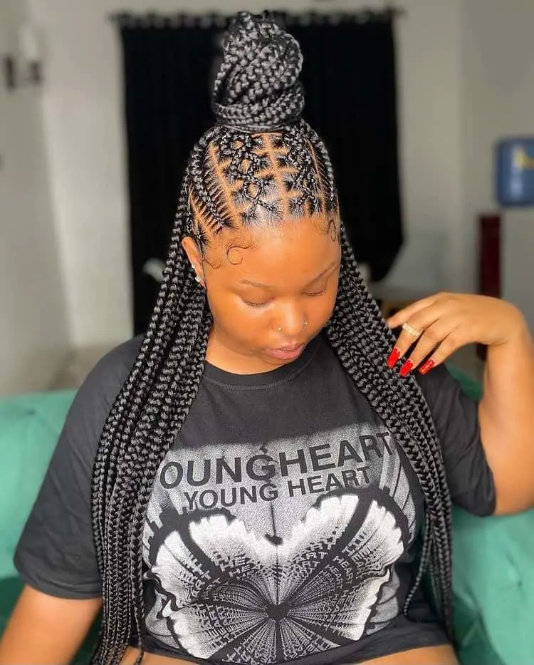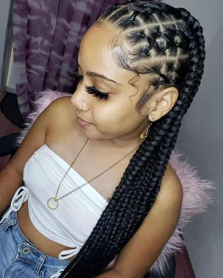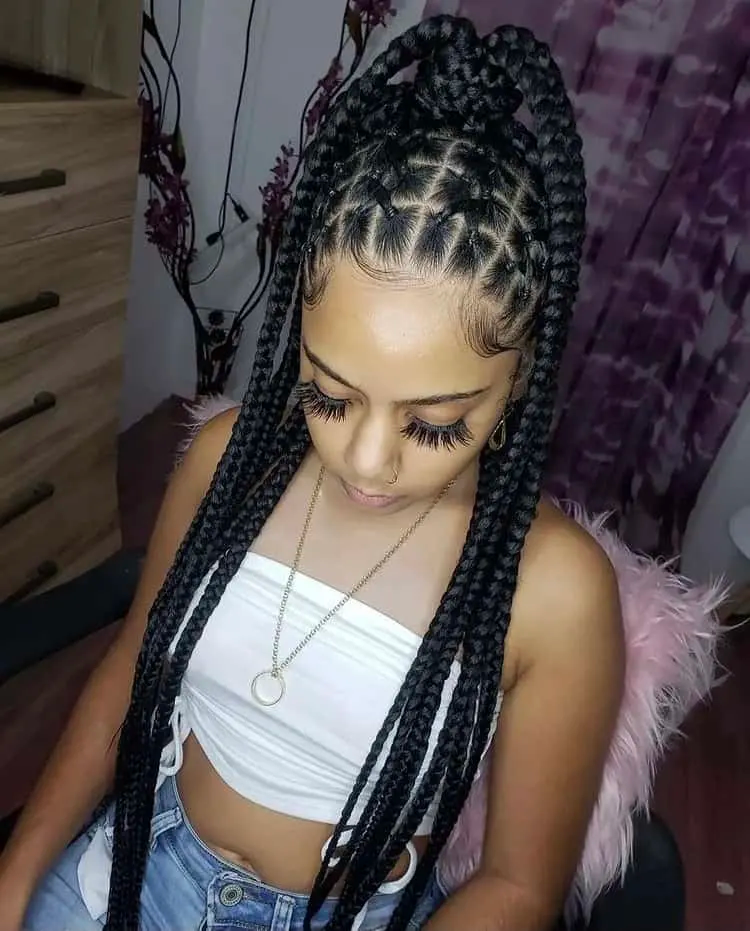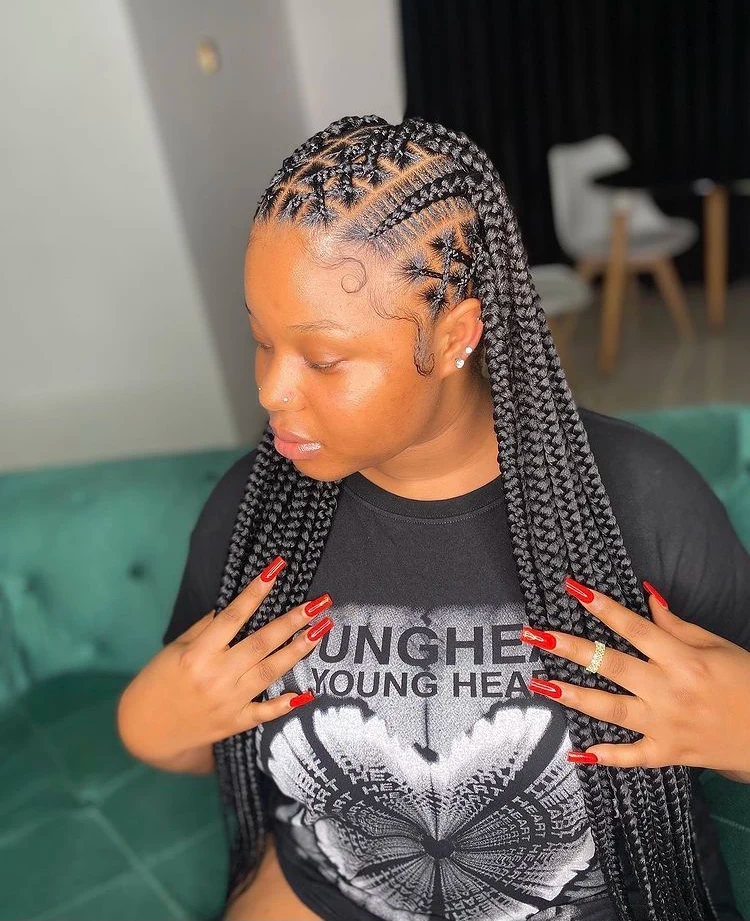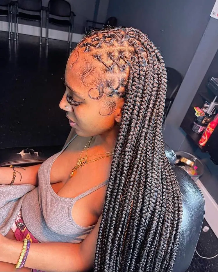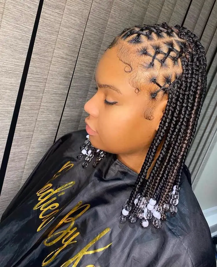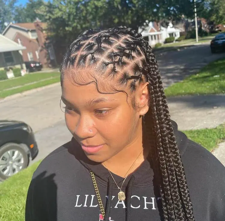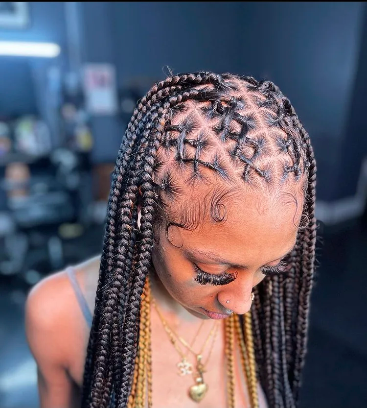 - Mid-Length Majesty: Shoulder-length braids in a criss-cross pattern, perfect for a breezy look.