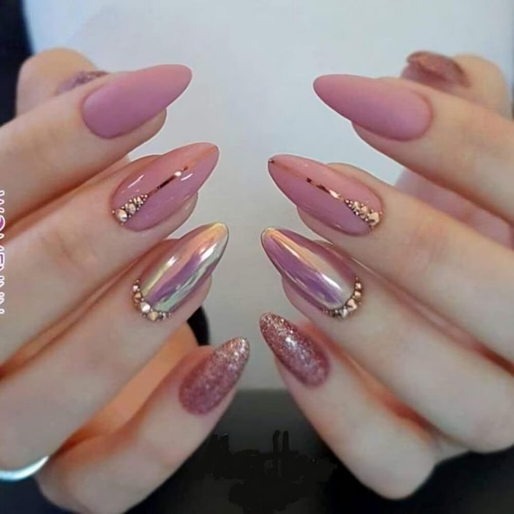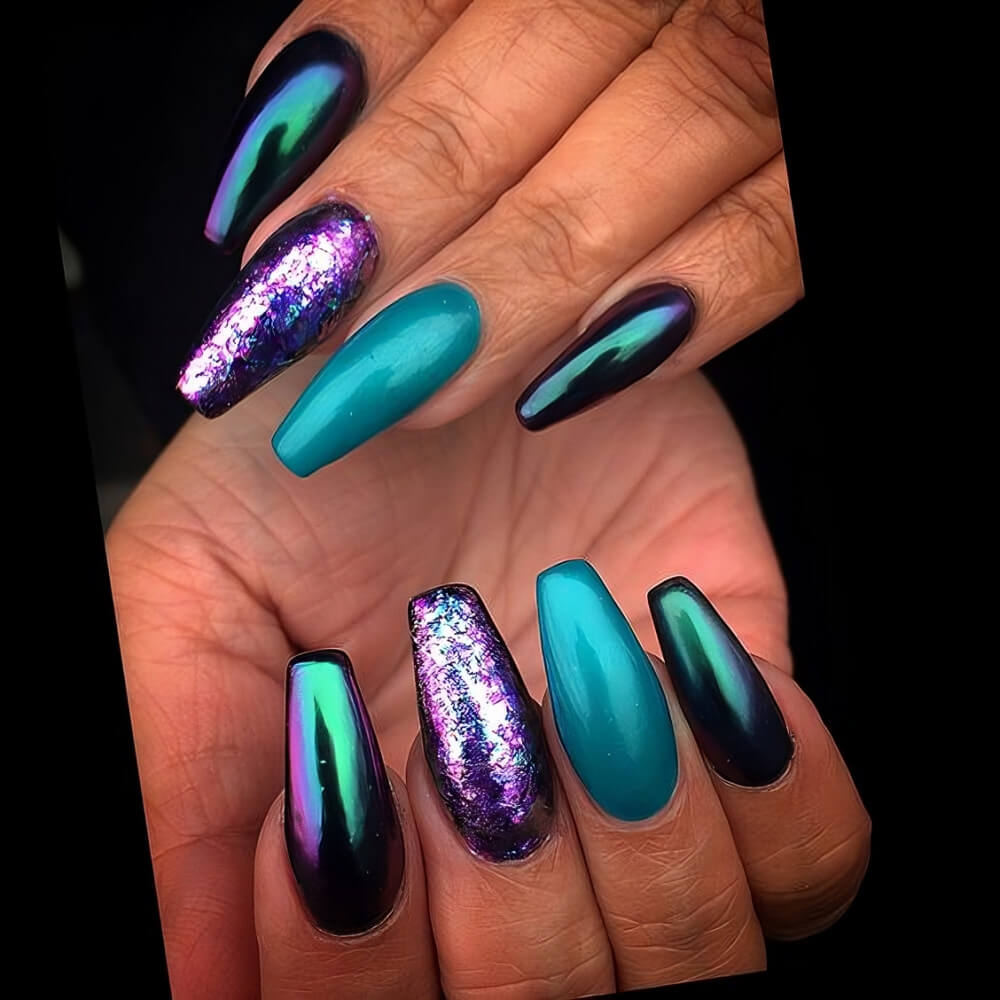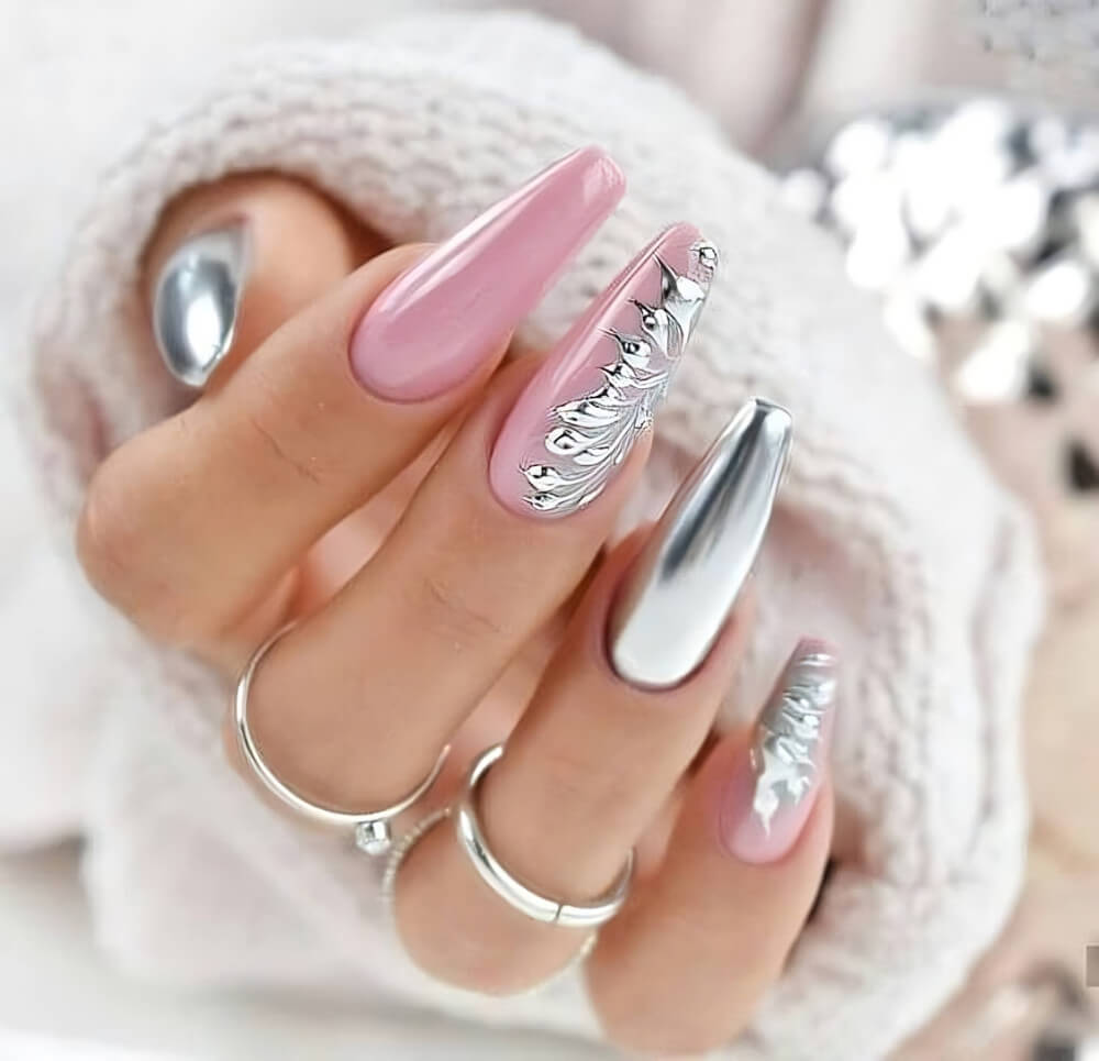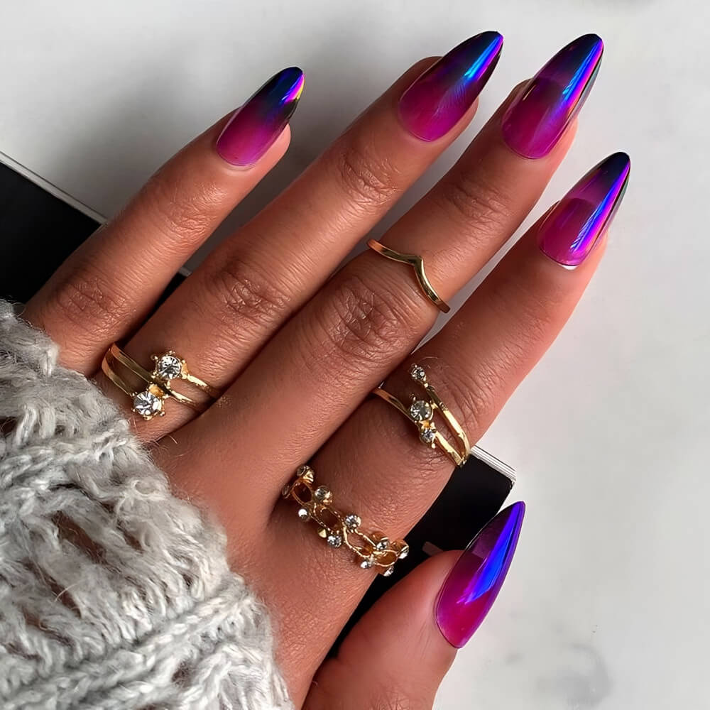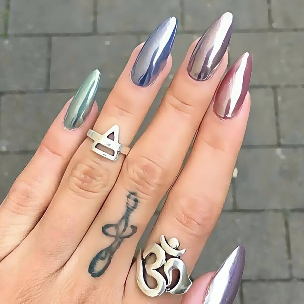 Chrome nails are very easy to recreate, but the result is gorgeous. These nails look great under the lights of nightclubs, pop star concerts, and social gatherings. Their shiny finish is what makes them so special. You can easily stand out with these chrome nail designs.