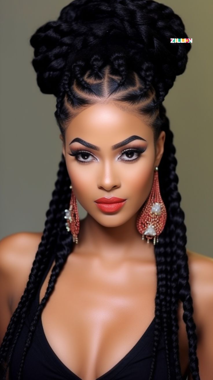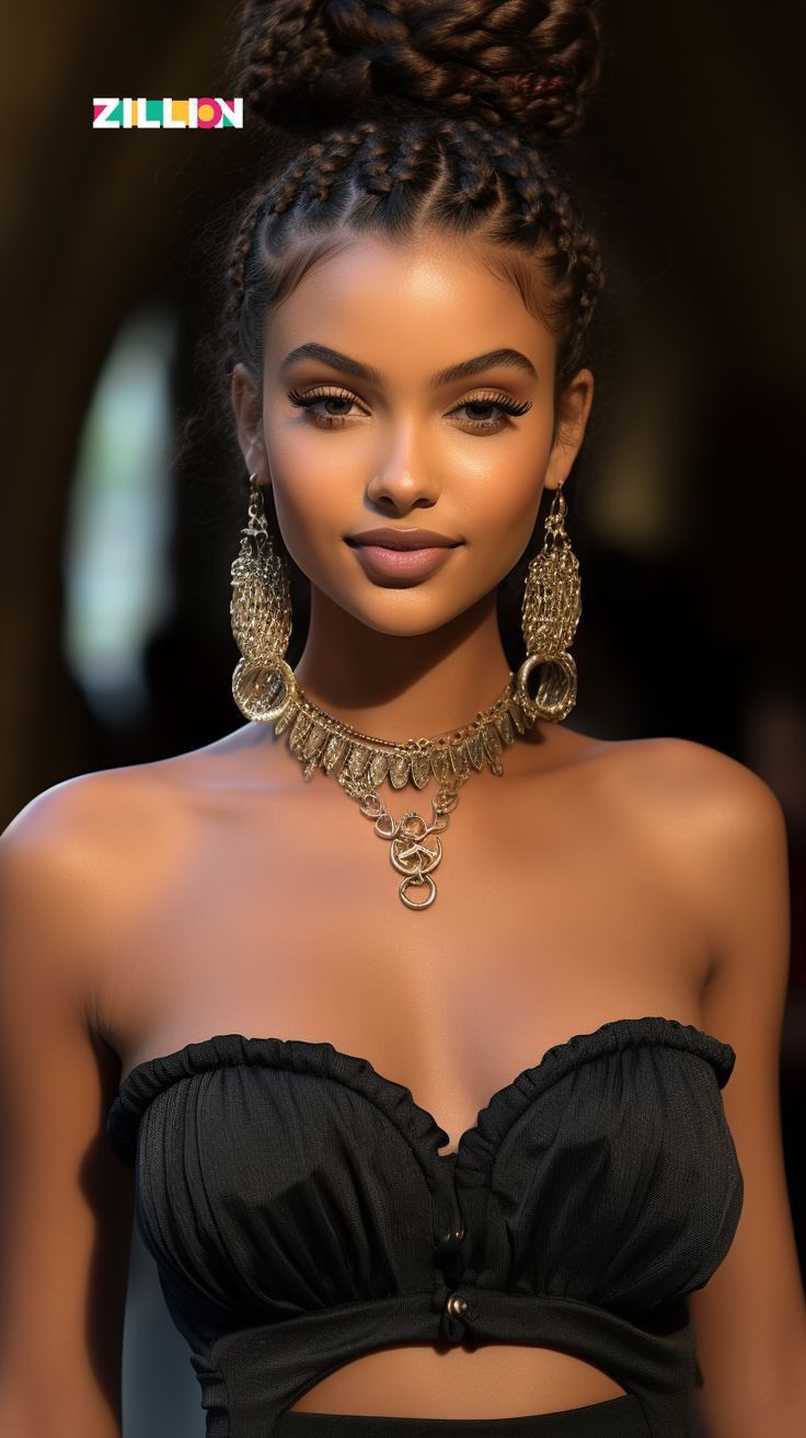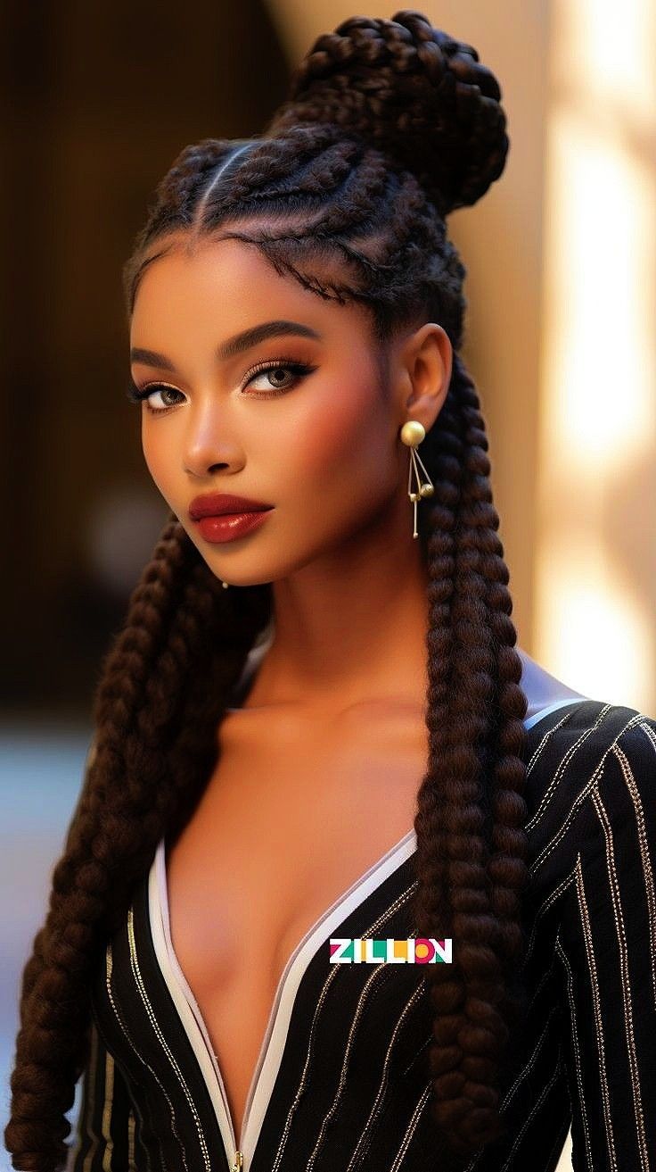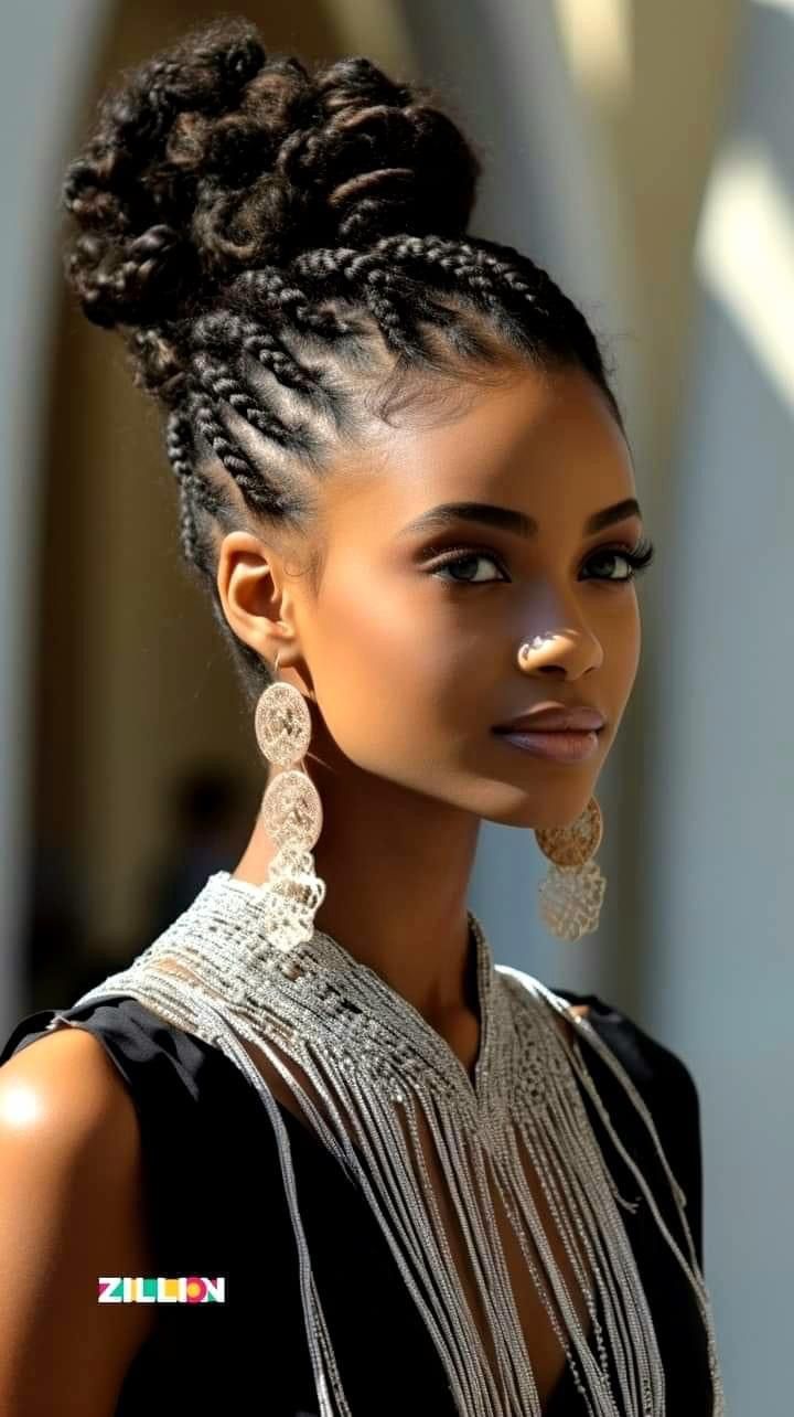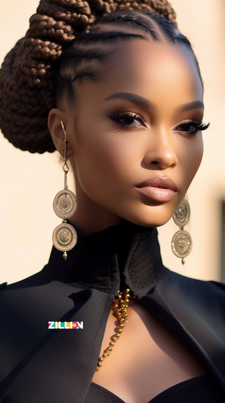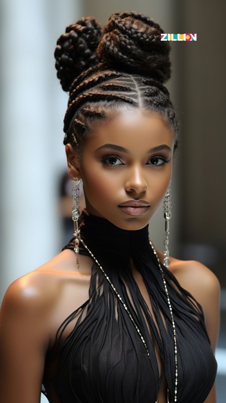 7. Sleek Cornrow Updo: Cornrows styled into a sleek updo are both modern and edgy. This style is great for showcasing your features and pairs well with bold makeup.