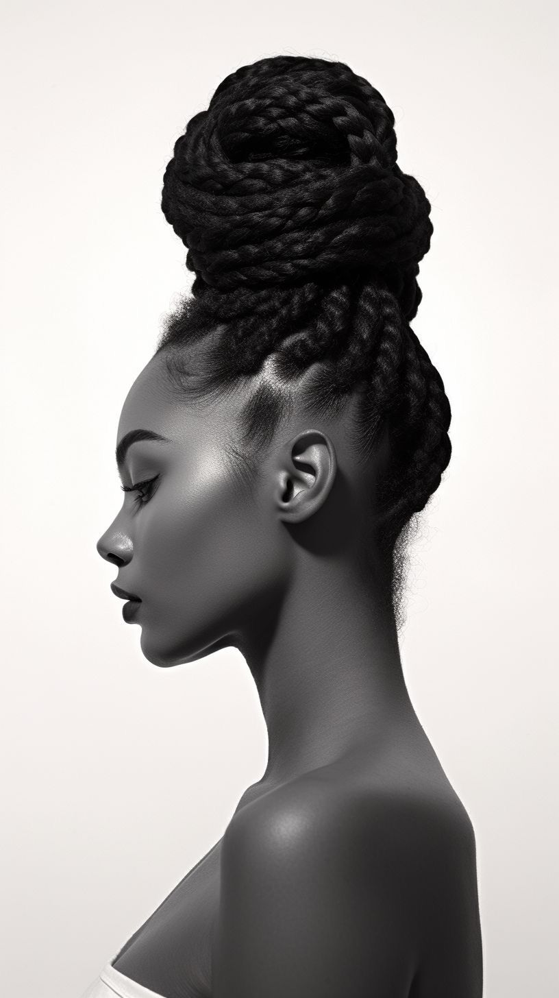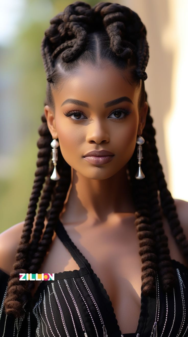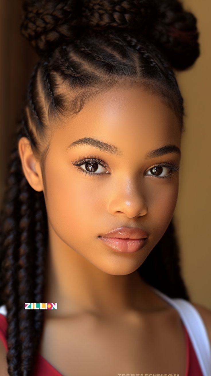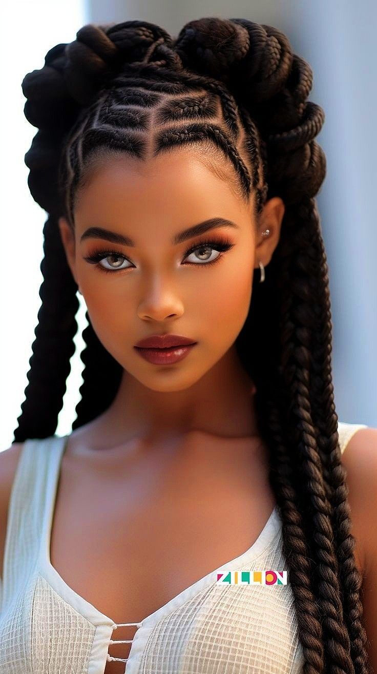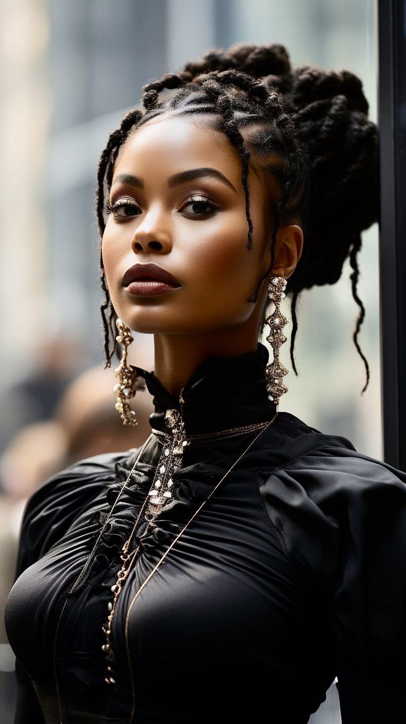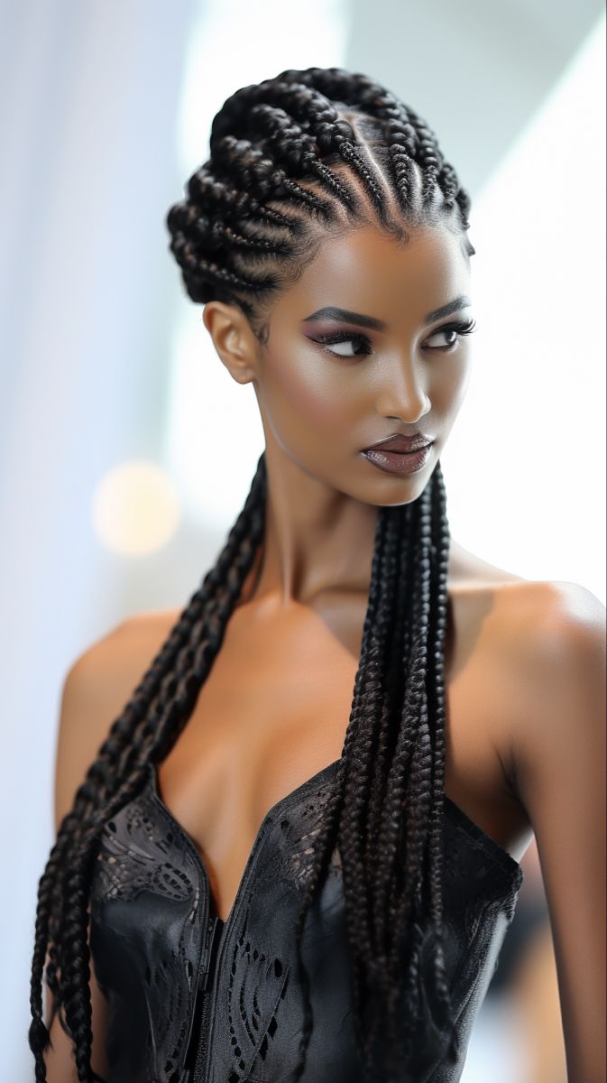 7. Sleek Cornrow Updo: Cornrows styled into a sleek updo are both modern and edgy. This style is great for showcasing your features and pairs well with bold makeup.