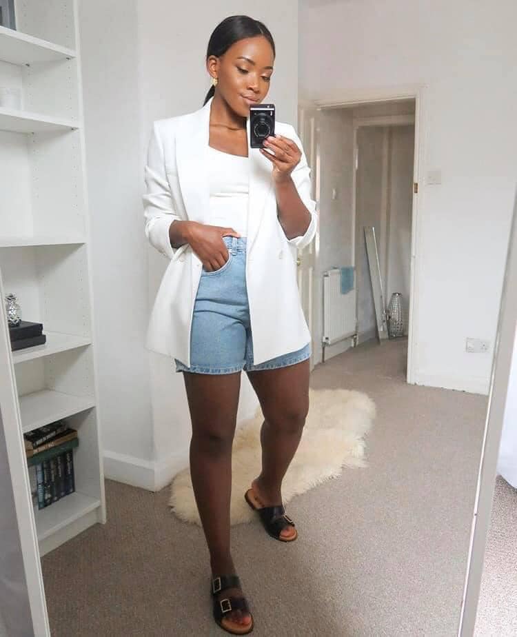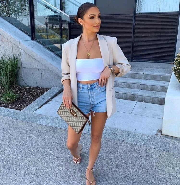 5. Sophisticated Twist: Dress up your jean shorts by pairing them with a structured blazer and a blouse. Add heels or wedges to elevate the ensemble, making it suitable for a dressier occasion.