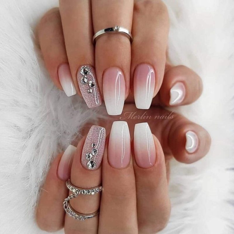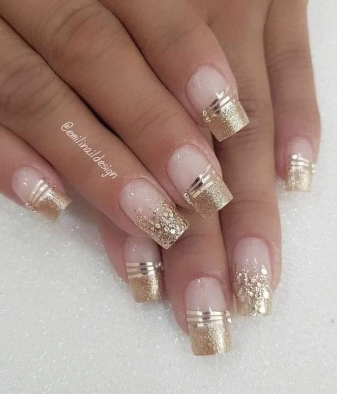 - French manicure: A French manicure is a classic look that can be easily updated with shiny nail polish. To create a French manicure, apply a light color to the entire nail and then use a white polish to create a small “V” shape at the tip of the nail.