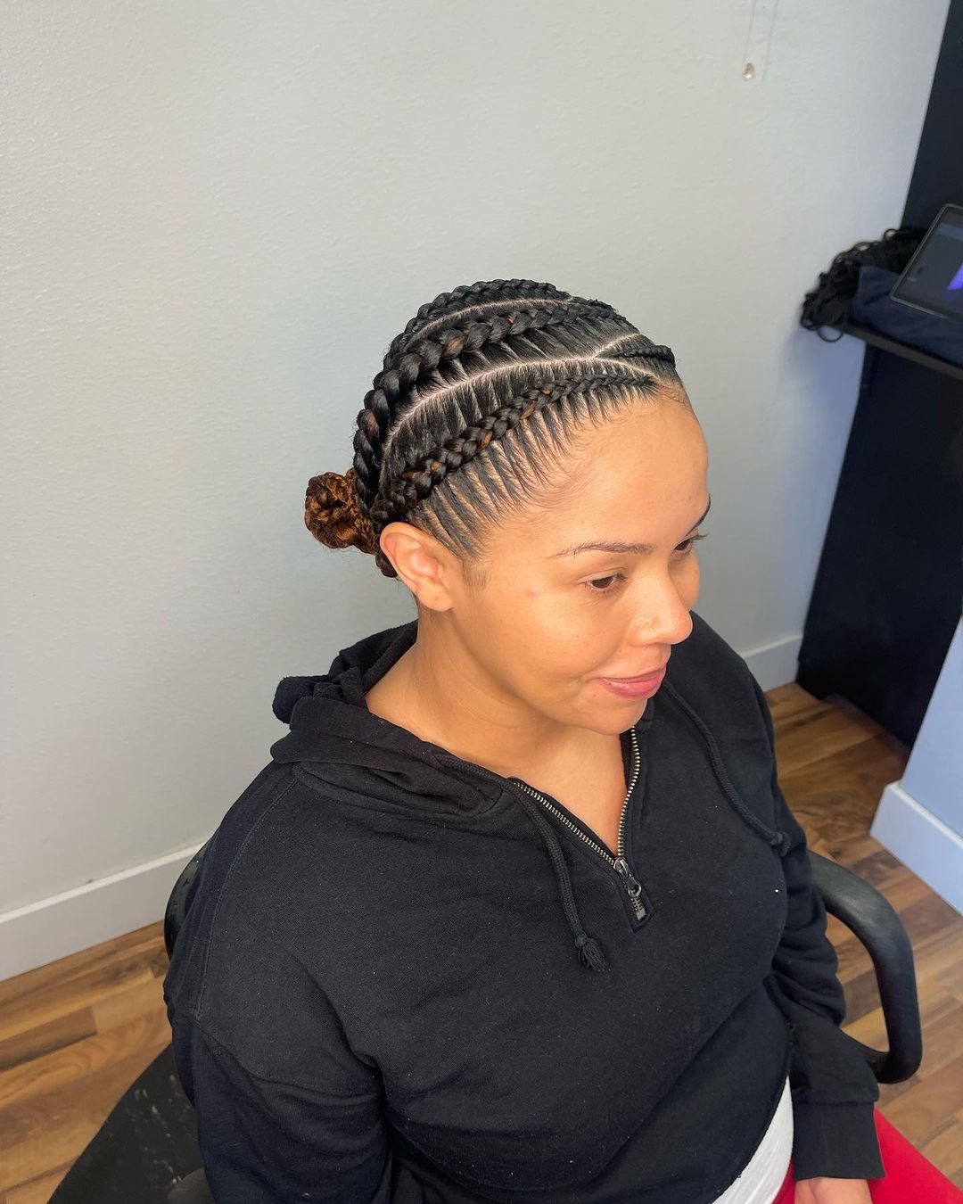 Transform your straight back braids into a regal updo by styling them into a high bun, exuding elegance and sophistication.