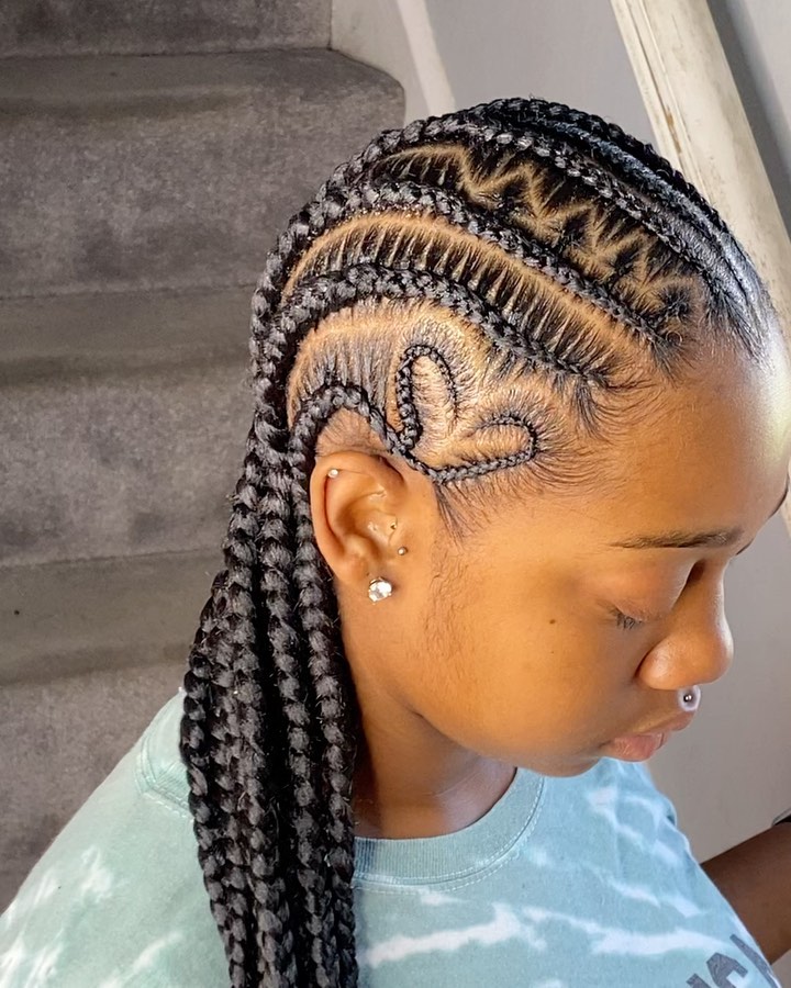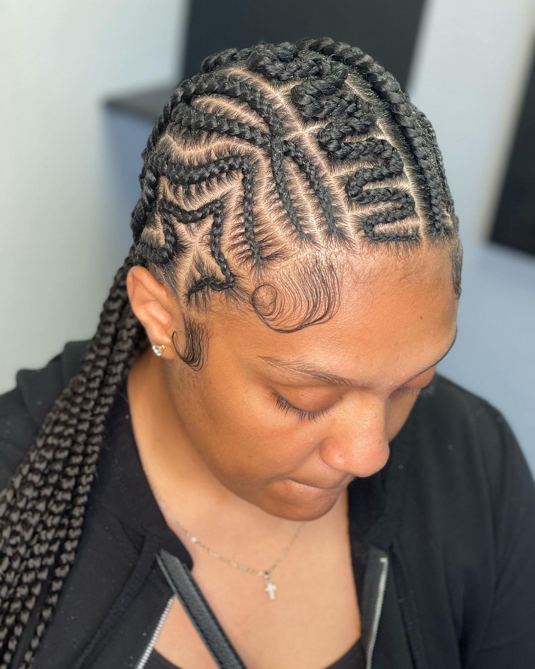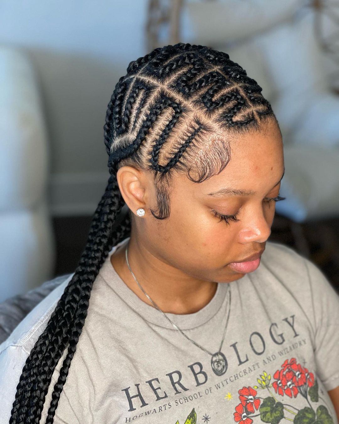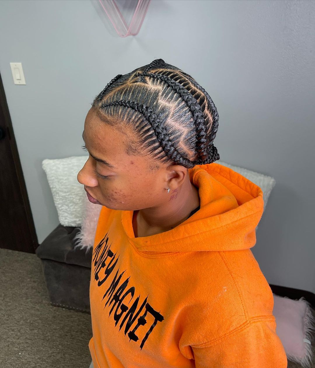 Embrace an artistic and intricate look with geometric patterns in your straight back braids, showcasing precision and attention to detail.