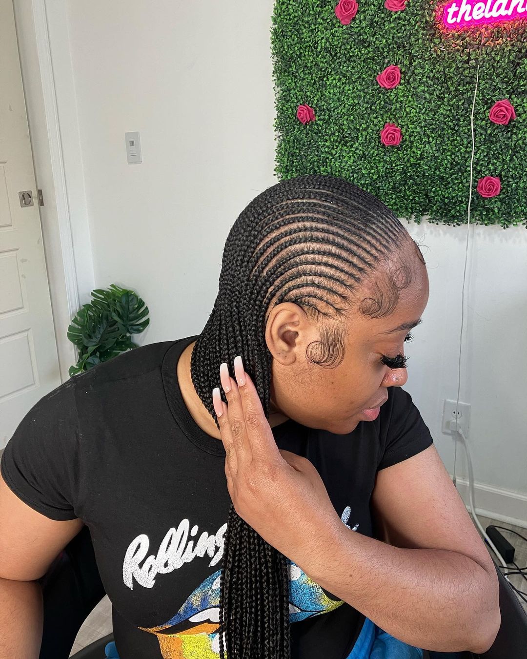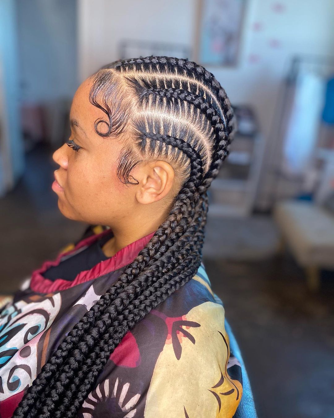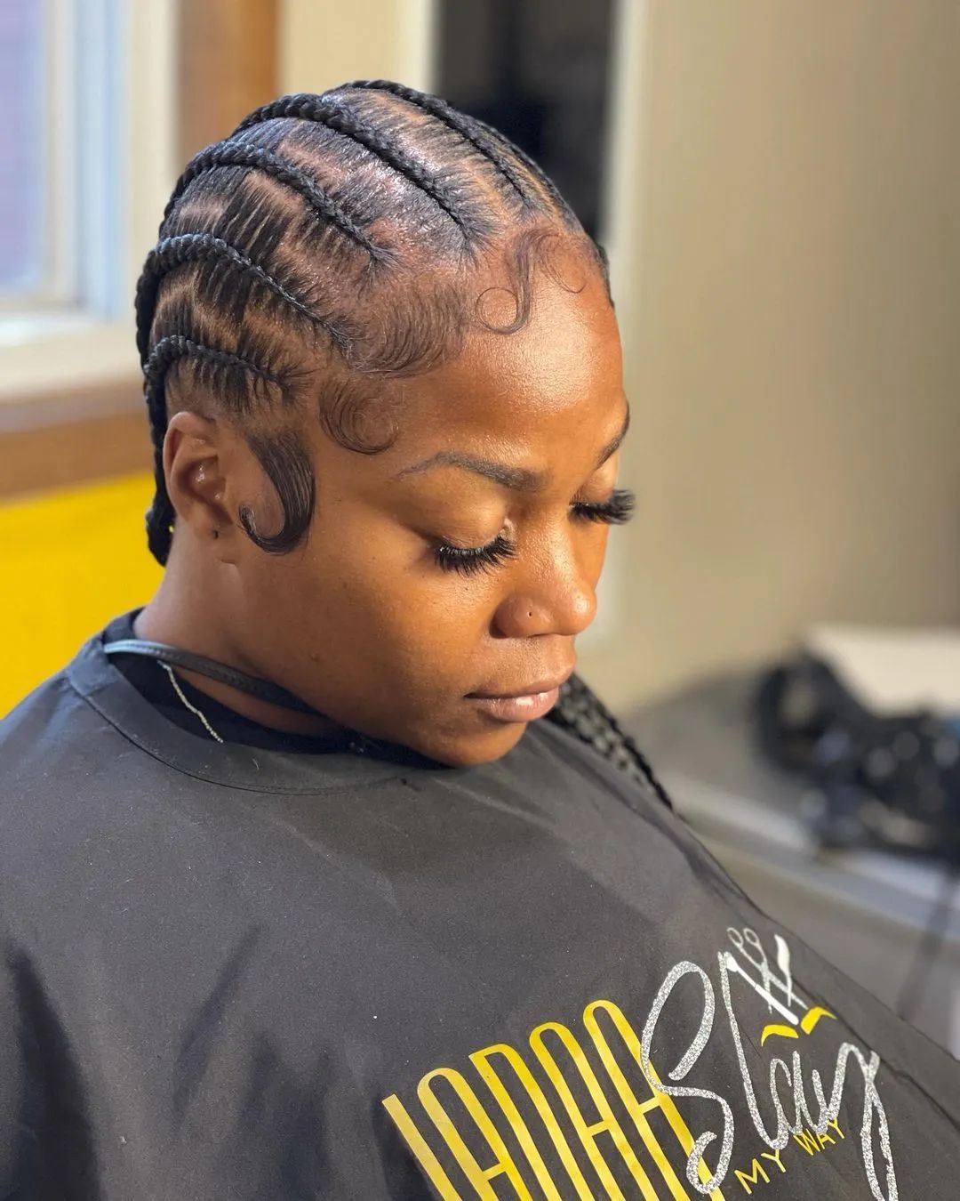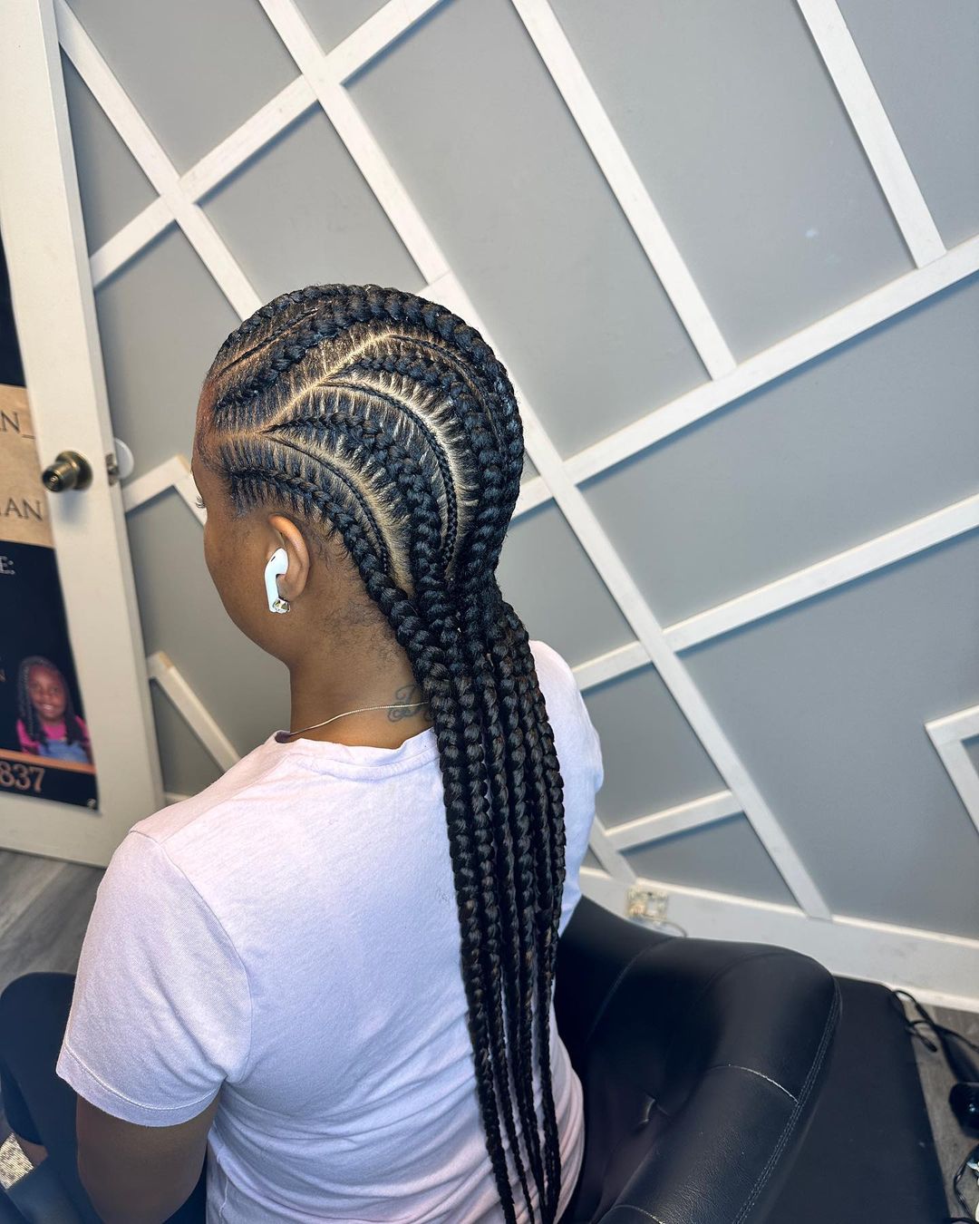 Add a modern edge to your straight back braids by incorporating curved partings, elevating the style with a contemporary touch.