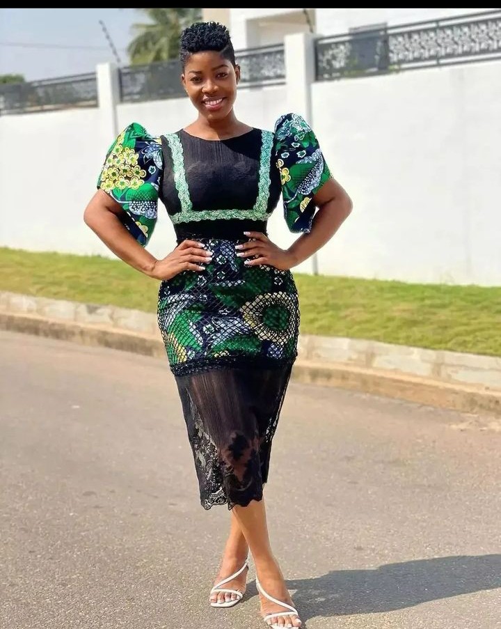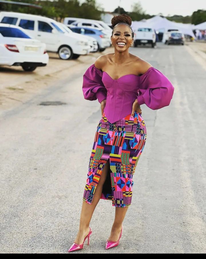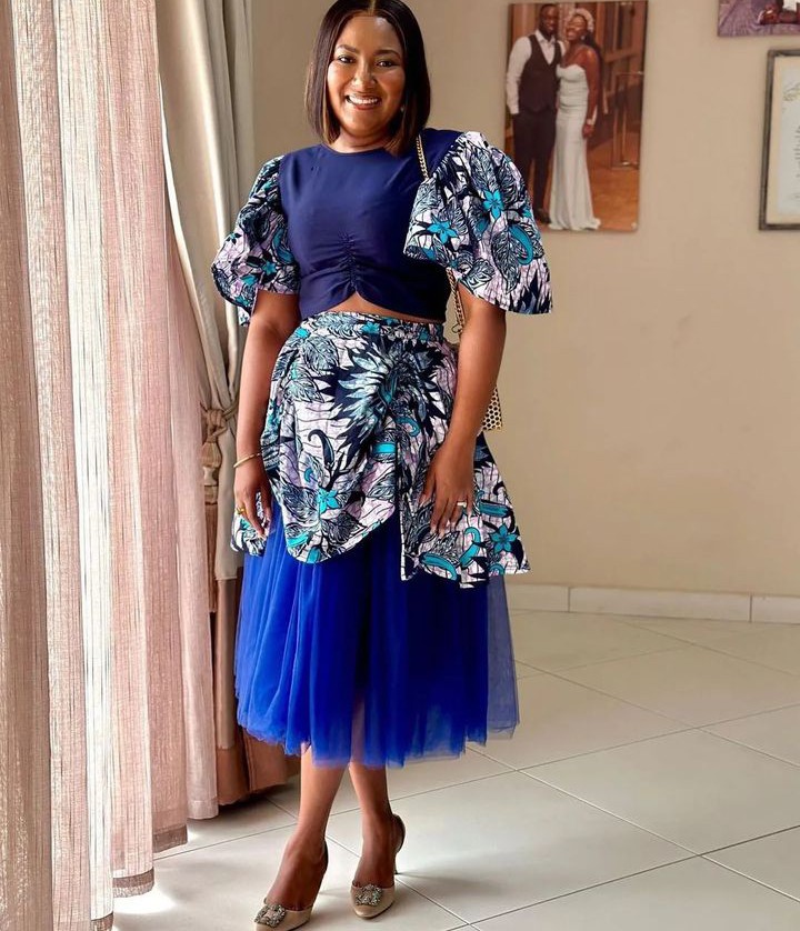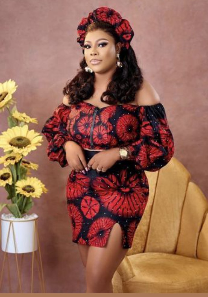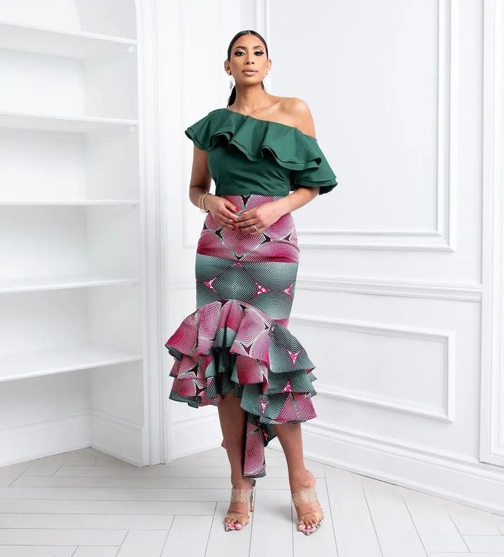 10. Ankara Midi Skirt with Off-Shoulder Top: Achieve an effortlessly classy look with an Ankara midi skirt and an off-shoulder top. The combination is perfect for a brunch date or a daytime event.