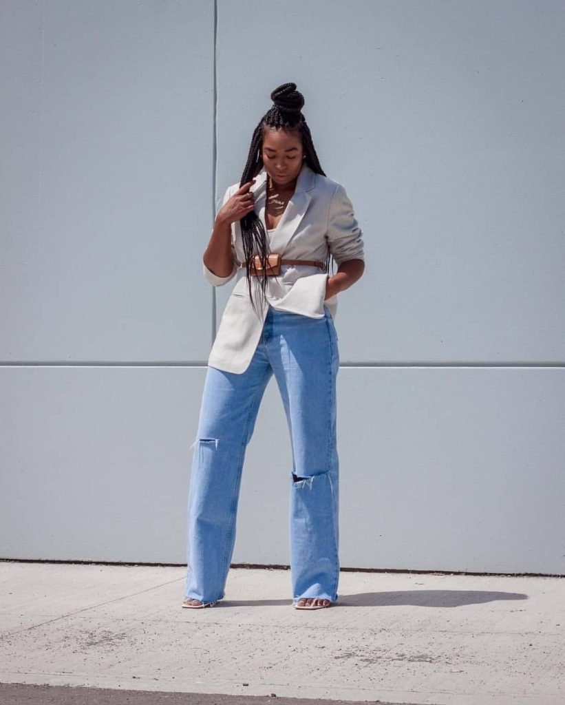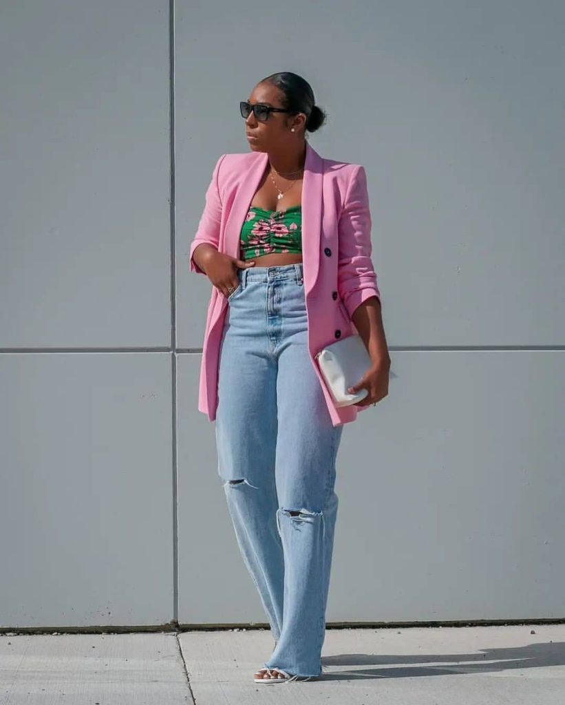 Opt for jean shorts in a classic wash and pair them with a vibrant printed top for a playful and eye-catching outfit. Add colorful sandals, a straw hat, and a statement bag to complete the summer-ready look.