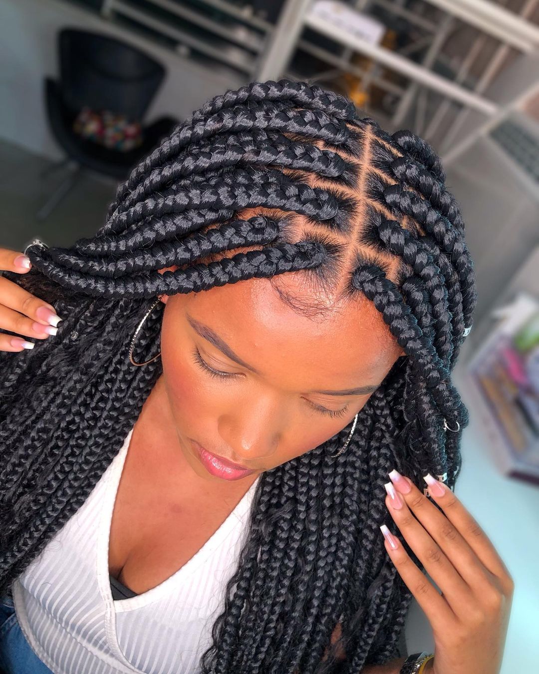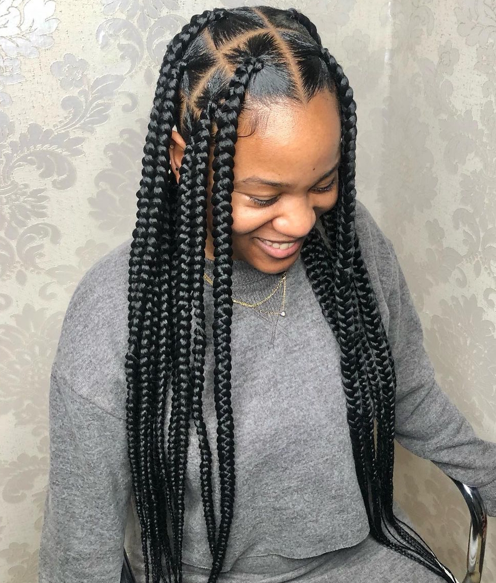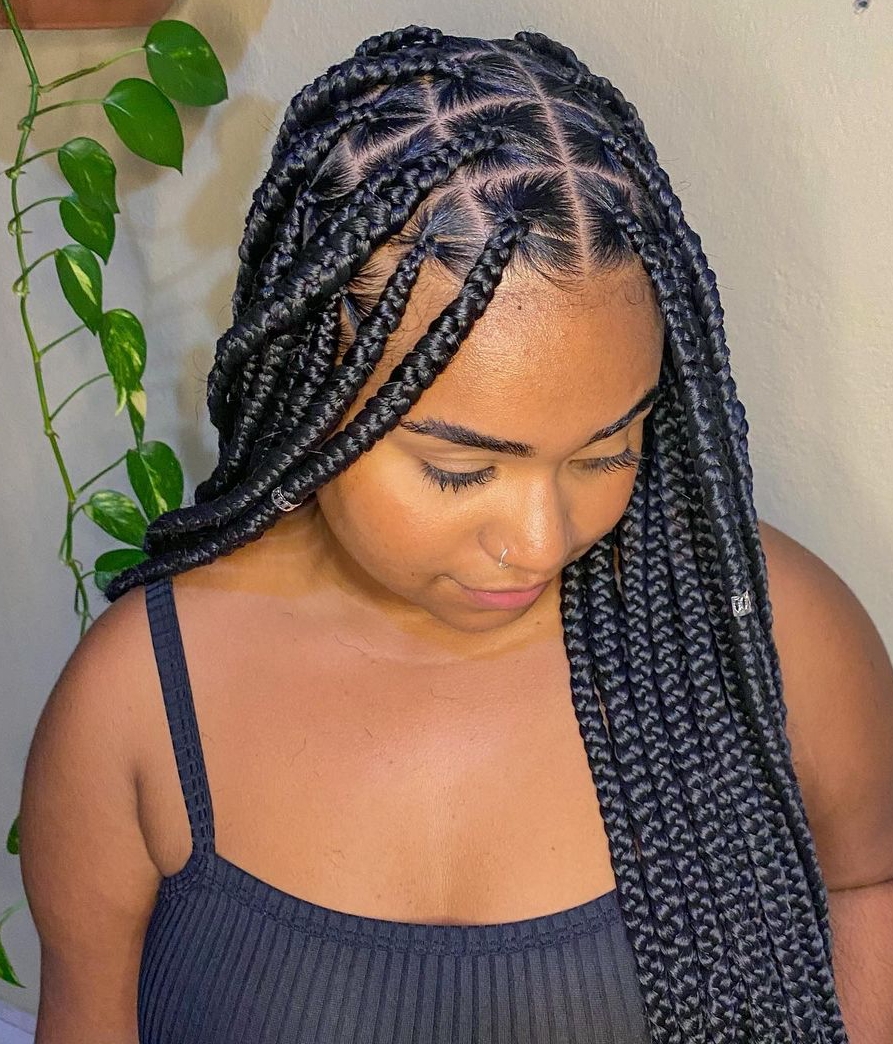 3. Jumbo Braids with Intricate Parting: Elevate your braids with creative parting patterns that add an artistic touch to your hairstyle.