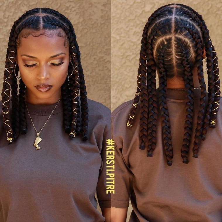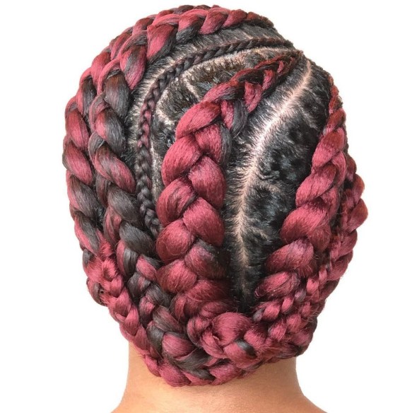 Go big and bold with jumbo Ghana braids styled into a high ponytail. This look exudes confidence and modern allure.