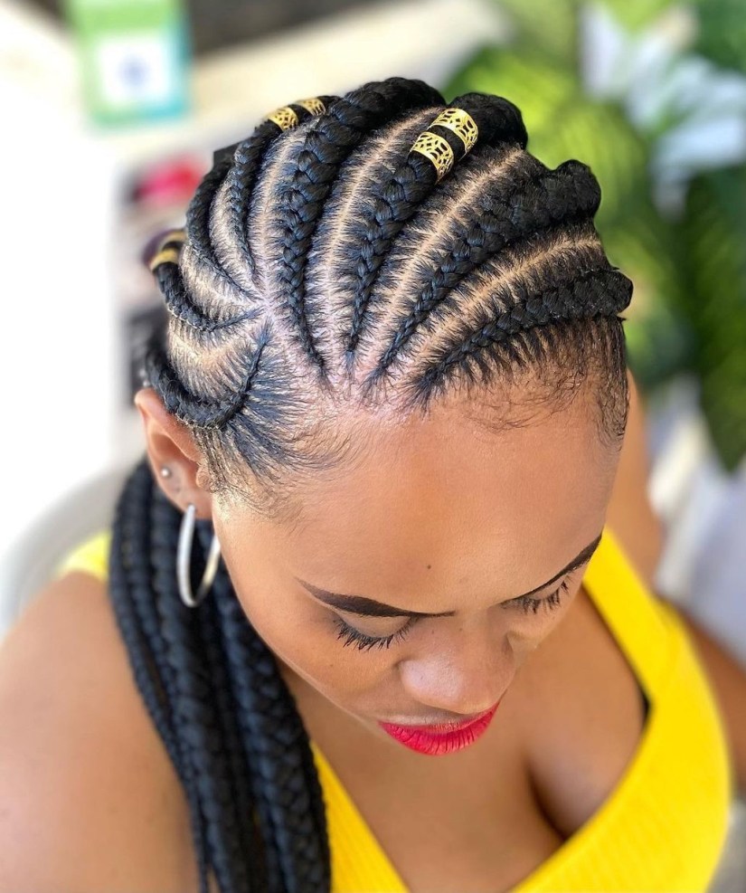 Enhance your look with curved Ghana braids adorned with hair accessories. This fusion of style and elegance is perfect for special occasions.