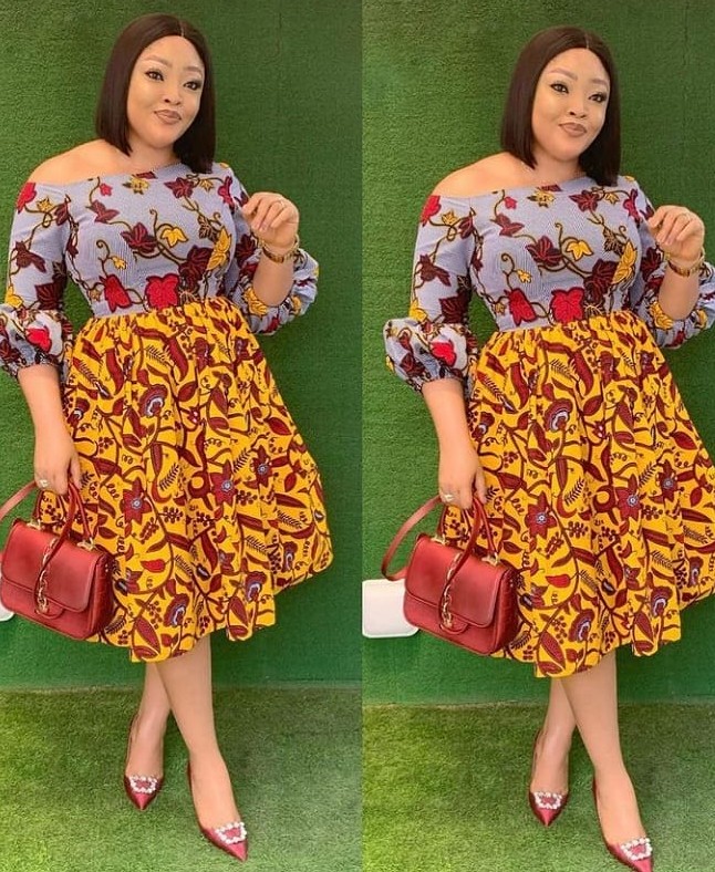 15. Ankara Flared Skirt and Fitted Top: Combine an Ankara flared skirt with a fitted top for a playful yet professional look. Choose solid colors for the top to balance the print.