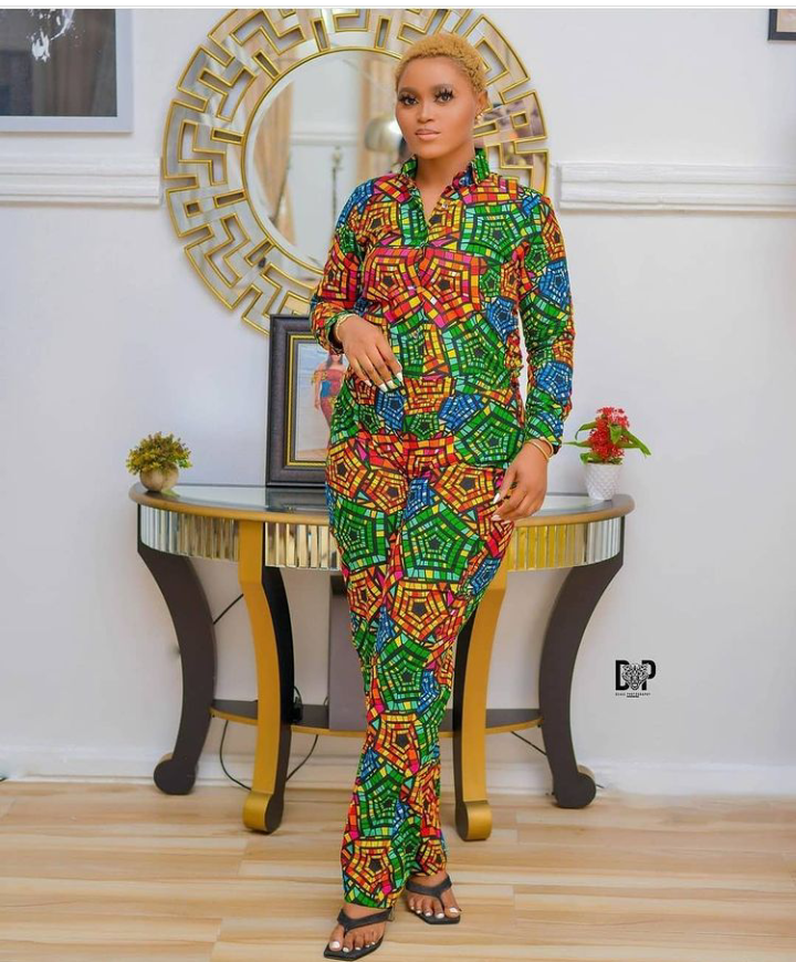 11. Ankara Wide-Leg Pants and Blouse: Combine wide-leg Ankara pants with a matching or complementary print blouse. This creates a chic and fashion-forward office ensemble.