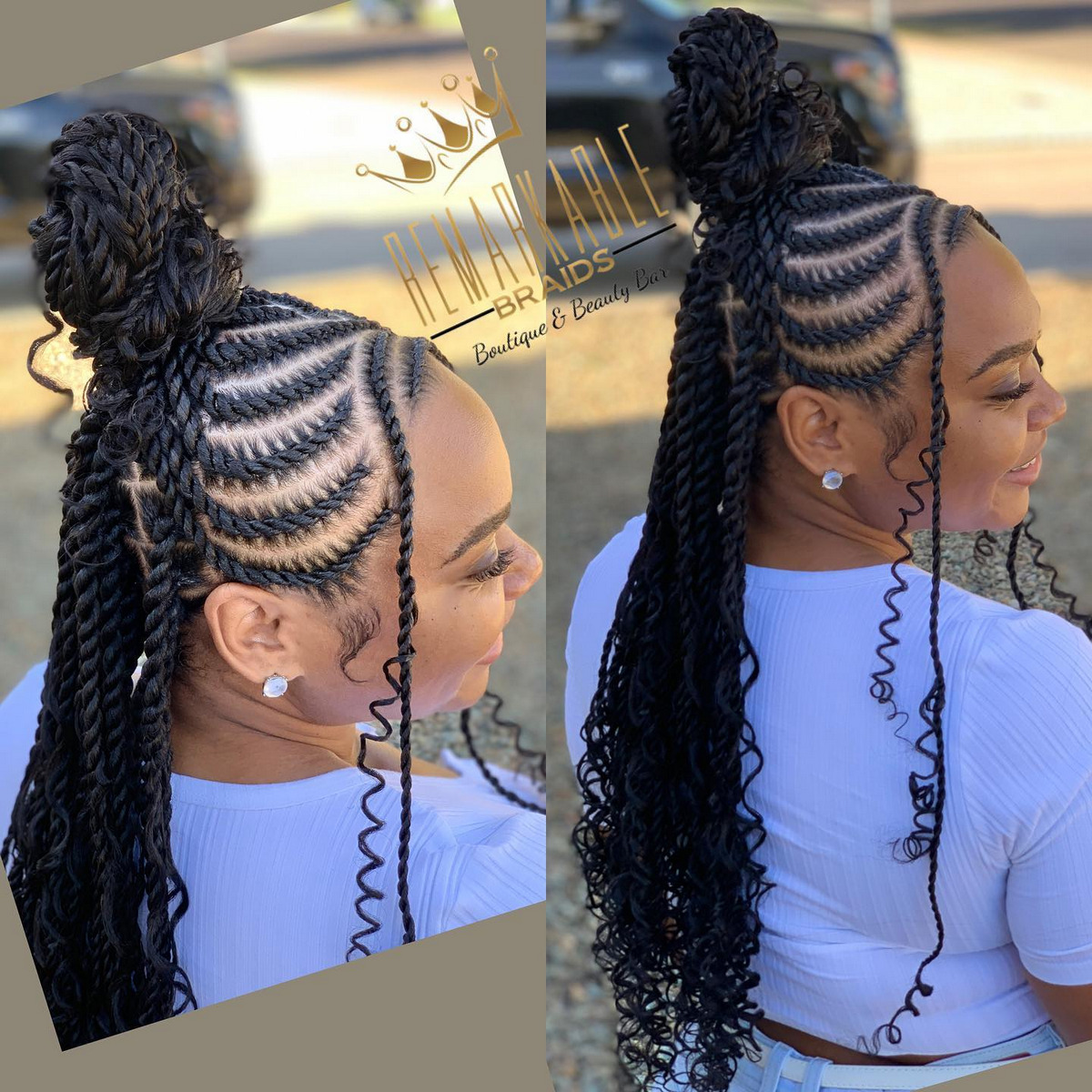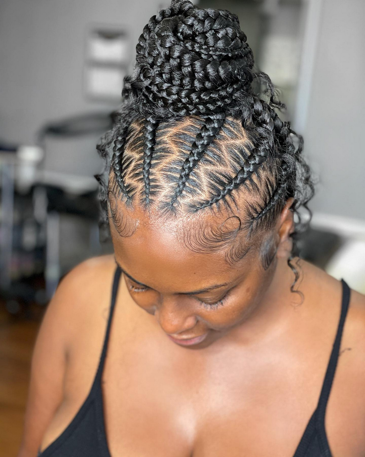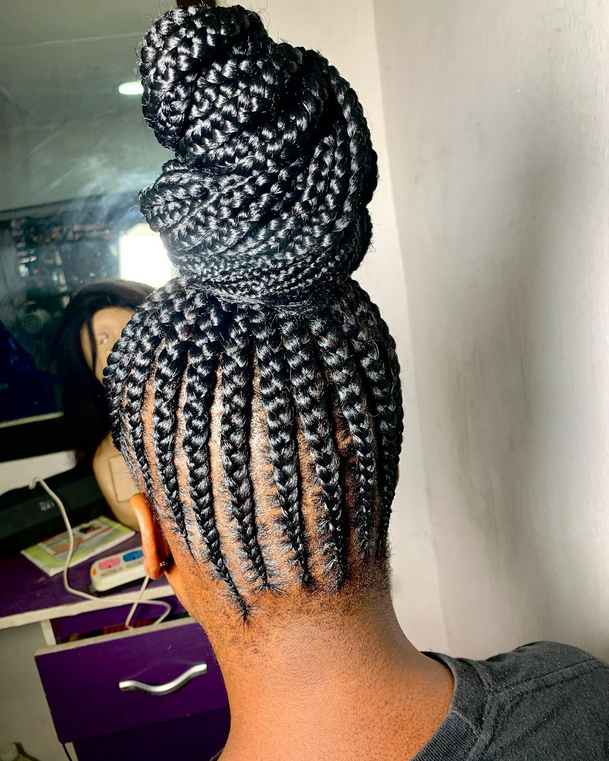 - Ghana Braids Bun: Gather your Ghana braids into a high or low bun for a sophisticated and polished look. You can accessorize the bun with hairpins or beads for added flair.