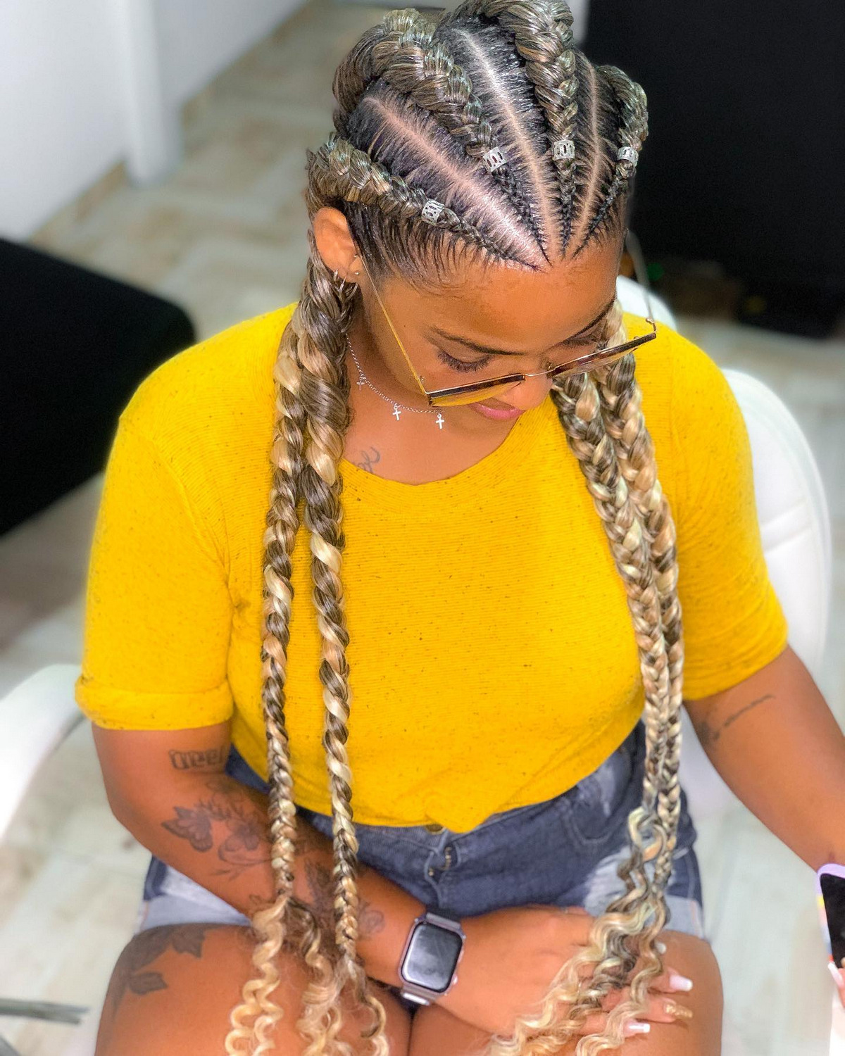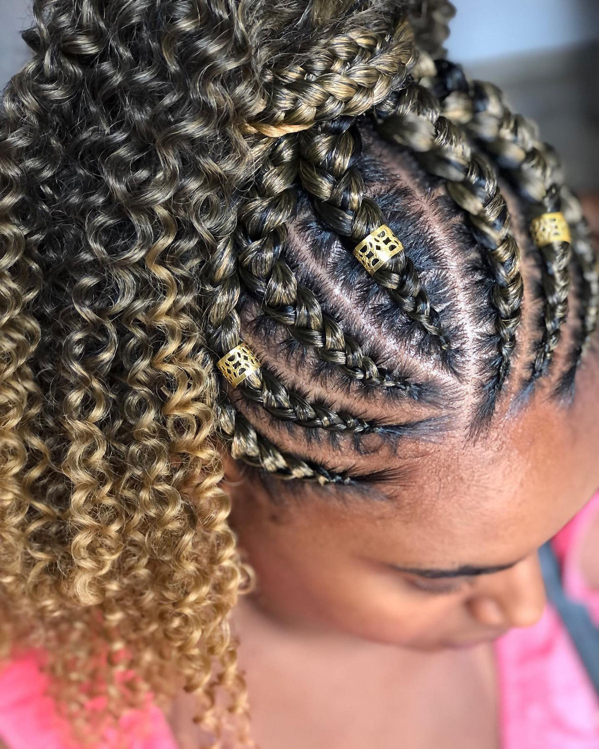 - Ghana Braids with Curly Ends: Experiment with curly extensions at the ends of your Ghana braids to create a unique and dynamic hairstyle. The curls add volume and texture to your look.