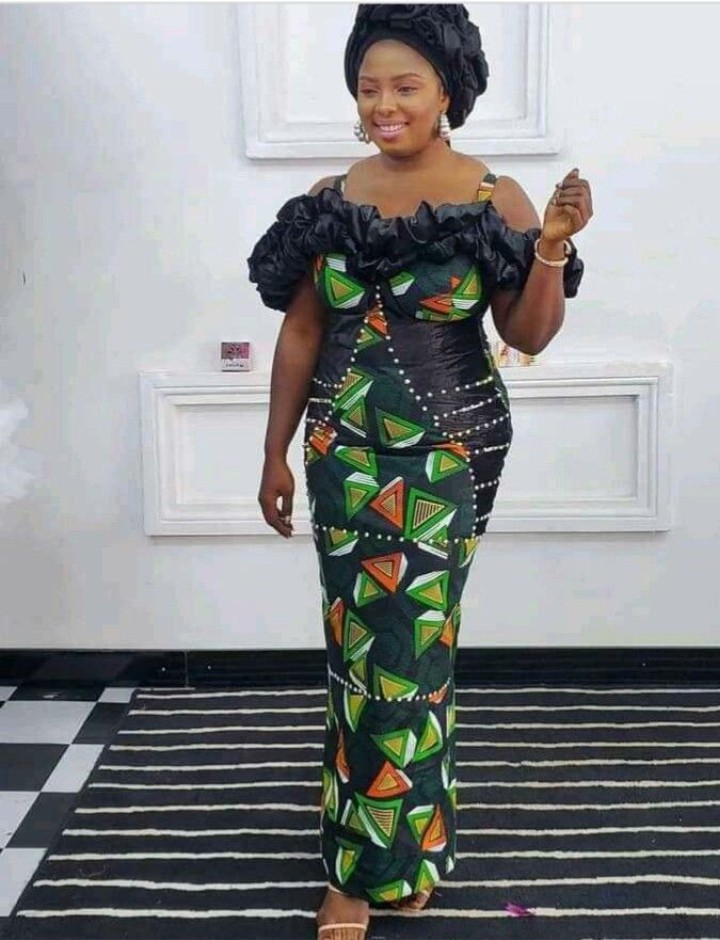 1. Off-Shoulder Ankara Gown: Make a grand entrance with an off-shoulder Ankara gown. The off-shoulder neckline adds a touch of glamour to this already stunning style.